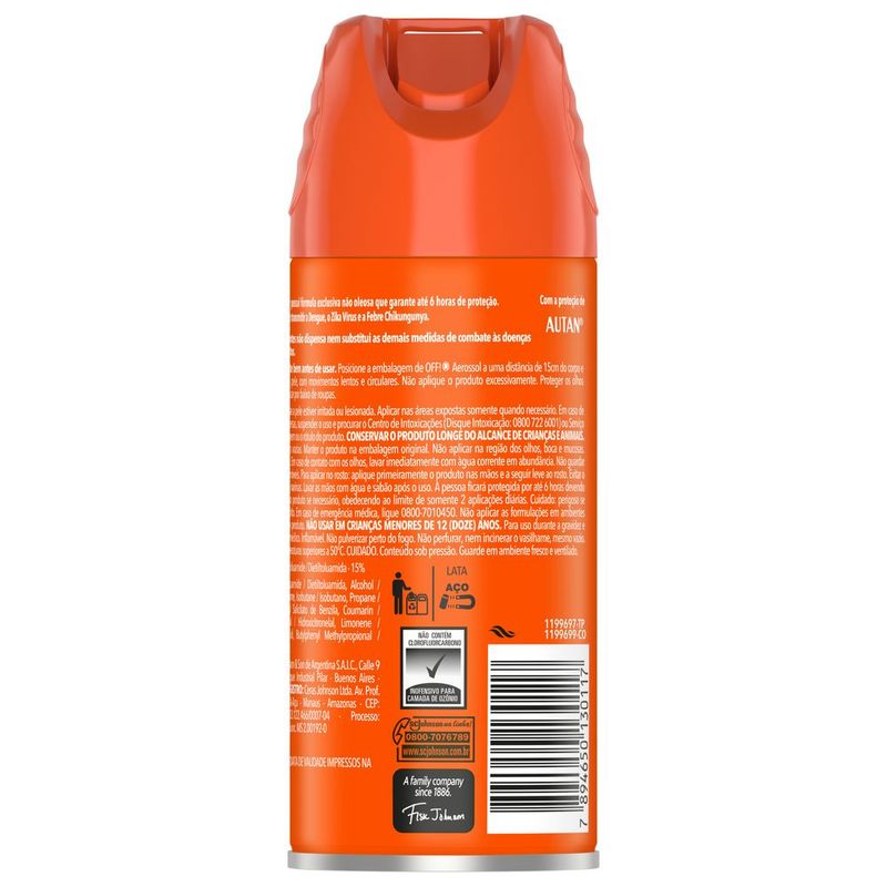 Repelente OFF! Family Aerossol 165ml O que é? O Repelente OFF! Family é um produto essencial para proteção contra insetos. Desenvolvido para toda a família, este repelente aerossol é eficaz na prevenção de picadas de mosquitos e outros insetos, garantindo conforto e segurança em atividades ao ar livre. Para que serve? Proteção contra insetos: Mantém mosquitos e outros insetos afastados, reduzindo o risco de picadas e doenças transmitidas por eles. Uso familiar: Seguro para adultos e crianças a partir de 2 anos, ideal para viagens, passeios e atividades ao ar livre. Como funciona O Repelente OFF! Family utiliza ingredientes ativos que criam uma barreira protetora na pele, mantendo os insetos afastados por até 10 horas. Sua fórmula é eficaz e duradoura, proporcionando proteção prolongada. Como usar Agite bem antes de usar. Aplique uma camada uniforme sobre a pele exposta, evitando o contato com os olhos e mucosas. Reaplique a cada 10 horas ou após nadar, suar intensamente ou secar-se com toalha para manter a proteção. Composição Ingredientes ativos: DEET (N,N-Dietil-m-toluamida), que garante a eficácia na repelência de insetos. Advertências Uso externo. Evite o contato com os olhos; em caso de contato, lave-os abundantemente com água. Não aplicar em feridas abertas ou irritadas. Mantenha fora do alcance de crianças. Suspender o uso em caso de irritação. Benefícios Protege contra picadas de insetos por até 10 horas Ideal para toda a família Fórmula eficaz e segura Ideal para atividades ao ar livre
