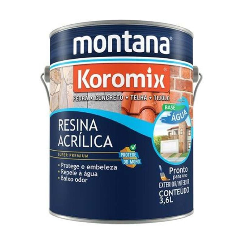 Resina Acrílica Incolor Montana 3,6 Litros - Proteção para Pedra, Concreto, Telha e Tijolo - RESINA ACRÃLICA BASE D'ÃGUA INCOLOR MONTANA 3,6 LITROS - MONTANAProteja e embeleze suas superfÃcies com a Resina AcrÃlica Base D'Ãgua Incolor Montana. Com acabamento brilhante, essa resina é ideal para pedra, concreto, telha e tijolo, tanto em ambientes internos quanto externos. Sua fórmula à base d'água repele a água, protege contra o mofo e possui baixo odor, garantindo um ambiente mais saudável e bonito.Com o Resina AcrÃlica Base D'Ãgua Incolor Montana, suas superfÃcies porosas como telhas, pedras naturais, pedras artificiais, concreto aparente, tijolo cerâmico e pisos de cimento estarão protegidas e renovadas. Além disso, o produto é super premium, garantindo qualidade e durabilidade.- Acabamento brilhante- Base água- Protege e embeleza- Repele a água- Baixo odor- Protege do mofo- Pronto para uso- Para uso em exterior e interior- Rendimento: * 900ml  11m² * 3,6 litros  44m² * 18 litros  220m²Invista na proteção e beleza de suas superfÃcies com a Resina AcrÃlica Base D'Ãgua Incolor Montana 3,6 Litros. Garanta qualidade e durabilidade para seus projetos de reforma e construção.Garantia: Qualidade e durabilidade garantidas pela Montana Universo do Lar. -------- Descrição Original enviada pelo Fornecedor: RESINA ACRILICA BASE D'AGUA INCOLOR MONTANA 3,6 LITROS - MONTANAPEDRA - CONCRETO - TELHA - TIJOLOAcabamento brilhanteBase águaProtege e embelezaRepele a águaBaixo odorProtege do mofoPronto para usoExterior/InteriorSuper PremiumCom tinta ou produtos similares efetue a completa remoçãoPara superfÃcies porosa como telhas (cerâmicas, cimentÃcias e fibrocimento), pedras naturais (pedra Mineira, São Thomé, Goiás, Madeira, Miracema, Ardósia, entre outras), pedras artificiais porosas, concreto aparente, tijolo cerâmico aparente, pisos de cimento, entre outras superfÃciesRendimento:900ml  11m²3,6 litros  44m²18 litros  220m² Características Gerais do Produto: Garantia: • 3 meses