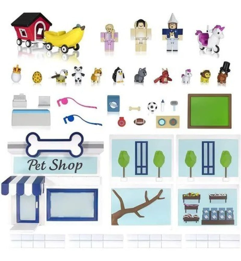 Roblox - Playset Pet Shop Adote-me – 40 peças - Sunny Reviva as suas aventuras Roblox favoritas ou crie a sua própria com este playset com temática do game Adote me de Roblox. Vem com 3 figuras articuladas, 9 pets e diversos acessórios! Misture e combine peças para construir seu próprio personagem Roblox exclusivo e enfeite suas figuras com os acessórios incluídos.Inclui um código virtual para resgatar item exclusivo no game Idade acima de 6 anos Contem 40 peças Tamanho da embalagem 48 x 38 x 10 cm Fabricante Sunny