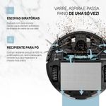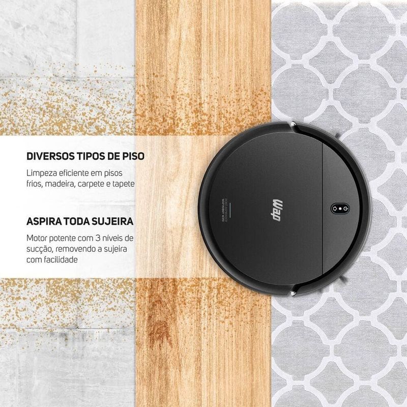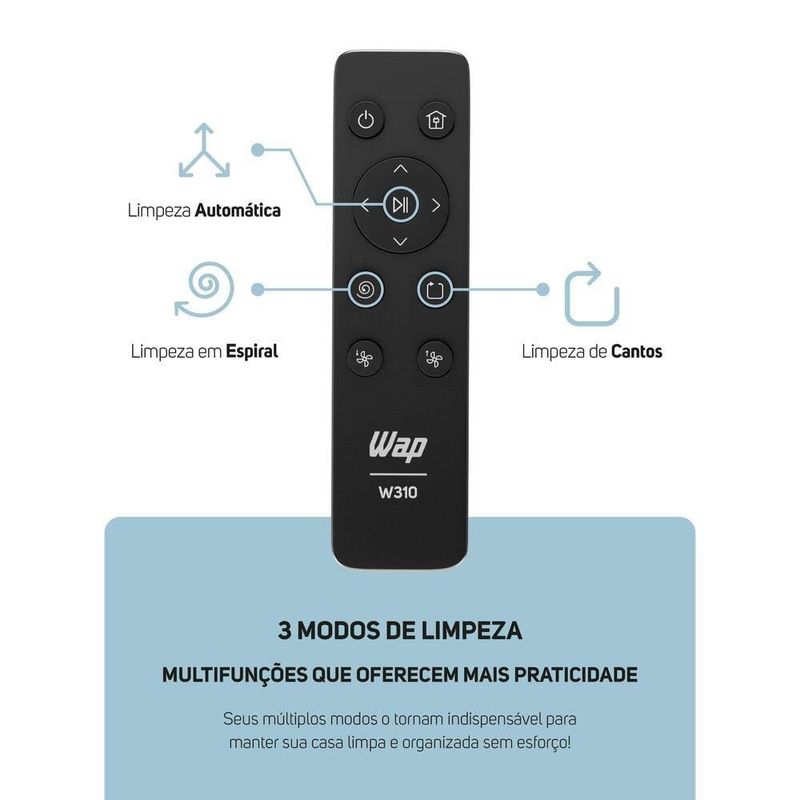 Otimize a limpeza da sua casa com o Robô Aspirador ROBOT W310 da Wap, o aliado perfeito para quem busca praticidade e eficiência. Com função 3 em 1, ele varre, aspira e passa pano ao mesmo tempo, mantendo os ambientes sempre limpos sem esforço. Com o controle remoto incluso, você gerencia os modos de limpeza com facilidade: automático, cantos e espiral. Além disso, o robô oferece três níveis de sucção — baixo, médio e alto — para lidar desde a poeira leve até a sujeira mais pesada. O WAP ROBOT W310 é inteligente: retorna sozinho à base carregadora quando a bateria está baixa ou ao fim da limpeza. Sua autonomia de até 2h10 por carga garante uma higienização completa sem interrupções. Equipado com sensores antiqueda e de impacto, o robô evita obstáculos e escadas, proporcionando uma navegação segura e eficiente. Suas duas escovas giratórias, escova central e reservatório de 420ml oferecem alto desempenho em ambientes grandes ou com muitos resíduos. O MOP de microfibra deixa o piso brilhando após a limpeza, removendo poeira fina e sujeiras persistentes. As rodas emborrachadas com amortecimento permitem que o robô suba e desça tapetes, limpando carpetes, pisos frios e madeira com facilidade. Com design slim, o aspirador alcança áreas difíceis como embaixo de camas, sofás e móveis. Ideal para quem tem pets, ele aspira cabelos e pelos com eficiência, tornando a rotina de limpeza mais prática e tecnológica. Que tal aproveitar e completar sua área de serviço com um vaporizador para lhe ajudar em todos os momentos? Aproveite!