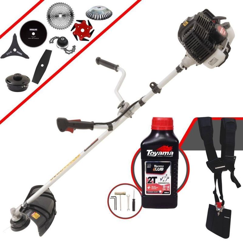 Roçadeira Kawashima Kw43le à Gasolina 43cc 1,7hp + Faca 2p + Faca 40d + Faca 80d + Faca 6p + Escova 38c + Trimmer + óleRoçadeira Profissional Kawashima KW43-LE À Gasolina 2T 43cc 1,7HP Com Lâmina 3 Pontas + Faca 2 Pontas + Faca 40 Dentes + Faca 80 Dentes + Faca 6 Pontas + Escova Rotativa 38 Cerdas + Trimmer + Óleo TOYAMA LUB FG50 500ml 2TATENÇÃO: A ROÇADEIRA É DA MARCA KAWASHIMA E ACOMPANHA UM Óleo 2T DA MARCA TOYAMA- MARCA KAWASHIMA - A ROÇADEIRA MAIS VENDIDA DO BRASIL- ROÇADEIRA POTENTE E ECONÔMICA- ALTA ROTAÇÃO E PERFORMANCE COM ECONOMIA- ASSISTÊNCIA TÉCNICA EM TODO TERRITÓRIO NACIONAL- PRODUTO COM 6 MESES DE GARANTIA- PEÇAS DE REPOSIÇÃO DE FÁCIL ACESSO- JÁ VEM MONTADA EM CAIXA ÚNICA PRONTA PARA O USO- EQUIPE DE PÓS-VENDAS A DISPOSIÇÃO- Óleo 2T TOYAMA LUB FG50 JASO FC Semissintético (50:1) - OBSERVE A INSTRUÇÃO DE MISTURA:Operador, instrução de mistura recomendada para a utilização da máquina com o Óleo 2T TOYAMA LUB (1:50) 500ml : Observe sempre a proporção da mistura específica deste Óleo, onde para cada 1 Litro de Gasolina utilizar 20ml do Óleo TOYAMA, ou para cada 500ml de Gasolina utilizar 10ml do Óleo TOYAMA. Além de manter o bom funcionamento, você pode prevenir futuras falhas e excesso de fumaça no cilindro de combustãA Roçadeira Kawashima KW43LE conta com motor 2 tempos à gasolina, 43 cilindradas e potência de 1,7HP. Projetada para facilitar o trabalho de roçada de capim, arbustos, pastagens, controle de pastos, trabalhos de jardinagem, limpeza e manutenção de grandes áreas verdes com sua utilização em sítios; fazendas e chácaras. Ideal também para manutenção e limpeza de vias públicas e rodovias.ESPECIFICAÇÕES TÉCNICAS:-Modelo: KW43-LE-Marca: Kawashima-Tipo: Lateral, com guidão-Diâmetro da haste: 28mm-Eixo cardã (diâmetro x estria): 8 x 9-Motor: Kawashima M-4300E-Tipo do motor: 2 tempos, gasolina-Cilindradas: 43cc-Potência: 1,7HP-Tipo do carburador: Diafragma, com regulagem-Combustível: Gasolina e Óleo 2T (25:1)-Capacidade do tanque de combustível: 1,10L-Peso: 8,5kg-Diâmetro de encaixe da lâmina: 1'' (25,4mm)EXTRA: LÂMINA 2 PONTASÉ uma Faca Multiuso de 2 pontas que pode ser aplicada para diferentes trabalhos, possui material reforçado que é ideal para trabalhos pesados, podendo cortar os seguintes capins: Capim Grosso, Capim Elefante, Guanxuma, Annoni, Vassourinha, Capim Napier, Capim Sapê e entre outras variantes de capins.ESPECIFICAÇÕES TÉCNICAS:- Tipo de Lâmina: Facão- Quantidade de Pontas: 2- Diâmetro: 330mm- Furo: 25mm Com Redutor Para 20mm- Espessura: 2,7mmEXTRA: DISCO DE CORTE 40 DENTES VIDEAPode ser aplicado para diferentes trabalhos, tendo em vista que pode serrar madeiras até 10cm, dentre elas esse modelo corta: Arbustos, Pequenas Árvores, Capim Grosso, Capim Elefante, Capim Guanxuma, Capim Annoni, Vassourinha, Bambu, Cana de Açúcar, Mato Alto, Capim Napier, Capim Sapê, Touceiras entre outros.ESPECIFICAÇÕES TÉCNICAS:- Tipo de Lâmina: Circular Vídea- Quantidade de Dentes: 40- Diâmetro: 255mm- Furo: 25mm (1'') Com Anel Redutor Para 20mm- Espessura: 2mmEXTRA: DISCO DE CORTE 80 DENTESÉ um disco multiuso pois pode ser aplicado para diferentes trabalhos, tendo em vista que pode serrar madeiras até 10cm, dentre elas esse modelo corta: Arbustos, Pequenas Árvores, Capim Grosso, Capim Elefante, Capim Guanxuma, Capim Annoni, Vassourinha, Bambu, Cana de Açúcar , Mato Alto, Capim Napier, Capim Sapê, Touceiras entre outros.ESPECIFICAÇÕES TÉCNICAS:- Tipo de Lâmina: Circular- Quantidade de Dentes: 80- Diâmetro: 255mm- Furo: 25mm Com Redutor Para 20mm- Espessura: 1,5mmEXTRA: Lâminia 6 Pontas Terra:ESPECIFICAÇÕES TÉCNICAS:Dados Técnicos:- Diâmetro: 250mm- Furo: 25mm- Espessura: 0,5mm- Material: Lâminas de metalEXTRA: ESCOVA DE AÇO ROTATIVA 200MMA Escova pode ser aplicada para diferentes trabalhos, dentre elas: Limpeza de Pavers, Limpeza de Calçadas, Limpeza de concreto, Limpeza de Pavimentos, Remoção de musgos e Remoção de ervas daninhasESPECIFICAÇÕES TÉCNICAS:- Tipo de Escova: Rotativa com cerdas em aço- Quantidade de Cerdas: 38- Diâmetro: 200mm- Furo: 25mm Com Redutor Para 20mm- Espessura: 50mmEXTRA: Trimmer Com Corrente de Motosserra:Dados Técnicos:- Diâmetro: 330mm- Furo: 25mm- Espessura: 60mm- Material: Lâminas corrente de motosserraITENS INCLUSOS:-01: Lâmina 2 Pontas;-01: Lâmina 3 Pontas;- 01: Lâmina 6 pontas-01: Lâmina 40 Dentes;-01: Lâmina 80 Dentes;-01: Escova rotativa 38 cerdas;- 01: Trimmer-01: Óleo Toyama FG50 500ml 2T-01: Carretel de fio de nylon;-01: Cinto de sustentação duplo;-01: Misturador de combustível;-01: Kit de ferramentas;-01: Manual de Instruções; Marca: Kawashima | Com sistema antivibração: Não | Selo SEC: N/A | Modelo: VAR02KW43LE24080638TOT | Motivo de GTIN vazio: O produto é um kit ou pack | Capacidade do tanque de Óleo: N/A | Fonte do produto: N/A | Tipo de guiador: Aberto | Com regulação de guiador: Sim | Sistema de partida: Manual | Comprimento total: 188cm | Com guarda de segurança: Sim | Capacidade do tanque de combustível: 1,1L | MPN: 84678900 | Diâmetro de corte do disco de corte: 255mm | Largura total: 50cm | Tempos do motor: 2 | Eixo de transmissão: Rígido | Peso: 12Kg | Tipos de máquinas: Roçadeira | Cilindrada: 43cc | Tipo de eixo da máquina: Reto | Diâmetro de corte da tanza: 255mm | Sistemas de corte: Lâmina e Fio de Nylon | SKU: VAR02KW43LE24080638TOT | Acessórios incluídos: Lâmina, Carretel de Nylon, Cinto de Sustentação, MIsturador de Combustível e Kit de Chaves | Condição do item: Novo | Código universal de produto: 0703363309352 | É kit: Sim | Potência do motor: 1,7HP