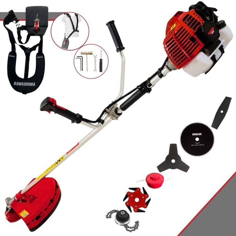 Roçadeira Profissional Kawashima Kw43l à Gasolina 43c 1,7hp + Faca 2 Pontas Duraline + Faca 80 Dentes Duraline + TrimmeRoçadeira Profissional Lateral Kawashima KW43-L À Gasolina 2T 43cc 1,7HP Com Lâmina 3 Pontas + Faca 2 Pontas 330mm + Faca 80 Dentes 255mm + Trimmer + Faca 6 Pontas 250mmMARCA KAWASHIMA - A ROÇADEIRA MAIS VENDIDA DO BRASIL- ROÇADEIRA POTENTE E ECONÔMICA- ALTA ROTAÇÃO E PERFORMANCE COM ECONOMIA- ASSISTÊNCIA TÉCNICA EM TODO TERRITÓRIO NACIONAL- PRODUTO COM 6 MESES DE GARANTIA- PEÇAS DE REPOSIÇÃO DE FÁCIL ACESSO- EQUIPE DE PÓS-VENDAS A DISPOSIÇÃOA Roçadeira Kawashima KW43L conta com motor 2 tempos à gasolina, 43 cilindradas e potência de 1,7HP. Projetada para facilitar o trabalho de roçada de capim, arbustos, pastagens, controle de pastos, trabalhos de jardinagem, limpeza e manutenção de grandes áreas verdes com sua utilização em sítios; fazendas e chácaras. Ideal também para manutenção e limpeza de vias públicas e rodovias. Desenvolvida com uma estrutura resistente e suporte do guidão reforçado, seus componentes possuem alta durabilidade. A vantagem da roçadeira é que pode ser usada em locais irregulares, morros, buracos, florestas, entre outro com dificuldade de acesso.ESPECIFICAÇÕES TÉCNICAS:-Modelo: KW43L-Marca: Kawashima-Tipo: Lateral, com guidão-Diâmetro da haste: 28mm-Eixo cardã (diâmetro x estria): 8x9-Motor: Kawashima M-4300-Tipo do motor: 2 tempos, gasolina-Cilindradas: 43cc-Potência: 1,7HP-Tipo do carburador: Diafragma, com regulagem-Combustível: Gasolina e Óleo 2T (25:1)-Capacidade do tanque de combustível: 1,10L-Peso: 8,5kg-Diâmetro de encaixe da lâmina: 1'' (25,4mm)EXTRA: LÂMINA 2 PONTAS - Tamanho: 330MM Furo: 25,4 MM (1) / 20MM Espessura 2,70MMESPECIFICAÇÕES TÉCNICAS:- Tipo de Lâmina: Facão- Quantidade de Pontas: 2- Diâmetro: 330mm- Furo: 25mm Com Redutor Para 20mm- Espessura: 2,7mmEXTRA: DISCO DE CORTE 80 DENTES - DIÂM. 255MM X 25,4 MM (1) + Anel Redutor Para 20MM; Espessura 1,5MMO DISCO DE CORTE 80 Dentes acompanha um anel de redução que pode ser utiizada para roçadeiras de furo 20mm ou 25mm, sendo feita em aço cromo vanádio que garante mais segurança, desempenho e durabilidade. É uma lâmina balanceada, fazendo com que haja menor vibração, corte contínuo e suave, com mais conforto ao operador e mais longevidade para a roçadeira. Possui maior rendimento no trabalho e não precisa ser afiada antes do uso. É um disco multiuso pois pode ser aplicado para diferentes trabalhos, tendo em vista que pode serrar madeiras até 10cm, dentre elas esse modelo corta: Arbustos, Pequenas Árvores, Capim Grosso, Capim Elefante, Capim Guanxuma, Capim Annoni, Vassourinha, Bambu, Cana de Açúcar , Mato Alto, Capim Napier, Capim Sapê, Touceiras entre outros.ESPECIFICAÇÕES TÉCNICAS:- Tipo de Lâmina: Circular- Quantidade de Dentes: 80- Diâmetro: 255mm- Furo: 25mm Com Redutor Para 20mm- Espessura: 1,5mmEXTRA: Trimmer Com Corrente de Motosserra:Dados Técnicos:- Diâmetro: 330mm- Furo: 25mm- Espessura: 60mm- Material: Lâminas corrente de motosserraEXTRA: Lâminia 6 Pontas Terra:ESPECIFICAÇÕES TÉCNICAS:Dados Técnicos:- Diâmetro: 250mm- Furo: 25mm- Espessura: 0,5mm- Material: Lâminas de metalITENS INCLUSOS:-01: Lâmina 2 Pontas;-01: Lâmina 3 Pontas;- 01: Lâmina 6 pontas-01: Lâmina 80 Dentes;- 01: Trimmer-01: Carretel de fio de nylon;-01: Cinto de sustentação duplo almofadado;-01: Misturador de combustível;-01: Kit de ferramentas;-01: Manual de Instruções; Marca: Kawashima | Com sistema antivibração: Não | Selo SEC: N/A | Modelo: VAR05KW43L2P80DTM6P | Motivo de GTIN vazio: O produto é um kit ou pack | Capacidade do tanque de Óleo: N/A | Fonte do produto: N/A | Tipo de guiador: Aberto | Com regulação de guiador: Sim | Sistema de partida: Manual | Comprimento total: 188cm | Com guarda de segurança: Sim | Capacidade do tanque de combustível: 1,1L | Diâmetro de corte do disco de corte: 255mm | Largura total: 50cm | Tempos do motor: 2 | Eixo de transmissão: Rígido | Peso: 10kg | Tipos de máquinas: Roçadeira | Cilindrada: 43cc | Tipo de eixo da máquina: Reto | Diâmetro de corte da tanza: 255mm | Sistemas de corte: Lâmina e Nylon | Acessórios incluídos: Faca, Carretel de Nylon, Cinto, Misturador de Combustível, Kit de Chaves | Condição do item: Novo | Código universal de produto: 0703363307570 | É kit: Sim | MPN: 84678900 | Potência do motor: 1,7HP | SKU: VAR05KW43L2P80DTM6P
