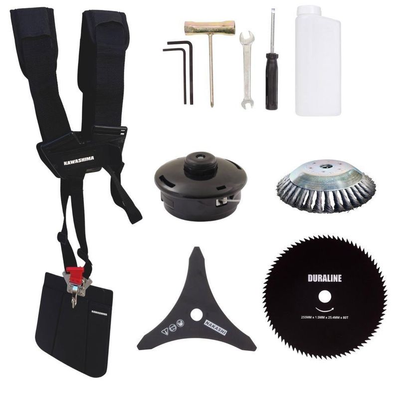 Roçadeira Profissional Lateral Kawashima Kw43le à Gasolina 43cc 1,7hp + Faca 80 Dentes Duraline 255mm 1,5mm + Escova RoRoçadeira Profissional Kawashima KW43-LE À Gasolina 2T 43cc 1,7HP Com Lâmina 3 Pontas + Faca 80 Dentes 255mm 1,5mm + Escova Rotativa 38 Cerdas 200mm- MARCA KAWASHIMA - A ROÇADEIRA MAIS VENDIDA DO BRASIL- ROÇADEIRA POTENTE E ECONÔMICA- ALTA ROTAÇÃO E PERFORMANCE COM ECONOMIA- ASSISTÊNCIA TÉCNICA EM TODO TERRITÓRIO NACIONAL- PRODUTO COM 6 MESES DE GARANTIA- PEÇAS DE REPOSIÇÃO DE FÁCIL ACESSO- JÁ VEM MONTADA EM CAIXA ÚNICA PRONTA PARA O USO- EQUIPE DE PÓS-VENDAS A DISPOSIÇÃOA Roçadeira Kawashima KW43LE conta com motor 2 tempos à gasolina, 43 cilindradas e potência de 1,7HP. Projetada para facilitar o trabalho de roçada de capim, arbustos, pastagens, controle de pastos, trabalhos de jardinagem, limpeza e manutenção de grandes áreas verdes com sua utilização em sítios; fazendas e chácaras. Ideal também para manutenção e limpeza de vias públicas e rodovias.ESPECIFICAÇÕES TÉCNICAS:-Modelo: KW43-LE-Marca: Kawashima-Tipo: Lateral, com guidão-Diâmetro da haste: 28mm-Eixo cardã (diâmetro x estria): 8 x 9-Motor: Kawashima M-4300E-Tipo do motor: 2 tempos, gasolina-Cilindradas: 43cc-Potência: 1,7HP-Tipo do carburador: Diafragma, com regulagem-Combustível: Gasolina e Óleo 2T (25:1)-Capacidade do tanque de combustível: 1,10L-Peso: 8,5kg-Diâmetro de encaixe da lâmina: 1'' (25,4mm)EXTRA: DISCO DE CORTE 80 DENTESÉ um disco multiuso pois pode ser aplicado para diferentes trabalhos, tendo em vista que pode serrar madeiras até 10cm, dentre elas esse modelo corta: Arbustos, Pequenas Árvores, Capim Grosso, Capim Elefante, Capim Guanxuma, Capim Annoni, Vassourinha, Bambu, Cana de Açúcar , Mato Alto, Capim Napier, Capim Sapê, Touceiras entre outros.ESPECIFICAÇÕES TÉCNICAS:- Tipo de Lâmina: Circular- Quantidade de Dentes: 80- Diâmetro: 255mm- Furo: 25mm Com Redutor Para 20mm- Espessura: 1,5mmEXTRA: ESCOVA DE AÇO ROTATIVA 200MMA Escova pode ser aplicada para diferentes trabalhos, dentre elas: Limpeza de Pavers, Limpeza de Calçadas, Limpeza de concreto, Limpeza de Pavimentos, Remoção de musgos e Remoção de ervas daninhasESPECIFICAÇÕES TÉCNICAS:- Tipo de Escova: Rotativa com cerdas em aço- Quantidade de Cerdas: 38- Diâmetro: 200mm- Furo: 25mm Com Redutor Para 20mm- Espessura: 50mmITENS INCLUSOS:-01: Lâmina 3 Pontas;-01: Lâmina 80 Dentes;-01: Escova rotativa 38 cerdas;-01: Carretel de fio de nylon;-01: Cinto de sustentação duplo;-01: Misturador de combustível;-01: Kit de ferramentas;-01: Manual de Instruções; Marca: Kawashima | Com sistema antivibração: Não | Modelo: KW43LE80D38C | Motivo de GTIN vazio: O produto é um kit ou pack | Capacidade do tanque de Óleo: N/A | Fonte do produto: N/A | Tipo de guiador: Aberto | Com regulação de guiador: Sim | Sistema de partida: Manual | Comprimento total: 188cm | Com guarda de segurança: Sim | Capacidade do tanque de combustível: 1,1L | MPN: 84678900 | Diâmetro de corte do disco de corte: 255mm | Largura total: 50cm | Tempos do motor: 2 | Eixo de transmissão: Reto | Peso: 12Kg | Tipos de máquinas: Roçadeira | Potência do motor: 1,7HP | Cilindrada: 43cc | Tipo de eixo da máquina: Reto | Sistemas de corte: Lâmina e Fio de Nylon | Diâmetro de corte da tanza: 255mm | SKU: KW43LE80D38C | Acessórios incluídos: Lâmina, Carretel de Nylon, Cinto de Sustentação, MIsturador de Combustível e Kit de Chaves | Condição do item: Novo | Código universal de produto: 0703878028892 | É kit: Sim | Selo SEC: N/A