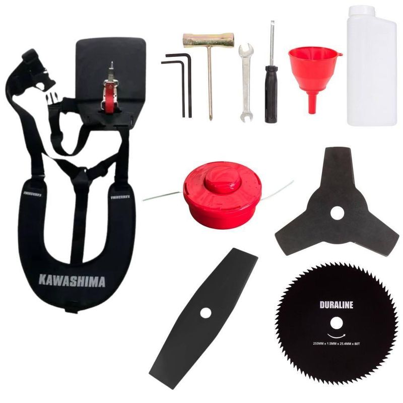 Roçadeira Profissional Lateral Kawashima Kw52l à Gasolina 52c 2,5hp + Faca 2 Pontas Duraline 330mm 2,7mm + Faca 80 DentRoçadeira Profissional Lateral Kawashima KW52-L À Gasolina 2T 52c 2,5HP Com Lâmina 3 Pontas + Faca 2 Pontas 330mm + Faca 80 Dentes 255mmMARCA KAWASHIMA - A ROÇADEIRA MAIS VENDIDA DO BRASIL- ROÇADEIRA POTENTE E ECONÔMICA- ALTA ROTAÇÃO E PERFORMANCE COM ECONOMIA- ASSISTÊNCIA TÉCNICA EM TODO TERRITÓRIO NACIONAL- PRODUTO COM 6 MESES DE GARANTIA- PEÇAS DE REPOSIÇÃO DE FÁCIL ACESSO- EQUIPE DE PÓS-VENDAS A DISPOSIÇÃOA Roçadeira Kawashima KW52L conta com motor 2 tempos à gasolina, 52 cilindradas e potência de 2,5HP. Projetada para facilitar o trabalho de roçada de capim, arbustos, pastagens, controle de pastos, trabalhos de jardinagem, limpeza e manutenção de grandes áreas verdes com sua utilização em sítios; fazendas e chácaras. Ideal também para manutenção e limpeza de vias públicas e rodovias. Desenvolvida com uma estrutura resistente e suporte do guidão reforçado, seus componentes possuem alta durabilidade. A vantagem da roçadeira é que pode ser usada em locais irregulares, morros, buracos, florestas, entre outro com dificuldade de acesso. Produto de alta qualidade, desempenho e durabilidade.Operador, instrução recomendada para a utilização da máquina: Verifique a montagem e estado dos componentes da roçadeira; Assegure-se de estar utilizando todos os equipamentos de segurança; Leia o manual para saber como dar a partida em uma roçadeira; Segure a roçadeira com ambas as mãos durante a operação; Mantenha todas as partes de seu corpo longe da roçadeira durante sua operação; Sempre desligue o motor da roçadeira antes de deixá-la desassistida; Transporte sempre a roçadeira com o motor desligado; Proceda com a manutenção e limpeza da roçadeira. Há cuidados básicos que devem ser levados em conta para prolongar a vida útil de cada equipamento, dessa forma, além de manter o bom funcionamento você pode prevenir futuras falhas. Lembrando que se não cumprir as instruções de segurança pode resultar em lesões graves.ESPECIFICAÇÕES TÉCNICAS:-Modelo: KW52-L-Marca: Kawashima-Tipo: Lateral, com guidão-Diâmetro da haste: 28mm-Eixo cardã (diâmetro x estria): 8 x 9-Motor: Kawashima M-5200-Tipo do motor: 2 tempos, gasolina-Cilindradas: 52cc-Potência: 2,5HP-Tipo do carburador: Diafragma, com regulagem-Combustível: Gasolina e Óleo 2T (25:1)-Capacidade do tanque de combustível: 1,10L-Peso: 8Kg-Diâmetro de encaixe da lâmina: 1'' (25,4mm)EXTRA: LÂMINA 2 PONTAS - Tamanho: 330MM Furo: 25,4 MM (1) / 20MM Espessura 2,70MMESPECIFICAÇÕES TÉCNICAS:- Tipo de Lâmina: Facão- Quantidade de Pontas: 2- Diâmetro: 330mm- Furo: 25mm Com Redutor Para 20mm- Espessura: 2,7mmEXTRA: DISCO DE CORTE 80 DENTES - DIÂM. 255MM X 25,4 MM (1) + Anel Redutor Para 20MM; Espessura 1,5MMESPECIFICAÇÕES TÉCNICAS:- Tipo de Lâmina: Circular- Quantidade de Dentes: 80- Diâmetro: 255mm- Furo: 25mm Com Redutor Para 20mm- Espessura: 1,5mmITENS INCLUSOS:-01: Lâmina 2 Pontas;-01: Lâmina 3 Pontas;-01: Lâmina 80 Dentes;-01: Carretel de fio de nylon;-01: Cinto de sustentação duplo;-01: Misturador de combustível;-01: Kit de ferramentas;-01: Manual de Instruções; Marca: Kawashima | Com sistema antivibração: Não | Modelo: KW52L2P80D | Motivo de GTIN vazio: O produto é um kit ou pack | Capacidade do tanque de Óleo: N/A | Fonte do produto: N/A | Tipo de guiador: Aberto | Com regulação de guiador: Sim | Sistema de partida: Manual | Comprimento total: 188cm | Capacidade do tanque de combustível: 1,2L | MPN: 84678900 | Diâmetro de corte do disco de corte: 255mm | Tempos do motor: 2 | Eixo de transmissão: Reto | Peso: 12Kg | Tipos de máquinas: Roçadeira | Cilindrada: 52cc | Tipo de eixo da máquina: Reto | Sistemas de corte: Lâmina & Nylon | SKU: KW52L2P80D | Acessórios incluídos: Faca 3 pontas, Cinto Duplo e Kit Ferramentas | Condição do item: Novo | Código universal de produto: 0703878018077 | É kit: Sim | Com guarda de segurança: Sim | Largura total: 50cm | Potência do motor: 2,5HP | Diâmetro de corte da tanza: 255mm | Selo SEC: N/A