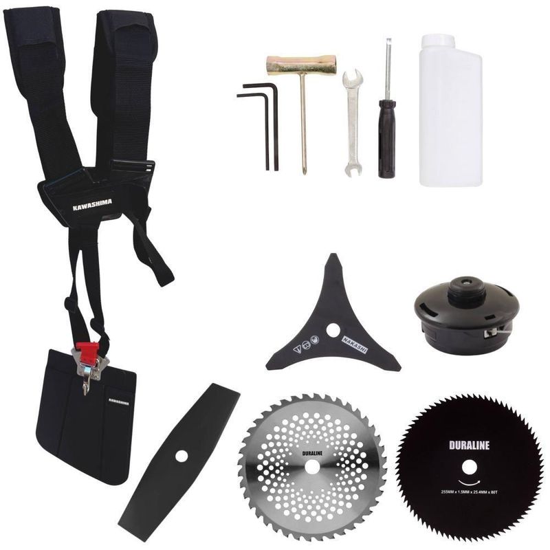 Roçadeira Profissional Lateral Kawashima Kw52le à Gasolina 52c 2,5hp 2t + Faca 2 Pontas + Faca 40 Dentes + Faca 80 DentRoçadeira Profissional Kawashima KW52-LE À Gasolina 2T 52cc 2,5HP Com Lâmina 3 Pontas + Faca 2 Pontas 330mm 2,7mm + Faca 40 Dentes 255mm 2mm + Faca 80 Dentes 255mm 1,5mm + Óleo TOYAMA LUB FG50 500ml 2TATENÇÃO: A ROÇADEIRA É DA MARCA KAWASHIMA E ACOMPANHA UM Óleo 2T DA MARCA TOYAMA- MARCA KAWASHIMA - A ROÇADEIRA MAIS VENDIDA DO BRASIL- ROÇADEIRA POTENTE E ECONÔMICA- ALTA ROTAÇÃO E PERFORMANCE COM ECONOMIA- ASSISTÊNCIA TÉCNICA EM TODO TERRITÓRIO NACIONAL- PRODUTO COM 6 MESES DE GARANTIA- PEÇAS DE REPOSIÇÃO DE FÁCIL ACESSO- JÁ VEM MONTADA EM CAIXA ÚNICA PRONTA PARA O USO- EQUIPE DE PÓS-VENDAS A DISPOSIÇÃO- Óleo 2T TOYAMA LUB FG50 JASO FC Semissintético (50:1) - OBSERVE A INSTRUÇÃO DE MISTURA:Operador, instrução de mistura recomendada para a utilização da máquina com o Óleo 2T TOYAMA LUB (1:50) 500ml : Observe sempre a proporção da mistura específica deste Óleo, onde para cada 1 Litro de Gasolina utilizar 20ml do Óleo TOYAMA, ou para cada 500ml de Gasolina utilizar 10ml do Óleo TOYAMA. Além de manter o bom funcionamento, você pode prevenir futuras falhas e excesso de fumaça no cilindro de combustão.A Roçadeira Kawashima KW52LE conta com motor 2 tempos à gasolina, 52 cilindradas e potência de 2,5HP. Projetada para facilitar o trabalho de roçada de capim, arbustos, pastagens, controle de pastos, trabalhos de jardinagem, limpeza e manutenção de grandes áreas verdes com sua utilização em sítios; fazendas e chácaras. Ideal também para manutenção e limpeza de vias públicas e rodovias.ESPECIFICAÇÕES TÉCNICAS:-Modelo: KW52-LE-Marca: Kawashima-Tipo: Lateral, com guidão-Diâmetro da haste: 28mm-Eixo cardã (diâmetro x estria): 8 x 9-Motor: Kawashima M-5200E-Tipo do motor: 2 tempos, gasolina-Cilindradas: 52cc-Potência: 2,5HP-Tipo do carburador: Diafragma, com regulagem-Combustível: Gasolina e Óleo 2T (25:1)-Capacidade do tanque de combustível: 1,20L-Peso: 9Kg-Diâmetro de encaixe da lâmina: 1'' (25,4mm)EXTRA: LÂMINA 2 PONTASÉ uma Faca Multiuso de 2 pontas que pode ser aplicada para diferentes trabalhos, possui material reforçado que é ideal para trabalhos pesados, podendo cortar os seguintes capins: Capim Grosso, Capim Elefante, Guanxuma, Annoni, Vassourinha, Capim Napier, Capim Sapê e entre outras variantes de capins.ESPECIFICAÇÕES TÉCNICAS:- Tipo de Lâmina: Facão- Quantidade de Pontas: 2- Diâmetro: 330mm- Furo: 25mm Com Redutor Para 20mm- Espessura: 2,7mmEXTRA: DISCO DE CORTE 40 DENTES VIDEAPode ser aplicado para diferentes trabalhos, tendo em vista que pode serrar madeiras até 10cm, dentre elas esse modelo corta: Arbustos, Pequenas Árvores, Capim Grosso, Capim Elefante, Capim Guanxuma, Capim Annoni, Vassourinha, Bambu, Cana de Açúcar, Mato Alto, Capim Napier, Capim Sapê, Touceiras entre outros.ESPECIFICAÇÕES TÉCNICAS:- Tipo de Lâmina: Circular Vídea- Quantidade de Dentes: 40- Diâmetro: 255mm- Furo: 25mm (1'') Com Anel Redutor Para 20mm- Espessura: 2mmEXTRA: DISCO DE CORTE 80 DENTESÉ um disco multiuso pois pode ser aplicado para diferentes trabalhos, tendo em vista que pode serrar madeiras até 10cm, dentre elas esse modelo corta: Arbustos, Pequenas Árvores, Capim Grosso, Capim Elefante, Capim Guanxuma, Capim Annoni, Vassourinha, Bambu, Cana de Açúcar , Mato Alto, Capim Napier, Capim Sapê, Touceiras entre outros.ESPECIFICAÇÕES TÉCNICAS:- Tipo de Lâmina: Circular- Quantidade de Dentes: 80- Diâmetro: 255mm- Furo: 25mm Com Redutor Para 20mm- Espessura: 1,5mmITENS INCLUSOS:-01: Lâmina 2 Pontas;-01: Lâmina 3 Pontas;-01: Lâmina 40 Dentes;-01: Lâmina 80 Dentes;-01: Óleo Toyama FG50 500ml 2T-01: Carretel de fio de nylon;-01: Cinto de sustentação duplo;-01: Misturador de combustível;-01: Kit de ferramentas;-01: Manual de Instruções; Marca: Kawashima | Com sistema antivibração: Não | Selo SEC: N/A | Modelo: VAR02KW52LE2P40D80DOT | Motivo de GTIN vazio: O produto é um kit ou pack | Capacidade do tanque de Óleo: N/A | Fonte do produto: N/A | Tipo de guiador: Aberto | Com regulação de guiador: Sim | Sistema de partida: Manual | Comprimento total: 188cm | Com guarda de segurança: Sim | Capacidade do tanque de combustível: 1,2L | MPN: 84678900 | Diâmetro de corte do disco de corte: 255mm | Largura total: 50cm | Tempos do motor: 2 | Eixo de transmissão: Rígido | Peso: 12KG | Tipos de máquinas: Roçadeira | Potência do motor: 2,5HP | Cilindrada: 52cc | Tipo de eixo da máquina: Reto | Diâmetro de corte da tanza: 255mm | Sistemas de corte: Lâmina e Fio de Nylon | Acessórios incluídos: Cinto de sustentação duplo, Misturador de combustível, Kit de ferramentas | Condição do item: Novo | É kit: Sim | SKU: VAR02KW52LE2P40D80DOT | Código universal de produto: 0703363311522
