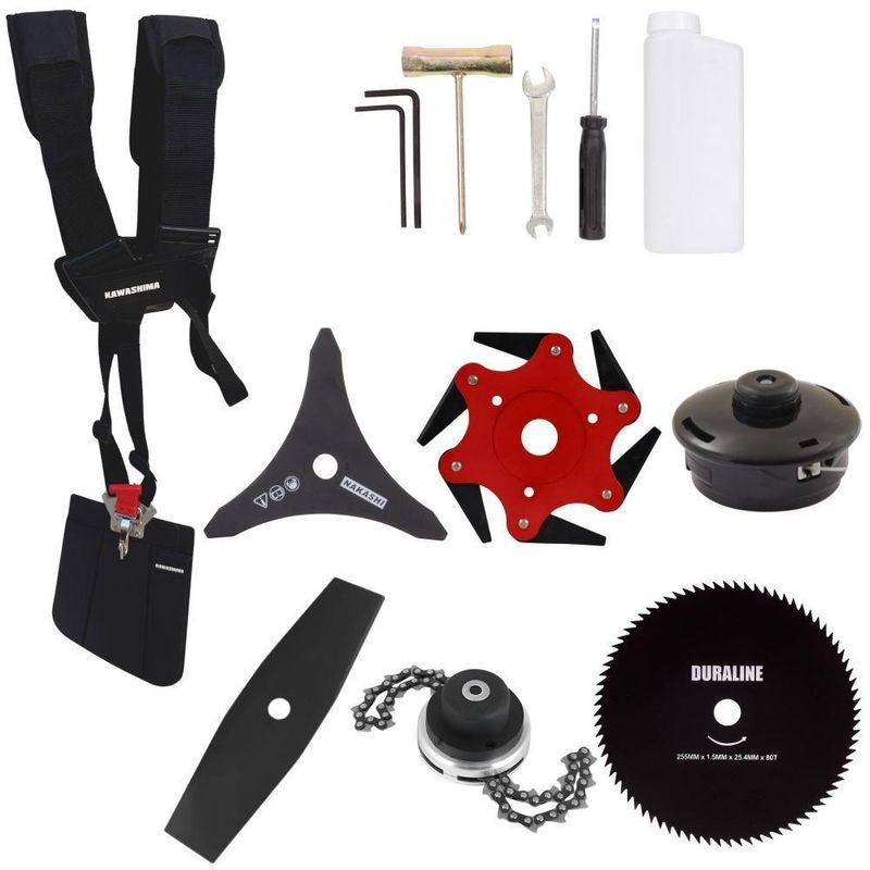 Roçadeira Profissional Lateral Kawashima Kw52le à Gasolina 52c 2,5hp 2t + Faca 2 Pontas 330mm + Faca 80 Dentes 255mm +Roçadeira Profissional Kawashima KW52-LE À Gasolina 2T 52c 2,5HP Com Lâmina 3 Pontas + Faca 2 Pontas 330mm 2,7mm + Faca 80 Dentes 255mm 1,5mm + Trimmer + Faca 6 Pontas 250mm- MARCA KAWASHIMA - A ROÇADEIRA MAIS VENDIDA DO BRASIL- ROÇADEIRA POTENTE E ECONÔMICA- ALTA ROTAÇÃO E PERFORMANCE COM ECONOMIA- ASSISTÊNCIA TÉCNICA EM TODO TERRITÓRIO NACIONAL- PRODUTO COM 6 MESES DE GARANTIA- PEÇAS DE REPOSIÇÃO DE FÁCIL ACESSO- JÁ VEM MONTADA EM CAIXA ÚNICA PRONTA PARA O USO- EQUIPE DE PÓS-VENDAS A DISPOSIÇÃOA Roçadeira Kawashima KW52LE conta com motor 2 tempos à gasolina, 52 cilindradas e potência de 2,5HP. Projetada para facilitar o trabalho de roçada de capim, arbustos, pastagens, controle de pastos, trabalhos de jardinagem, limpeza e manutenção de grandes áreas verdes com sua utilização em sítios; fazendas e chácaras. Ideal também para manutenção e limpeza de vias públicas e rodovias.ESPECIFICAÇÕES TÉCNICAS:-Modelo: KW52-LE-Marca: Kawashima-Tipo: Lateral, com guidão-Diâmetro da haste: 28mm-Eixo cardã (diâmetro x estria): 8 x 9-Motor: Kawashima M-5200E-Tipo do motor: 2 tempos, gasolina-Cilindradas: 52cc-Potência: 2,5HP-Tipo do carburador: Diafragma, com regulagem-Combustível: Gasolina e Óleo 2T (25:1)-Capacidade do tanque de combustível: 1,20L-Peso: 9Kg-Diâmetro de encaixe da lâmina: 1'' (25,4mm)EXTRA: LÂMINA 2 PONTASÉ uma Faca Multiuso de 2 pontas que pode ser aplicada para diferentes trabalhos, possui material reforçado que é ideal para trabalhos pesados, podendo cortar os seguintes capins: Capim Grosso, Capim Elefante, Guanxuma, Annoni, Vassourinha, Capim Napier, Capim Sapê e entre outras variantes de capins.ESPECIFICAÇÕES TÉCNICAS:- Tipo de Lâmina: Facão- Quantidade de Pontas: 2- Diâmetro: 330mm- Furo: 25mm Com Redutor Para 20mm- Espessura: 2,7mmEXTRA: DISCO DE CORTE 80 DENTESÉ um disco multiuso pois pode ser aplicado para diferentes trabalhos, tendo em vista que pode serrar madeiras até 10cm, dentre elas esse modelo corta: Arbustos, Pequenas Árvores, Capim Grosso, Capim Elefante, Capim Guanxuma, Capim Annoni, Vassourinha, Bambu, Cana de Açúcar , Mato Alto, Capim Napier, Capim Sapê, Touceiras entre outros.ESPECIFICAÇÕES TÉCNICAS:- Tipo de Lâmina: Circular- Quantidade de Dentes: 80- Diâmetro: 255mm- Furo: 25mm Com Redutor Para 20mm- Espessura: 1,5mmEXTRA: Trimmer Com Corrente de Motosserra:Dados Técnicos:- Diâmetro: 330mm- Furo: 25mm- Espessura: 60mm- Material: Lâminas corrente de motosserraEXTRA: Lâminia 6 Pontas Terra:ESPECIFICAÇÕES TÉCNICAS:Dados Técnicos:- Diâmetro: 250mm- Furo: 25mm- Espessura: 0,5mm- Material: Lâminas de metalITENS INCLUSOS:-01: Lâmina 2 Pontas;-01: Lâmina 3 Pontas;-01: Lâmina 6 pontas-01: Lâmina 80 Dentes;-01: Trimmer-01: Carretel de fio de nylon;-01: Cinto de sustentação duplo;-01: Misturador de combustível;-01: Kit de ferramentas;-01: Manual de Instruções; Marca: Kawashima | Com sistema antivibração: Não | Selo SEC: N/A | Modelo: KW52LE2P80DTM6P | Motivo de GTIN vazio: O produto é um kit ou pack | Capacidade do tanque de Óleo: N/A | Fonte do produto: N/A | Tipo de guiador: Aberto | Com regulação de guiador: Sim | Sistema de partida: Manual | Comprimento total: 188cm | Com guarda de segurança: Sim | Capacidade do tanque de combustível: 1,2L | MPN: 84678900 | Diâmetro de corte do disco de corte: 255mm | Largura total: 50cm | Tempos do motor: 2 | Eixo de transmissão: Rígido | Peso: 12KG | Tipos de máquinas: Roçadeira | Potência do motor: 2,5HP | Cilindrada: 52cc | Tipo de eixo da máquina: Reto | Diâmetro de corte da tanza: 255mm | Sistemas de corte: Lâmina e Fio de Nylon | Acessórios incluídos: Cinto de sustentação duplo, Misturador de combustível, Kit de ferramentas | Condição do item: Novo | Código universal de produto: 0703363311195 | É kit: Sim | SKU: KW52LE2P80DTM6P