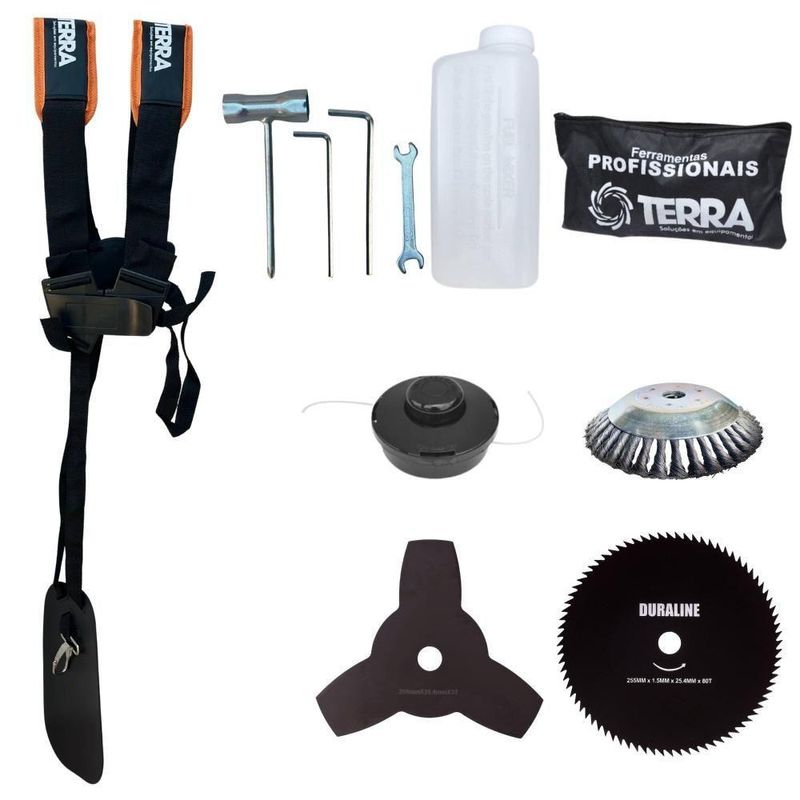Roçadeira Profissional Lateral Terra Grh430 á Gasolina 43cc 1,7hp + Faca 80 Dentes Duraline 255mm 1,5mm + Escova RotatiRoçadeira Profissional Lateral Terra GRH-430 Black À Gasolina 2 Tempos 43cc 1,7HP + Faca 80 Dentes 255mm 1,5mm + Escova Rotativa 200mm 38 CerdasMARCA TERRA - A ROÇADEIRA MAIS VENDIDA DO BRASIL- ROÇADEIRA POTENTE E ECONÔMICA- ALTA ROTAÇÃO E PERFORMANCE COM ECONOMIA- ASSISTÊNCIA TÉCNICA EM TODO TERRITÓRIO NACIONAL- PRODUTO COM GARANTIA OFICIAL TERRA EM TODO BRASIL- PEÇAS DE REPOSIÇÃO DE FÁCIL ACESSO- EQUIPE DE PÓS-VENDAS A DISPOSIÇÃOA Roçadeira Profissional GRH-430 Black conta com motor 2 tempos à gasolina, 43 cilindradas e potência de 1,7 HP. Possui partida leve, com sistema manual, auto-retrátil, e com punhos ergonômicos de fácil aceleração, equipada com carburador universal BIGDINT de maior potência e economia, e também cinto de sustentação duplo com ombreiras almofadadas, proporcionando assim um maior conforto, ergonomia e segurança ao operador.A Roçadeira Terra GRH430 foi projetada para facilitar o trabalho de roçada de capim, arbustos, pastagens, controle de pastos, trabalhos de jardinagem, limpeza e manutenção de grandes áreas verdes com sua utilização em sítios; fazendas e chácaras. Ideal também para manutenção e limpeza de vias públicas e rodovias.Operador, instrução recomendada para a utilização da máquina: Verifique a montagem e estado dos componentes da roçadeira; Assegure-se de estar utilizando todos os equipamentos de segurança; Leia o manual para saber como dar a partida em uma roçadeira; Segure a roçadeira com ambas as mãos durante a operação; Mantenha todas as partes de seu corpo longe da roçadeira durante sua operação; Sempre desligue o motor da roçadeira antes de deixá-la desassistida; Transporte sempre a roçadeira com o motor desligado; Proceda com a manutenção e limpeza da roçadeira.ESPECIFICAÇÕES TÉCNICAS:- Tipo: Roçadeira lateral, com guidão- Cód: 705486B- Modelo: GRH430 Black- Marca: Terra- Motor: À Gasolina, 2 tempos- Potência: 1,67HP (1,7HP)- Cilindradas: 42,7 (43cc)- Rotação: 6.500RPM- Ignição: Eletrônica- Partida: Manual Auto-retrátil- Carburador: Diafragma com Regulagem- Embreagem: Centrifuga em alumínio fundido- Capacidade do tanque de combustível: 1000ml- Autonomia: Aprox. 60min- Eixo Cardã: Eixo Rígido de 8mm x 9 estrias- Tubo do Eixo Cardã: Tubo de Alumínio 26mm - 153cm- Guidão: Bi-Partido fixado com suportes parafusados- Lâmina: 3 Pontas, 255mm, espessura 2mm, furo 1- Combustível: Gasolina com Óleo 2 tempos, proporção 25:1- Carretel Nylon: Automático, libera o fio com um toque no chão- Peso: 9,50 kgEXTRA: DISCO DE CORTE 80 DENTES - DIÂM. 255MM X 25,4 MM (1) + Anel Redutor Para 20MM; Espessura 1,5MMO DISCO DE CORTE 80 Dentes acompanha um anel de redução que pode ser utiizada para roçadeiras de furo 20mm ou 25mm, sendo feita em aço cromo vanádio que garante mais segurança, desempenho e durabilidade. Possui maior rendimento no trabalho e não precisa ser afiada antes do uso. É um disco multiuso pois pode ser aplicado para diferentes trabalhos, tendo em vista que pode serrar madeiras até 10cm, dentre elas esse modelo corta: Arbustos, Pequenas Árvores, Capim Grosso, Capim Elefante, Capim Guanxuma, Capim Annoni, Vassourinha, Bambu, Cana de Açúcar , Mato Alto entre outros.ESPECIFICAÇÕES TÉCNICAS:- Tipo de Lâmina: Circular- Quantidade de Dentes: 80- Diâmetro: 255mm- Furo: 25mm Com Redutor Para 20mm- Espessura: 1,5mmEXTRA: ESCOVA DE AÇO ROTATIVA 200mm; Furo: 25,4 MM (1'')+ Anel Redutor Para 20MM; Espessura 2,70MMA Escova rotativa da Duraline acompanha um anel de redução, ou seja, pode ser utilizada para roçadeiras de furo 20mm ou 25mm, tendo as cerdas feitas em aço garante mais segurança, desempenho e durabilidade. A Escova Rotativa Duraline é balanceada, fazendo com que haja menor vibração, corte contínuo e suave, com mais conforto ao operador e mais longevidade para a roçadeira. A escova é do modelo côncavo, assim facilitando o seu uso durante o manuseio. A Escova pode ser aplicada para diferentes trabalhos, dentre elas: Limpeza de Pavers, Limpeza de Calçadas, Limpeza de concreto, Limpeza de Pavimentos, Remoção de musgos e Remoção de ervas daninhasESPECIFICAÇÕES TÉCNICAS:- Tipo de Escova: Rotativa com cerdas em aço- Quantidade de Cerdas: 38- Diâmetro: 200mm- Furo: 25mm Com Redutor Para 20mm- Espessura: 50mmITENS INCLUSOS:- 01: Carretel de Nylon;- 01: Lâmina 3 pontas;- 01: Lâmina 80 dentes;- 01: Escova Rotativa de Aço- 01: Cinto Duplo Ergonômico com Ombreiras Almofadadas;- 01: Misturador de combustível;- 01: Kit ferramentas para manutenção;- 01: Manual de Instruções; Marca: Terra | Com sistema antivibração: Não | Modelo: GRH43080D38C | Motivo de GTIN vazio: O produto é um kit ou pack | Capacidade do tanque de Óleo: N/A | Tipo de guiador: Aberto | Fonte do produto: N/A | Com regulação de guiador: Sim | Sistema de partida: Manual | Comprimento total: 188cm | Com guarda de segurança: Sim | MPN: 84678900 | Capacidade do tanque de combustível: 1,0L | Diâmetro de corte do disco de corte: 255mm | Largura total: 40cm | Tempos do motor: 2 | Eixo de transmissão: Reto | Peso: 12kg | Tipos de máquinas: Roçadeira | Potência do motor: 1,7HP | Cilindrada: 43cc | Tipo de eixo da máquina: Reto | Diâmetro de corte da tanza: 255mm | Sistemas de corte: Faca e Carretel de Nylon | SKU: GRH43080D38C | Acessórios incluídos: Kit ferramentas, cinto de sustentação, misturador de combustível | Condição do item: Novo | Código universal de produto: 0703878009952 | É kit: Sim | Selo SEC: N/A