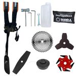 Roçadeira Profissional Lateral Terra Grh430 á Gasolina 43cc 2t 1,7hp + Faca 2 Pontas 330mm + Faca 40 Dentes 255mm + FacRoçadeira Profissional Lateral Terra GRH-430 Black À Gasolina 2 Tempos 43cc 1,7HP + Faca 2 Pontas 330mm 2,7mm + Faca 40 Dentes 255mm 2mm + Faca 6 Pontas 250mmMARCA TERRA - A ROÇADEIRA MAIS VENDIDA DO BRASIL- ROÇADEIRA POTENTE E ECONÔMICA- ALTA ROTAÇÃO E PERFORMANCE COM ECONOMIA- ASSISTÊNCIA TÉCNICA EM TODO TERRITÓRIO NACIONAL- PRODUTO COM GARANTIA OFICIAL TERRA EM TODO BRASIL- PEÇAS DE REPOSIÇÃO DE FÁCIL ACESSO- EQUIPE DE PÓS-VENDAS A DISPOSIÇÃOA Roçadeira Profissional GRH-430 Black conta com motor 2 tempos à gasolina, 43 cilindradas e potência de 1,7 HP. Possui partida leve, com sistema manual, auto-retrátil, e com punhos ergonômicos de fácil aceleração, equipada com carburador universal BIGDINT de maior potência e economia, e também cinto de sustentação duplo com ombreiras almofadadas, proporcionando assim um maior conforto, ergonomia e segurança ao operador.A Roçadeira Terra GRH430 foi projetada para facilitar o trabalho de roçada de capim, arbustos, pastagens, controle de pastos, trabalhos de jardinagem, limpeza e manutenção de grandes áreas verdes com sua utilização em sítios; fazendas e chácaras. Ideal também para manutenção e limpeza de vias públicas e rodovias.Operador, instrução recomendada para a utilização da máquina: Verifique a montagem e estado dos componentes da roçadeira; Assegure-se de estar utilizando todos os equipamentos de segurança; Leia o manual para saber como dar a partida em uma roçadeira; Segure a roçadeira com ambas as mãos durante a operação; Mantenha todas as partes de seu corpo longe da roçadeira durante sua operação; Sempre desligue o motor da roçadeira antes de deixá-la desassistida; Transporte sempre a roçadeira com o motor desligado; Proceda com a manutenção e limpeza da roçadeira. Há cuidados básicos que devem ser levados em conta para prolongar a vida útil de cada equipamento, dessa forma, além de manter o bom funcionamento você pode prevenir futuras falhas. Lembrando que se não cumprir as instruções de segurança pode resultar em lesões graves.ESPECIFICAÇÕES TÉCNICAS:- Tipo: Roçadeira lateral, com guidão- Cód: 705486B- Modelo: GRH430 Black- Marca: Terra- Motor: À Gasolina, 2 tempos- Potência: 1,67HP (1,7HP)- Cilindradas: 42,7 (43cc)- Rotação: 6.500RPM- Ignição: Eletrônica- Partida: Manual Auto-retrátil- Carburador: Diafragma com Regulagem- Embreagem: Centrifuga em alumínio fundido- Capacidade do tanque de combustível: 1000ml- Autonomia: Aprox. 60min- Eixo Cardã: Eixo Rígido de 8mm x 9 estrias- Tubo do Eixo Cardã: Tubo de Alumínio 26mm - 153cm- Guidão: Bi-Partido fixado com suportes parafusados- Lâmina: 3 Pontas, 255mm, espessura 2mm, furo 1- Combustível: Gasolina com Óleo 2 tempos, proporção 25:1- Carretel Nylon: Automático, libera o fio com um toque no chão- Peso: 9,50 kgEXTRA: LÂMINA 2 PONTAS - TAMANHO: 330MM FURO: 25,4 MM (1) / 20MM ESPESSURA 2,70MMA Faca 2 Pontas da Duraline acompanha um anel de redução, ou seja, pode ser utiizada para roçadeiras de furo 20mm ou 25mm, sendo feita em aço cromo vanádio garante mais segurança, desempenho e durabilidade.ESPECIFICAÇÕES TÉCNICAS:- Tipo de Lâmina: Facão- Quantidade de Pontas: 2- Diâmetro: 330mm- Furo: 25mm Com Redutor Para 20mm- Espessura: 2,7mmEXTRA: DISCO DE CORTE 40 DENTES VIDEA - DIÂM. 255MM X 25,4 MM (1) + Anel Redutor Para 20MM; Espessura 1,3MMO DISCO DE CORTE 40 Dentes de Vídea acompanha um anel de redução, ou seja, pode ser utiizada para roçadeiras de furo 20mm ou 25mm além de possui pintura feita por Cataforese a qual é mais resistente à corrosão. Seus dentes de vídea soldados à laser possuem encaixe especial, garantindo mais segurança, desempenho e durabilidade,Pode ser aplicado para diferentes trabalhos, tendo em vista que pode serrar madeiras até 10cm, dentre elas esse modelo corta: Arbustos, Pequenas Árvores, Capim Grosso, Capim Elefante, Capim Guanxuma, Capim Annoni, Vassourinha, Bambu, Cana de Açúcar, Mato Alto, Capim Napier, Capim Sapê, Touceiras entre outros.ESPECIFICAÇÕES TÉCNICAS:- Tipo de Lâmina: Circular Vídea- Quantidade de Dentes: 40- Diâmetro: 255mm- Furo: 25mm (1'') Com Anel Redutor Para 20mm- Espessura: 2mmEXTRA: Lâminia 6 Pontas Terra:ESPECIFICAÇÕES TÉCNICAS:Dados Técnicos:- Diâmetro: 250mm- Furo: 25mm- Espessura: 0,5mm- Material: Lâminas de metalITENS INCLUSOS:- 01: Carretel de Nylon;- 01: Lâmina 2 pontas;- 01: Lâmina 3 pontas;- 01: Lâmina 6 pontas- 01: Lâmina 40 dentes;- 01: Cinto Duplo Ergonômico com Ombreiras Almofadadas;- 01: Misturador de combustível;- 01: Kit ferramentas para manutenção;- 01: Manual de Instruções; Marca: Terra | Com sistema antivibração: Não | Selo SEC: N/A | Modelo: VAR01GRH4302P40D6P | Motivo de GTIN vazio: O produto é um kit ou pack | Capacidade do tanque de Óleo: N/A | Fonte do produto: N/A | Tipo de guiador: Aberto | Com regulação de guiador: Sim | Sistema de partida: Manual | Comprimento total: 188cm | Com guarda de segurança: Sim | Capacidade do tanque de combustível: 1,0L | MPN: 84678900 | Diâmetro de corte do disco de corte: 255mm | Largura total: 40cm | Tempos do motor: 2 | Eixo de transmissão: Rígido | Peso: 12kg | Tipos de máquinas: Roçadeira | Potência do motor: 1,7HP | Cilindrada: 43cc | Tipo de eixo da máquina: Reto | Diâmetro de corte da tanza: 255mm | Sistemas de corte: Faca e Carretel de Nylon | SKU: VAR01GRH4302P40D6P | Acessórios incluídos: Kit ferramentas, cinto de sustentação, misturador de combustível | Condição do item: Novo | Código universal de produto: 0703363312048 | É kit: Sim
