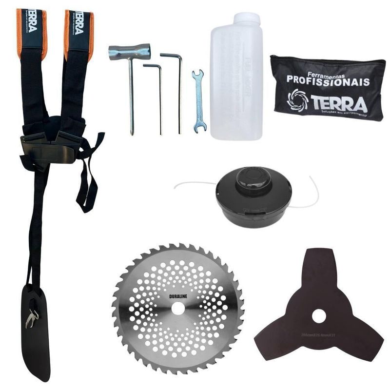 Roçadeira Profissional Lateral Terra Grh430 á Gasolina 43cc 2t 1,7hp + Faca 40 Dentes Duraline 255mm 2mm - 2552540gcjbRoçadeira Profissional Lateral Terra GRH-430 Black À Gasolina 2 Tempos 43cc 1,7HP + Faca 40 Dentes 255mm 2mmMARCA TERRA - A ROÇADEIRA MAIS VENDIDA DO BRASIL- ROÇADEIRA POTENTE E ECONÔMICA- ALTA ROTAÇÃO E PERFORMANCE COM ECONOMIA- ASSISTÊNCIA TÉCNICA EM TODO TERRITÓRIO NACIONAL- PRODUTO COM GARANTIA OFICIAL TERRA EM TODO BRASIL- PEÇAS DE REPOSIÇÃO DE FÁCIL ACESSO- EQUIPE DE PÓS-VENDAS A DISPOSIÇÃOA Roçadeira Profissional GRH-430 Black conta com motor 2 tempos à gasolina, 43 cilindradas e potência de 1,7 HP. Possui partida leve, com sistema manual, auto-retrátil, e com punhos ergonômicos de fácil aceleração, equipada com carburador universal BIGDINT de maior potência e economia, e também cinto de sustentação duplo com ombreiras almofadadas, proporcionando assim um maior conforto, ergonomia e segurança ao operador.A Roçadeira Terra GRH430 foi projetada para facilitar o trabalho de roçada de capim, arbustos, pastagens, controle de pastos, trabalhos de jardinagem, limpeza e manutenção de grandes áreas verdes com sua utilização em sítios; fazendas e chácaras. Ideal também para manutenção e limpeza de vias públicas e rodovias. Desenvolvida com uma estrutura resistente e suporte do guidão reforçado, seus componentes possuem alta durabilidade. A vantagem da roçadeira é que pode ser usada em locais irregulares, morros, buracos, florestas, entre outro com dificuldade de acesso. Produto de alta qualidade, desempenho e durabilidade.Operador, instrução recomendada para a utilização da máquina: Verifique a montagem e estado dos componentes da roçadeira; Assegure-se de estar utilizando todos os equipamentos de segurança; Leia o manual para saber como dar a partida em uma roçadeira; Segure a roçadeira com ambas as mãos durante a operação; Mantenha todas as partes de seu corpo longe da roçadeira durante sua operação; Sempre desligue o motor da roçadeira antes de deixá-la desassistida; Transporte sempre a roçadeira com o motor desligado; Proceda com a manutenção e limpeza da roçadeira. Há cuidados básicos que devem ser levados em conta para prolongar a vida útil de cada equipamento, dessa forma, além de manter o bom funcionamento você pode prevenir futuras falhas. Lembrando que se não cumprir as instruções de segurança pode resultar em lesões graves.ESPECIFICAÇÕES TÉCNICAS:- Tipo: Roçadeira lateral, com guidão- Cód: 705486B- Modelo: GRH430 Black- Marca: Terra- Motor: À Gasolina, 2 tempos- Potência: 1,67HP (1,7HP)- Cilindradas: 42,7 (43cc)- Rotação: 6.500RPM- Ignição: Eletrônica- Partida: Manual Auto-retrátil- Carburador: Diafragma com Regulagem- Embreagem: Centrifuga em alumínio fundido- Capacidade do tanque de combustível: 1200ml- Autonomia: Aprox. 60min- Eixo Cardã: Eixo Rígido de 8mm x 9 estrias- Tubo do Eixo Cardã: Tubo de Alumínio 26mm - 153cm- Guidão: Bi-Partido fixado com suportes parafusados- Lâmina: 3 Pontas, 255mm, espessura 2mm, furo 1- Combustível: Gasolina com Óleo 2 tempos, proporção 25:1- Carretel Nylon: Automático, libera o fio com um toque no chão- Peso: 9,50 kgEXTRA: DISCO DE CORTE 40 DENTES VIDEA - DIÂM. 255MM X 25,4 MM (1) + Anel Redutor Para 20MM; Espessura 1,3MMO DISCO DE CORTE 40 Dentes de Vídea acompanha um anel de redução, ou seja, pode ser utiizada para roçadeiras de furo 20mm ou 25mm além de possui pintura feita por Cataforese a qual é mais resistente à corrosão. Seus dentes de vídea soldados à laser possuem encaixe especial, garantindo mais segurança, desempenho e durabilidade, as lâminas são balanceadas com menor vibração, corte contínuo e suave, com mais conforto ao operador e mais longevidade para a roçadeira. Possui maior rendimento no trabalho e não precisa ser afiada antes do uso, uma vez que possuem ponta 4 lados de polímero, solda de ponta tipo U. Ideal para terrenos com cascalhos e pequenos galhos para serrar.Pode ser aplicado para diferentes trabalhos, tendo em vista que pode serrar madeiras até 10cm, dentre elas esse modelo corta: Arbustos, Pequenas Árvores, Capim Grosso, Capim Elefante, Capim Guanxuma, Capim Annoni, Vassourinha, Bambu, Cana de Açúcar, Mato Alto, Capim Napier, Capim Sapê, Touceiras entre outros.ESPECIFICAÇÕES TÉCNICAS:- Tipo de Lâmina: Circular Vídea- Quantidade de Dentes: 40- Diâmetro: 255mm- Furo: 25mm (1'') Com Anel Redutor Para 20mm- Espessura: 2mmITENS INCLUSOS:- 01: Carretel com Nylon;- 01: Lâmina 3 pontas;- 01: Lâmina 40 dentes;- 01: Cinto Duplo com Ombreiras Almofadadas;- 01: Misturador de combustível;- 01: Kit ferramentas de manutenção;- 01: Manual de Instrução; Marca: Terra | Com sistema antivibração: Não | Modelo: GRH43040D255MM | Motivo de GTIN vazio: O produto é um kit ou pack | Capacidade do tanque de Óleo: N/A | Tipo de guiador: Aberto | Fonte do produto: N/A | Com regulação de guiador: Sim | Sistema de partida: Manual | Comprimento total: 188cm | Com guarda de segurança: Sim | MPN: 84678900 | Capacidade do tanque de combustível: 1,0L | Diâmetro de corte do disco de corte: 255mm | Largura total: 40cm | Tempos do motor: 2 | Eixo de transmissão: Reto | Peso: 11kg | Tipos de máquinas: Roçadeira | Potência do motor: 1,7HP | Cilindrada: 43cc | Tipo de eixo da máquina: Reto | Diâmetro de corte da tanza: 255mm | Sistemas de corte: Faca e Carretel de Nylon | SKU: GRH43040D255MM | Acessórios incluídos: Kit ferramentas, cinto de sustentação, misturador de combustível | Condição do item: Novo | Código universal de produto: 0703878009716 | É kit: Sim | Selo SEC: N/A