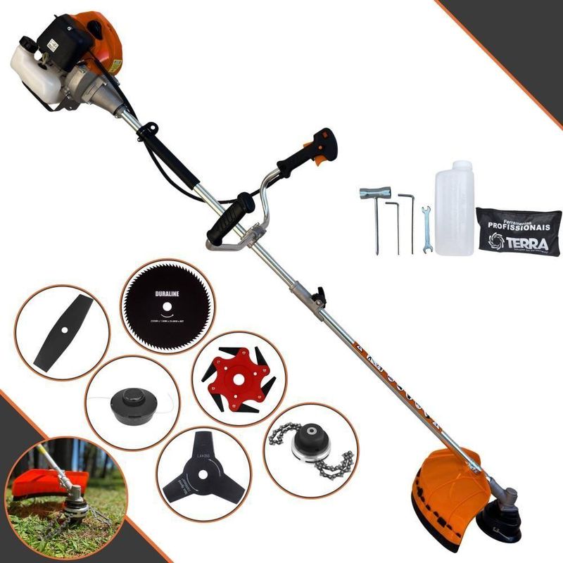 Roçadeira Profissional Lateral Terra Grhb430 á Gasolina 43cc 2t 1,7hp + Faca 3 Pontas 255mm + Faca 80 Dentes 255mm + TRoçadeira Profissional Lateral Terra GRHB-430 Bipartida À Gasolina 2 Tempos 43cc 1,7HP + Faca 3 Pontas + Faca 80 Pontas + Trimmer + Faca 6 Pontas 250mmMARCA TERRA - A ROÇADEIRA MAIS VENDIDA DO BRASIL- ROÇADEIRA POTENTE E ECONÔMICA- ALTA ROTAÇÃO E PERFORMANCE COM ECONOMIA- ASSISTÊNCIA TÉCNICA EM TODO TERRITÓRIO NACIONAL- PRODUTO COM GARANTIA OFICIAL TERRA EM TODO BRASIL- PEÇAS DE REPOSIÇÃO DE FÁCIL ACESSO- EQUIPE DE PÓS-VENDAS A DISPOSIÇÃOA Roçadeira Profissional GRHB-430 com haste Bipartida, é o mais novo modelo do mercado, trazendo inovação com seu novo eixo bipartido, podendo ser desmontada, facilitando o transporte e acomodação do produto, com motor 2 tempos à gasolina, 43 cilindradas e potência de 1,7 HP. Possui partida leve, com sistema manual, auto-retrátil, e com punhos ergonômicos de fácil aceleração e equipada com carburador universal BIGDINT de maior potência e economia.A Roçadeira Terra GRHB-430 Possui ótima relação peso-potência e o seu grande diferencial é o eixo bipartido, que permite ser facilmente transportada em pequenos espaços como porta malas de carros, bagageiro de motocicletas e entre outros. É uma máquina de fácil montagem, com apenas um clique e o encaixe da junção, ela já está pronta para o uso. Conta com um sistema de amortecimento de alto desempenho que isola o motor da transmissão, reduzindo efetivamente os níveis de vibração. Seu guidão com alças angulares, foi especialmente projetado para proporcionar uma experiência ergonômica e confortável.ESPECIFICAÇÕES TÉCNICAS:- Tipo: Roçadeira lateral, com guidão bipartido- Modelo: GRHB430- Marca: Terra- Motor: À Gasolina, 2 tempos- Potência: 1,7 HP- Cilindradas: 43cc- Rotação: 12.000 RPM- Ignição: Eletrônica- Partida: Manual Auto-retrátil- Carburador: Diafragma com Regulagem- Embreagem: Centrifuga em alumínio fundido- Capacidade do tanque de combustível: 1200ml- Autonomia: Aprox. 60min- Eixo Cardã: Eixo Bipartido de 8mm x 9 estrias- Tubo do Eixo Cardã: Tubo de Alumínio 26mm - 153cm- Guidão: Bi-Partido fixado com suportes parafusados- Combustível: Gasolina com Óleo 2 tempos, proporção 25:1- Carretel: Automático, libera o fio com um toque no chão- Peso: 9,50 kgEXTRA: LÂMINA 3 PONTAS - Tamanho: 255MM; Furo: 25,4 MM (1'')+ Anel Redutor Para 20MM; Espessura 2,9MMA faca 3 pontas pode ser aplicada para diferentes trabalhos, tendo em vista que é e Ideal trabalhos profissionais, podendo cortar em diferentes situações: Terenos com galhos, Mato Alto, Capim Grosso e Capoeira.ESPECIFICAÇÕES TÉCNICAS:- Tipo de Lâmina: 3 Lados- Quantidade de Pontas: 3- Diâmetro: 255mm- Furo: 25mm Com Redutor Para 20mm- Espessura: 2,9mmEXTRA: DISCO DE CORTE 80 DENTES - DIÂM. 255MM X 25,4 MM (1) + Anel Redutor Para 20MM; Espessura 1,5MMÉ um disco multiuso pois pode ser aplicado para diferentes trabalhos, tendo em vista que pode serrar madeiras até 10cm, dentre elas esse modelo corta: Arbustos, Pequenas Árvores, Capim Grosso, Capim Elefante, Capim Guanxuma, Capim Annoni, Vassourinha, Bambu, Cana de Açúcar , Mato Alto, Capim Napier, Capim Sapê, Touceiras entre outros.ESPECIFICAÇÕES TÉCNICAS:- Tipo de Lâmina: Circular- Quantidade de Dentes: 80- Diâmetro: 255mm- Furo: 25mm Com Redutor Para 20mm- Espessura: 1,5mmEXTRA: Trimmer Com Corrente de Motosserra:Dados Técnicos:- Diâmetro: 330mm- Furo: 25mm- Espessura: 60mm- Material: Lâminas corrente de motosserraEXTRA: Lâminia 6 Pontas Terra:ESPECIFICAÇÕES TÉCNICAS:Dados Técnicos:- Diâmetro: 250mm- Furo: 25mm- Espessura: 0,5mm- Material: Lâminas de metalITENS INCLUSOS:- 01: Roçadeira GRHB430;- 01: Carretel com Nylon;- 01: Lâmina 2 pontas;- 01: Lâmina 3 pontas;- 01: Lâmina 6 pontas- 01: Lâmina 80 pontas;- 01: Trimmer;- 01: Cinto;- 01: Misturador de combustível;- 01: Kit ferramentas de manutenção;- 01: Manual do Proprietário; Marca: Terra | Com sistema antivibração: Não | Selo SEC: N/A | Modelo: VAR04GRHB4303P80DTM6P | Motivo de GTIN vazio: O produto é um kit ou pack | Capacidade do tanque de Óleo: N/A | Fonte do produto: N/A | Tipo de guiador: Aberto | Com regulação de guiador: Sim | Sistema de partida: Manual | Comprimento total: 188cm | Com guarda de segurança: Sim | Capacidade do tanque de combustível: 1,2L | MPN: 84678900 | Diâmetro de corte do disco de corte: 255mm | Largura total: 40cm | Tempos do motor: 2 | Eixo de transmissão: Rígido | Peso: 12kg | Tipos de máquinas: Roçadeira | Potência do motor: 1,7HP | Cilindrada: 43cc | Tipo de eixo da máquina: Reto | Diâmetro de corte da tanza: 255mm | Sistemas de corte: Lâmina e Carretel de Nylon | SKU: VAR04GRHB4303P80DTM6P | Acessórios incluídos: Kit ferramentas, cinto de sustentação, misturador de combustível | Condição do item: Novo | Código universal de produto: 0703363314974 | É kit: Sim
