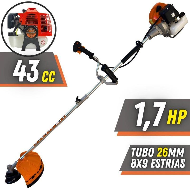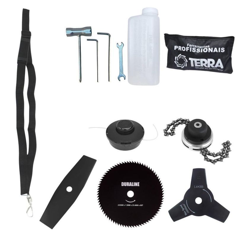 Roçadeira Profissional Lateral Terra Grhb430 á Gasolina 43cc 2t 1,7hp + Faca 3 Pontas 255mm 2,9mm + Faca 80 Dentes 255mRoçadeira Profissional Lateral Terra GRHB-430 Bipartida À Gasolina 2 Tempos 43cc 1,7HP + Faca 3 Pontas + Faca 80 Pontas + TrimmerMARCA TERRA - A ROÇADEIRA MAIS VENDIDA DO BRASIL- ROÇADEIRA POTENTE E ECONÔMICA- ALTA ROTAÇÃO E PERFORMANCE COM ECONOMIA- ASSISTÊNCIA TÉCNICA EM TODO TERRITÓRIO NACIONAL- PRODUTO COM GARANTIA OFICIAL TERRA EM TODO BRASIL- PEÇAS DE REPOSIÇÃO DE FÁCIL ACESSO- EQUIPE DE PÓS-VENDAS A DISPOSIÇÃOA Roçadeira Profissional GRHB-430 com haste Bipartida, é o mais novo modelo do mercado, trazendo inovação com seu novo eixo bipartido, podendo ser desmontada, facilitando o transporte e acomodação do produto, com motor 2 tempos à gasolina, 43 cilindradas e potência de 1,7 HP. Possui partida leve, com sistema manual, auto-retrátil, e com punhos ergonômicos de fácil aceleração e equipada com carburador universal BIGDINT de maior potência e economia.A Roçadeira Terra GRHB-430 Possui ótima relação peso-potência e o seu grande diferencial é o eixo bipartido, que permite ser facilmente transportada em pequenos espaços como porta malas de carros, bagageiro de motocicletas e entre outros. É uma máquina de fácil montagem, com apenas um clique e o encaixe da junção, ela já está pronta para o uso. Conta com um sistema de amortecimento de alto desempenho que isola o motor da transmissão, reduzindo efetivamente os níveis de vibração. Seu guidão com alças angulares, foi especialmente projetado para proporcionar uma experiência ergonômica e confortável.ESPECIFICAÇÕES TÉCNICAS:- Tipo: Roçadeira lateral, com guidão bipartido- Modelo: GRHB430- Marca: Terra- Motor: À Gasolina, 2 tempos- Potência: 1,7 HP- Cilindradas: 43cc- Rotação: 12.000 RPM- Ignição: Eletrônica- Partida: Manual Auto-retrátil- Carburador: Diafragma com Regulagem- Embreagem: Centrifuga em alumínio fundido- Capacidade do tanque de combustível: 1200ml- Autonomia: Aprox. 60min- Eixo Cardã: Eixo Bipartido de 8mm x 9 estrias- Tubo do Eixo Cardã: Tubo de Alumínio 26mm - 153cm- Guidão: Bi-Partido fixado com suportes parafusados- Combustível: Gasolina com Óleo 2 tempos, proporção 25:1- Carretel: Automático, libera o fio com um toque no chão- Peso: 9,50 kgEXTRA: LÂMINA 3 PONTAS - Tamanho: 255MM; Furo: 25,4 MM (1'')+ Anel Redutor Para 20MM; Espessura 2,9MMA faca 3 pontas pode ser aplicada para diferentes trabalhos, tendo em vista que é e Ideal trabalhos profissionais, podendo cortar em diferentes situações: Terenos com galhos, Mato Alto, Capim Grosso e Capoeira.ESPECIFICAÇÕES TÉCNICAS:- Tipo de Lâmina: 3 Lados- Quantidade de Pontas: 3- Diâmetro: 255mm- Furo: 25mm Com Redutor Para 20mm- Espessura: 2,9mmEXTRA: DISCO DE CORTE 80 DENTES - DIÂM. 255MM X 25,4 MM (1) + Anel Redutor Para 20MM; Espessura 1,5MMÉ um disco multiuso pois pode ser aplicado para diferentes trabalhos, tendo em vista que pode serrar madeiras até 10cm, dentre elas esse modelo corta: Arbustos, Pequenas Árvores, Capim Grosso, Capim Elefante, Capim Guanxuma, Capim Annoni, Vassourinha, Bambu, Cana de Açúcar , Mato Alto, Capim Napier, Capim Sapê, Touceiras entre outros.ESPECIFICAÇÕES TÉCNICAS:- Tipo de Lâmina: Circular- Quantidade de Dentes: 80- Diâmetro: 255mm- Furo: 25mm Com Redutor Para 20mm- Espessura: 1,5mmEXTRA: Trimmer Com Corrente de Motosserra:Dados Técnicos:- Diâmetro: 330mm- Furo: 25mm- Espessura: 60mm- Material: Lâminas corrente de motosserraITENS INCLUSOS:- 01: Roçadeira GRHB430;- 01: Carretel com Nylon;- 01: Lâmina 2 pontas;- 01: Lâmina 3 pontas;- 01: Lâmina 80 pontas;- 01: Trimmer;- 01: Cinto;- 01: Misturador de combustível;- 01: Kit ferramentas de manutenção;- 01: Manual do Proprietário; Marca: Terra | Com sistema antivibração: Não | Selo SEC: N/A | Modelo: VAR03GRHB4303P80DTM | Motivo de GTIN vazio: O produto é um kit ou pack | Capacidade do tanque de Óleo: N/A | Fonte do produto: N/A | Tipo de guiador: Aberto | Com regulação de guiador: Sim | Sistema de partida: Manual | Comprimento total: 188cm | Com guarda de segurança: Sim | Capacidade do tanque de combustível: 1,2L | MPN: 84678900 | Diâmetro de corte do disco de corte: 255mm | Largura total: 40cm | Tempos do motor: 2 | Eixo de transmissão: Rígido | Peso: 12kg | Tipos de máquinas: Roçadeira | Potência do motor: 1,7HP | Cilindrada: 43cc | Tipo de eixo da máquina: Reto | Diâmetro de corte da tanza: 255mm | Sistemas de corte: Lâmina e Carretel de Nylon | SKU: VAR03GRHB4303P80DTM | Acessórios incluídos: Kit ferramentas, cinto de sustentação, misturador de combustível | Condição do item: Novo | Código universal de produto: 0703363314813 | É kit: Sim