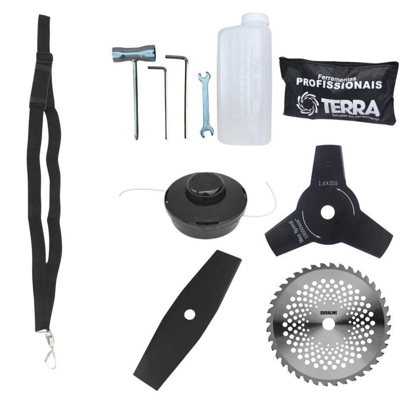 Roçadeira Profissional Lateral Terra Grhb430 á Gasolina 43cc 2t 1,7hp + Faca 3 Pontas Duraline 255mm 2,9mm + Faca 40 DeRoçadeira Profissional Lateral Terra GRHB-430 Bipartida À Gasolina 2 Tempos 43cc 1,7HP + Faca 3 Pontas + Faca 40 PontasMARCA TERRA - A ROÇADEIRA MAIS VENDIDA DO BRASIL- ROÇADEIRA POTENTE E ECONÔMICA- ALTA ROTAÇÃO E PERFORMANCE COM ECONOMIA- ASSISTÊNCIA TÉCNICA EM TODO TERRITÓRIO NACIONAL- PRODUTO COM GARANTIA OFICIAL TERRA EM TODO BRASIL- PEÇAS DE REPOSIÇÃO DE FÁCIL ACESSO- EQUIPE DE PÓS-VENDAS A DISPOSIÇÃOA Roçadeira Profissional GRHB-430 com haste Bipartida, é o mais novo modelo do mercado, trazendo inovação com seu novo eixo bipartido, podendo ser desmontada, facilitando o transporte e acomodação do produto, com motor 2 tempos à gasolina, 43 cilindradas e potência de 1,7 HP. Possui partida leve, com sistema manual, auto-retrátil, e com punhos ergonômicos de fácil aceleração e equipada com carburador universal BIGDINT de maior potência e economia.A Roçadeira Terra GRHB-430 Possui ótima relação peso-potência e o seu grande diferencial é o eixo bipartido, que permite ser facilmente transportada em pequenos espaços como porta malas de carros, bagageiro de motocicletas e entre outros. É uma máquina de fácil montagem, com apenas um clique e o encaixe da junção, ela já está pronta para o uso. Conta com um sistema de amortecimento de alto desempenho que isola o motor da transmissão, reduzindo efetivamente os níveis de vibração. Seu guidão com alças angulares, foi especialmente projetado para proporcionar uma experiência ergonômica e confortável.ESPECIFICAÇÕES TÉCNICAS:- Tipo: Roçadeira lateral, com guidão bipartido- Modelo: GRHB430- Marca: Terra- Motor: À Gasolina, 2 tempos- Potência: 1,7 HP- Cilindradas: 43cc- Rotação: 12.000 RPM- Ignição: Eletrônica- Partida: Manual Auto-retrátil- Carburador: Diafragma com Regulagem- Embreagem: Centrifuga em alumínio fundido- Capacidade do tanque de combustível: 1200ml- Autonomia: Aprox. 60min- Eixo Cardã: Eixo Bipartido de 8mm x 9 estrias- Tubo do Eixo Cardã: Tubo de Alumínio 26mm - 153cm- Guidão: Bi-Partido fixado com suportes parafusados- Combustível: Gasolina com Óleo 2 tempos, proporção 25:1- Carretel: Automático, libera o fio com um toque no chão- Peso: 9,50 kgEXTRA: LÂMINA 3 PONTAS - Tamanho: 255MM; Furo: 25,4 MM (1'')+ Anel Redutor Para 20MM; Espessura 2,9MMA faca 3 pontas pode ser aplicada para diferentes trabalhos, tendo em vista que é e Ideal trabalhos profissionais, podendo cortar em diferentes situações: Terenos com galhos, Mato Alto, Capim Grosso e Capoeira.ESPECIFICAÇÕES TÉCNICAS:- Tipo de Lâmina: 3 Lados- Quantidade de Pontas: 3- Diâmetro: 255mm- Furo: 25mm Com Redutor Para 20mm- Espessura: 2,9mmEXTRA: DISCO DE CORTE 40 DENTES VIDEA - DIÂM. 255MM X 25,4 MM (1) + Anel Redutor Para 20MM; Espessura 1,3MMPode ser aplicado para diferentes trabalhos, tendo em vista que pode serrar madeiras até 10cm, dentre elas esse modelo corta: Arbustos, Pequenas Árvores, Capim Grosso, Capim Elefante, Capim Guanxuma, Capim Annoni, Vassourinha, Bambu, Cana de Açúcar, Mato Alto, Capim Napier, Capim Sapê, Touceiras entre outros.ESPECIFICAÇÕES TÉCNICAS:- Tipo de Lâmina: Circular Vídea- Quantidade de Dentes: 40- Diâmetro: 255mm- Furo: 25mm (1'') Com Anel Redutor Para 20mm- Espessura: 2mmITENS INCLUSOS:- 01: Roçadeira GRHB430;- 01: Carretel com Nylon;- 01: Lâmina 2 pontas;- 01: Lâmina 3 pontas;- 01: Lâmina 40 pontas;- 01: Cinto;- 01: Misturador de combustível;- 01: Kit ferramentas de manutenção;- 01: Manual do Proprietário; Marca: Terra | Com sistema antivibração: Não | Motivo de GTIN vazio: O produto é um kit ou pack | Capacidade do tanque de Óleo: N/A | Tipo de guiador: Aberto | Fonte do produto: N/A | Com regulação de guiador: Sim | Sistema de partida: Manual | Comprimento total: 188cm | Com guarda de segurança: Sim | MPN: 84678900 | Capacidade do tanque de combustível: 1,0L | Largura total: 40cm | Tempos do motor: 2 | Eixo de transmissão: Reto | Peso: 11kg | Tipos de máquinas: Roçadeira | Potência do motor: 1,7HP | Cilindrada: 43cc | Tipo de eixo da máquina: Reto | Sistemas de corte: Faca e Carretel de Nylon | Acessórios incluídos: Kit ferramentas, cinto de sustentação, misturador de combustível | Condição do item: Novo | Modelo: GRHB4303P40D | Diâmetro de corte do disco de corte: 255mm | Diâmetro de corte da tanza: 255mm | SKU: GRHB4303P40D | Código universal de produto: 0703878011023 | É kit: Sim | Selo SEC: N/A
