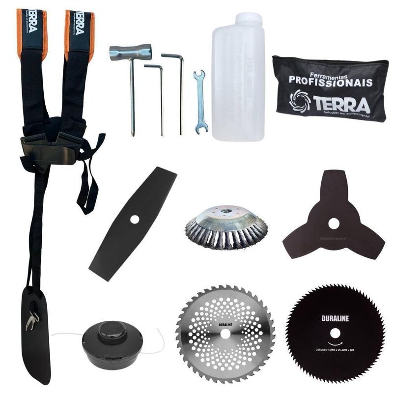 Roçadeira Profissional Terra Grh430 á Gasolina 43cc 1,7hp + Faca 2 Pontas + Faca 40 Dentes+ Faca 80 Dentes + Escova 38cRoçadeira Profissional Lateral Terra GRH-430 Black À Gasolina 2 Tempos 43cc 1,7HP + Faca 2 Pontas 330mm 2,7mm + Faca 40 Pontas 255mm 2mm + Faca 80 Pontas 255mm 1,5mm + Escova Rotativa 200mm 38 Cerdas + Óleo TOYAMA LUB FG50 500ml 2TATENÇÃO: A ROÇADEIRA É DA MARCA TERRA E ACOMPANHA UM Óleo 2T DA MARCA TOYAMAMARCA TERRA - A ROÇADEIRA MAIS VENDIDA DO BRASIL- ROÇADEIRA POTENTE E ECONÔMICA- ALTA ROTAÇÃO E PERFORMANCE COM ECONOMIA- ASSISTÊNCIA TÉCNICA EM TODO TERRITÓRIO NACIONAL- PRODUTO COM GARANTIA OFICIAL TERRA EM TODO BRASIL- PEÇAS DE REPOSIÇÃO DE FÁCIL ACESSO- EQUIPE DE PÓS-VENDAS A DISPOSIÇÃO- Óleo 2T TOYAMA LUB FG50 JASO FC Semissintético (1:50) - OBSERVE A INSTRUÇÃO DE MISTURA:Operador, instrução de mistura recomendada para a utilização da máquina com o Óleo 2T TOYAMA LUB (1:50) 500ml : Observe sempre a proporção da mistura específica deste Óleo, onde para cada 1 Litro de Gasolina utilizar 20ml do Óleo TOYAMA, ou para cada 500ml de Gasolina utilizar 10ml do Óleo TOYAMA. Além de manter o bom funcionamento, você pode prevenir futuras falhas e excesso de fumaça no cilindro de combustão.A Roçadeira Profissional GRH-430 Black conta com motor 2 tempos à gasolina, 43 cilindradas e potência de 1,7 HP. Possui partida leve, com sistema manual, auto-retrátil, e com punhos ergonômicos de fácil aceleração, equipada com carburador universal BIGDINT de maior potência e economia, e também cinto de sustentação duplo com ombreiras almofadadas, proporcionando assim um maior conforto, ergonomia e segurança ao operador.ESPECIFICAÇÕES TÉCNICAS:- Tipo: Roçadeira lateral, com guidão- Cód: 705486B- Modelo: GRH430 Black- Marca: Terra- Motor: À Gasolina, 2 tempos- Potência: 1,67HP (1,7HP)- Cilindradas: 42,7 (43cc)- Rotação: 6.500RPM- Ignição: Eletrônica- Partida: Manual Auto-retrátil- Capacidade do tanque de combustível: 1000ml- Autonomia: Aprox. 60min- Eixo Cardã: Eixo Rígido de 8mm x 9 estrias- Tubo do Eixo Cardã: Tubo de Alumínio 26mm - 153cm- Guidão: Bi-Partido fixado com suportes parafusados- Lâmina: 3 Pontas, 255mm, espessura 2mm, furo 1- Combustível: Gasolina com Óleo 2 tempos, proporção 25:1- Carretel Nylon: Automático, libera o fio com um toque no chão- Peso: 9,50 kgEXTRA: LÂMINA 2 PONTASESPECIFICAÇÕES TÉCNICAS:- Tipo de Lâmina: Facão- Quantidade de Pontas: 2- Diâmetro: 330mm- Furo: 25mm Com Redutor Para 20mm- Espessura: 2,7mmEXTRA: DISCO DE CORTE 80 DENTESESPECIFICAÇÕES TÉCNICAS:- Tipo de Lâmina: Circular- Quantidade de Dentes: 80- Diâmetro: 255mm- Furo: 25mm Com Redutor Para 20mm- Espessura: 1,5mmEXTRA: DISCO DE CORTE 40 DENTES VIDEAESPECIFICAÇÕES TÉCNICAS:- Tipo de Lâmina: Circular Vídea- Quantidade de Dentes: 40- Diâmetro: 255mm- Furo: 25mm (1'') Com Anel Redutor Para 20mm- Espessura: 2mmEXTRA: ESCOVA DE AÇO ROTATIVAESPECIFICAÇÕES TÉCNICAS:- Tipo de Escova: Rotativa com cerdas em aço- Quantidade de Cerdas: 38- Diâmetro: 200mm- Furo: 25mm Com Redutor Para 20mm- Espessura: 50mmITENS INCLUSOS:- 01: Carretel de Nylon;- 01: Lâmina 2 pontas;- 01: Lâmina 3 pontas;- 01: Lâmina 40 dentes;- 01: Lâmina 80 dentes;- 01: Escova Rotativa de Aço- 01: Óleo Toyama Lub 500ml- 01: Cinto Duplo Ergonômico com Ombreiras Almofadadas;- 01: Misturador de combustível;- 01: Kit ferramentas para manutenção;- 01: Manual de Instruções; Marca: Terra | Com sistema antivibração: Não | Selo SEC: N/A | Modelo: VAR03GRH4302408038OT | Motivo de GTIN vazio: O produto é um kit ou pack | Capacidade do tanque de Óleo: N/A | Fonte do produto: N/A | Tipo de guiador: Aberto | Com regulação de guiador: Sim | Sistema de partida: Manual | Comprimento total: 188cm | Com guarda de segurança: Sim | Capacidade do tanque de combustível: 1,0L | MPN: 84678900 | Diâmetro de corte do disco de corte: 255mm | Largura total: 40cm | Tempos do motor: 2 | Eixo de transmissão: Rígido | Peso: 12kg | Tipos de máquinas: Roçadeira | Potência do motor: 1,7HP | Cilindrada: 43cc | Tipo de eixo da máquina: Reto | Diâmetro de corte da tanza: 255mm | Sistemas de corte: Faca e Carretel de Nylon | SKU: VAR03GRH4302408038OT | Acessórios incluídos: Kit ferramentas, cinto de sustentação, misturador de combustível | Condição do item: Novo | Código universal de produto: 0703363312888 | É kit: Sim