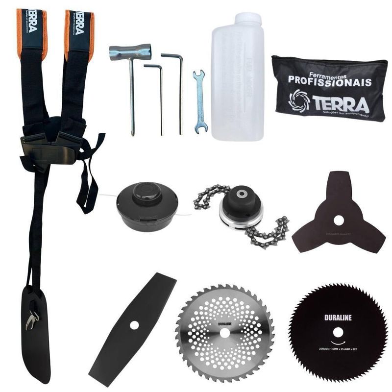 Roçadeira Profissional Terra Grh430 á Gasolina 43cc 1,7hp + Faca 2 Pontas 330mm 2,7mm + Faca 40 Dentes 255mm 2mm + FacaRoçadeira Profissional Lateral Terra GRH-430 Black À Gasolina 2 Tempos 43cc 1,7HP + Faca 2 Pontas 330mm 2,7mm + Faca 40 Dentes 255mm 2mm + Faca 80 Dentes 255mm 1,5mm + TrimmerMARCA TERRA - A ROÇADEIRA MAIS VENDIDA DO BRASIL- ROÇADEIRA POTENTE E ECONÔMICA- ALTA ROTAÇÃO E PERFORMANCE COM ECONOMIA- ASSISTÊNCIA TÉCNICA EM TODO TERRITÓRIO NACIONAL- PRODUTO COM GARANTIA OFICIAL TERRA EM TODO BRASIL- PEÇAS DE REPOSIÇÃO DE FÁCIL ACESSO- EQUIPE DE PÓS-VENDAS A DISPOSIÇÃOA Roçadeira Profissional GRH-430 Black conta com motor 2 tempos à gasolina, 43 cilindradas e potência de 1,7 HP. Possui partida leve, com sistema manual, auto-retrátil, e com punhos ergonômicos de fácil aceleração, equipada com carburador universal BIGDINT de maior potência e economia, e também cinto de sustentação duplo com ombreiras almofadadas, proporcionando assim um maior conforto, ergonomia e segurança ao operador.A Roçadeira Terra GRH430 foi projetada para facilitar o trabalho de roçada de capim, arbustos, pastagens, controle de pastos, trabalhos de jardinagem, limpeza e manutenção de grandes áreas verdes com sua utilização em sítios; fazendas e chácaras. Ideal também para manutenção e limpeza de vias públicas e rodovias.ESPECIFICAÇÕES TÉCNICAS:- Tipo: Roçadeira lateral, com guidão- Cód: 705486B- Modelo: GRH430 Black- Marca: Terra- Motor: À Gasolina, 2 tempos- Potência: 1,67HP (1,7HP)- Cilindradas: 42,7 (43cc)- Rotação: 6.500RPM- Ignição: Eletrônica- Partida: Manual Auto-retrátil- Carburador: Diafragma com Regulagem- Embreagem: Centrifuga em alumínio fundido- Capacidade do tanque de combustível: 1000ml- Autonomia: Aprox. 60min- Eixo Cardã: Eixo Rígido de 8mm x 9 estrias- Tubo do Eixo Cardã: Tubo de Alumínio 26mm - 153cm- Guidão: Bi-Partido fixado com suportes parafusados- Lâmina: 3 Pontas, 255mm, espessura 2mm, furo 1- Combustível: Gasolina com Óleo 2 tempos, proporção 25:1- Carretel Nylon: Automático, libera o fio com um toque no chão- Peso: 9,50 kgEXTRA: LÂMINA 2 PONTAS - TAMANHO: 330MM FURO: 25,4 MM (1) / 20MM ESPESSURA 2,70MMA Faca 2 Pontas da Duraline acompanha um anel de redução, ou seja, pode ser utiizada para roçadeiras de furo 20mm ou 25mm, sendo feita em aço cromo vanádio garante mais segurança, desempenho e durabilidade. As lâminas Duraline são balanceadas, fazendo com que haja menor vibração, corte contínuo e suave, com mais conforto ao operador e mais longevidade para a roçadeira.ESPECIFICAÇÕES TÉCNICAS:- Tipo de Lâmina: Facão- Quantidade de Pontas: 2- Diâmetro: 330mm- Furo: 25mm Com Redutor Para 20mm- Espessura: 2,7mmEXTRA: DISCO DE CORTE 40 DENTES VIDEA - DIÂM. 255MM X 25,4 MM (1) + Anel Redutor Para 20MM; Espessura 1,3MMPode ser aplicado para diferentes trabalhos, tendo em vista que pode serrar madeiras até 10cm, dentre elas esse modelo corta: Arbustos, Pequenas Árvores, Capim Grosso, Capim Elefante, Capim Guanxuma, Capim Annoni, Vassourinha, Bambu, Cana de Açúcar, Mato Alto, Capim Napier, Capim Sapê, Touceiras entre outros.ESPECIFICAÇÕES TÉCNICAS:- Tipo de Lâmina: Circular Vídea- Quantidade de Dentes: 40- Diâmetro: 255mm- Furo: 25mm (1'') Com Anel Redutor Para 20mm- Espessura: 2mmEXTRA: DISCO DE CORTE 80 DENTES - DIÂM. 255MM X 25,4 MM (1) + Anel Redutor Para 20MM; Espessura 1,5MMO DISCO DE CORTE 80 Dentes acompanha um anel de redução que pode ser utiizada para roçadeiras de furo 20mm ou 25mm, sendo feita em aço cromo vanádio que garante mais segurança, desempenho e durabilidade. É uma lâmina balanceada, fazendo com que haja menor vibração, corte contínuo e suave, com mais conforto ao operador e mais longevidade para a roçadeira.ESPECIFICAÇÕES TÉCNICAS:- Tipo de Lâmina: Circular- Quantidade de Dentes: 80- Diâmetro: 255mm- Furo: 25mm Com Redutor Para 20mm- Espessura: 1,5mmEXTRA: Trimmer Com Corrente de Motosserra:Dados Técnicos:- Diâmetro: 330mm- Furo: 25mm- Espessura: 60mm- Material: Lâminas corrente de motosserraITENS INCLUSOS:- 01: Carretel de Nylon;- 01: Lâmina 2 pontas;- 01: Lâmina 3 pontas;- 01: Lâmina 40 dentes;- 01: Lâmina 80 dentes;- 01: Trimmer- 01: Cinto Duplo Ergonômico com Ombreiras Almofadadas;- 01: Misturador de combustível;- 01: Kit ferramentas para manutenção;- 01: Manual de Instruções; Marca: Terra | Com sistema antivibração: Não | Selo SEC: N/A | Modelo: VAR05GRH4302P40D80DTM | Motivo de GTIN vazio: O produto é um kit ou pack | Capacidade do tanque de Óleo: N/A | Fonte do produto: N/A | Tipo de guiador: Aberto | Com regulação de guiador: Sim | Sistema de partida: Manual | Comprimento total: 188cm | Com guarda de segurança: Sim | Capacidade do tanque de combustível: 1,0L | MPN: 84678900 | Diâmetro de corte do disco de corte: 255mm | Largura total: 40cm | Tempos do motor: 2 | Eixo de transmissão: Rígido | Peso: 12kg | Tipos de máquinas: Roçadeira | Potência do motor: 1,7HP | Cilindrada: 43cc | Tipo de eixo da máquina: Reto | Diâmetro de corte da tanza: 255mm | Sistemas de corte: Faca e Carretel de Nylon | SKU: VAR05GRH4302P40D80DTM | Acessórios incluídos: Kit ferramentas, cinto de sustentação, misturador de combustível | Condição do item: Novo | Código universal de produto: 0703363312567 | É kit: Sim