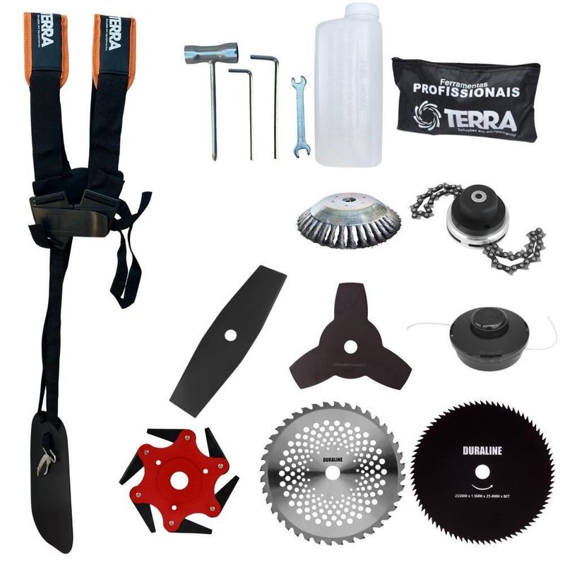 Roçadeira Terra Grh430 á Gasolina 43cc 1,7hp + Faca 2 Pontas + Faca 40 Dentes + Faca 80 Dentes + Faca 6 Pontas + EscovaRoçadeira Profissional Lateral Terra GRH-430 Black À Gasolina 2 Tempos 43cc 1,7HP + Faca 2 Pontas 330mm 2,7mm + Faca 40 Dentes 255mm 2mm + Faca 80 Dentes 255mm 1,5mm + Faca 6 Pontas 250mm + Escova Rotativa 200mm 38 Cerdas + Trimmer + Óleo TOYAMA LUB FG50 500ml 2TATENÇÃO: A ROÇADEIRA É DA MARCA TERRA E ACOMPANHA UM Óleo 2T DA MARCA TOYAMAMARCA TERRA - A ROÇADEIRA MAIS VENDIDA DO BRASIL- ROÇADEIRA POTENTE E ECONÔMICA- ALTA ROTAÇÃO E PERFORMANCE COM ECONOMIA- ASSISTÊNCIA TÉCNICA EM TODO TERRITÓRIO NACIONAL- PRODUTO COM GARANTIA OFICIAL TERRA EM TODO BRASIL- PEÇAS DE REPOSIÇÃO DE FÁCIL ACESSO- EQUIPE DE PÓS-VENDAS A DISPOSIÇÃO- Óleo 2T TOYAMA LUB FG50 JASO FC Semissintético (1:50) - OBSERVE A INSTRUÇÃO DE MISTURA:Operador, instrução de mistura recomendada para a utilização da máquina com o Óleo 2T TOYAMA LUB (1:50) 500ml : Observe sempre a proporção da mistura específica deste Óleo, onde para cada 1 Litro de Gasolina utilizar 20ml do Óleo TOYAMA, ou para cada 500ml de Gasolina utilizar 10ml do Óleo TOYAMA. Além de manter o bom funcionamento, você pode prevenir futuras falhas e excesso de fumaça no cilindro de combustão.A Roçadeira Profissional GRH-430 Black conta com motor 2 tempos à gasolina, 43 cilindradas e potência de 1,7 HP. Possui partida leve, com sistema manual, auto-retrátil, e com punhos ergonômicos de fácil aceleração, equipada com carburador universal BIGDINT de maior potência e economia, e também cinto de sustentação duplo com ombreiras almofadadas, proporcionando assim um maior conforto, ergonomia e segurança ao operador.A Roçadeira Terra GRH430 foi projetada para facilitar o trabalho de roçada de capim, arbustos, pastagens, controle de pastos, trabalhos de jardinagem, limpeza e manutenção de grandes áreas verdes com sua utilização em sítios; fazendas e chácaras. Ideal também para manutenção e limpeza de vias públicas e rodovias.ESPECIFICAÇÕES TÉCNICAS:- Tipo: Roçadeira lateral, com guidão- Cód: 705486B- Modelo: GRH430 Black- Marca: Terra- Motor: À Gasolina, 2 tempos- Potência: 1,67HP (1,7HP)- Cilindradas: 42,7 (43cc)- Rotação: 6.500RPM- Ignição: Eletrônica- Partida: Manual Auto-retrátil- Carburador: Diafragma com Regulagem- Embreagem: Centrifuga em alumínio fundido- Capacidade do tanque de combustível: 1000ml- Autonomia: Aprox. 60min- Eixo Cardã: Eixo Rígido de 8mm x 9 estrias- Tubo do Eixo Cardã: Tubo de Alumínio 26mm - 153cm- Guidão: Bi-Partido fixado com suportes parafusados- Lâmina: 3 Pontas, 255mm, espessura 2mm, furo 1- Combustível: Gasolina com Óleo 2 tempos, proporção 25:1- Carretel Nylon: Automático, libera o fio com um toque no chão- Peso: 9,50 kgEXTRA: LÂMINA 2 PONTAS - TAMANHO: 330MM FURO: 25,4 MM (1) / 20MM ESPESSURA 2,70MMESPECIFICAÇÕES TÉCNICAS:- Tipo de Lâmina: Facão- Quantidade de Pontas: 2- Diâmetro: 330mm- Furo: 25mm Com Redutor Para 20mm- Espessura: 2,7mmEXTRA: DISCO DE CORTE 40 DENTES VIDEA - DIÂM. 255MM X 25,4 MM (1) + Anel Redutor Para 20MM; Espessura 1,3MMESPECIFICAÇÕES TÉCNICAS:- Tipo de Lâmina: Circular Vídea- Quantidade de Dentes: 40- Diâmetro: 255mm- Furo: 25mm (1'') Com Anel Redutor Para 20mm- Espessura: 2mmEXTRA: DISCO DE CORTE 80 DENTES - DIÂM. 255MM X 25,4 MM (1) + Anel Redutor Para 20MM; Espessura 1,5MMESPECIFICAÇÕES TÉCNICAS:- Tipo de Lâmina: Circular- Quantidade de Dentes: 80- Diâmetro: 255mm- Furo: 25mm Com Redutor Para 20mm- Espessura: 1,5mmEXTRA: Lâminia 6 Pontas Terra:ESPECIFICAÇÕES TÉCNICAS:Dados Técnicos:- Diâmetro: 250mm- Furo: 25mm- Espessura: 0,5mm- Material: Lâminas de metalEXTRA: ESCOVA DE AÇO ROTATIVAESPECIFICAÇÕES TÉCNICAS:- Tipo de Escova: Rotativa com cerdas em aço- Quantidade de Cerdas: 38- Diâmetro: 200mm- Furo: 25mm Com Redutor Para 20mm- Espessura: 50mmEXTRA: Trimmer Com Corrente de Motosserra:Dados Técnicos:- Diâmetro: 330mm- Furo: 25mm- Espessura: 60mm- Material: Lâminas corrente de motosserraITENS INCLUSOS:- 01: Carretel de Nylon;- 01: Lâmina 2 pontas;- 01: Lâmina 3 pontas;- 01: Lâmina 6 pontas- 01: Lâmina 40 dentes;- 01: Lâmina 80 dentes;- 01: Escova Rotativa de Aço- 01: Trimmer- 01: Óleo Toyama Lub 500ml- 01: Cinto Duplo Ergonômico com Ombreiras Almofadadas;- 01: Misturador de combustível;- 01: Kit ferramentas para manutenção;- 01: Manual de Instruções; Marca: Terra | Com sistema antivibração: Não | Selo SEC: N/A | Modelo: VAR04GRH43024080638TOT | Motivo de GTIN vazio: O produto é um kit ou pack | Capacidade do tanque de Óleo: N/A | Fonte do produto: N/A | Tipo de guiador: Aberto | Com regulação de guiador: Sim | Sistema de partida: Manual | Comprimento total: 188cm | Com guarda de segurança: Sim | Capacidade do tanque de combustível: 1,0L | MPN: 84678900 | Diâmetro de corte do disco de corte: 255mm | Largura total: 40cm | Tempos do motor: 2 | Eixo de transmissão: Rígido | Peso: 12kg | Tipos de máquinas: Roçadeira | Potência do motor: 1,7HP | Cilindrada: 43cc | Tipo de eixo da máquina: Reto | Diâmetro de corte da tanza: 255mm | Sistemas de corte: Faca e Carretel de Nylon | SKU: VAR04GRH43024080638TOT | Acessórios incluídos: Kit ferramentas, cinto de sustentação, misturador de combustível | Condição do item: Novo | Código universal de produto: 0703363313052 | É kit: Sim