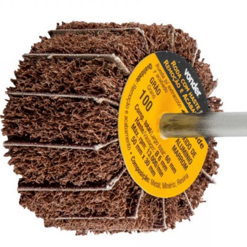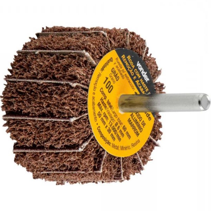 Marca: VonderConteúdo da embalagem:1 Roda com haste.Destaques e diferenciais:Maior poder de remoção e menor poder de acabamento.Aplicações e dicas de uso:Indicada para remoção e acabamento de superfícies metálicas como aço, aço inoxidável, ferro, latão, cobre, alumínio. Use com Retificadeira Reta.Detalhes TécnicosDiâmetro externo da roda abrasiva: 80,0 mm Largura da roda abrasiva: 50,0 mm Comprimento total: 90 mm Grão: G 100 Tipo de grão abrasivo: Óxido de alumínio marrom Rotação máxima: 6.000/min Diâmetro da haste da roda abrasiva (pol - mm): 6,0 mm Massa aproximada (peso) (kg): 0,144 kg Garantia - E (CDC):Garantia legal: 90 dias