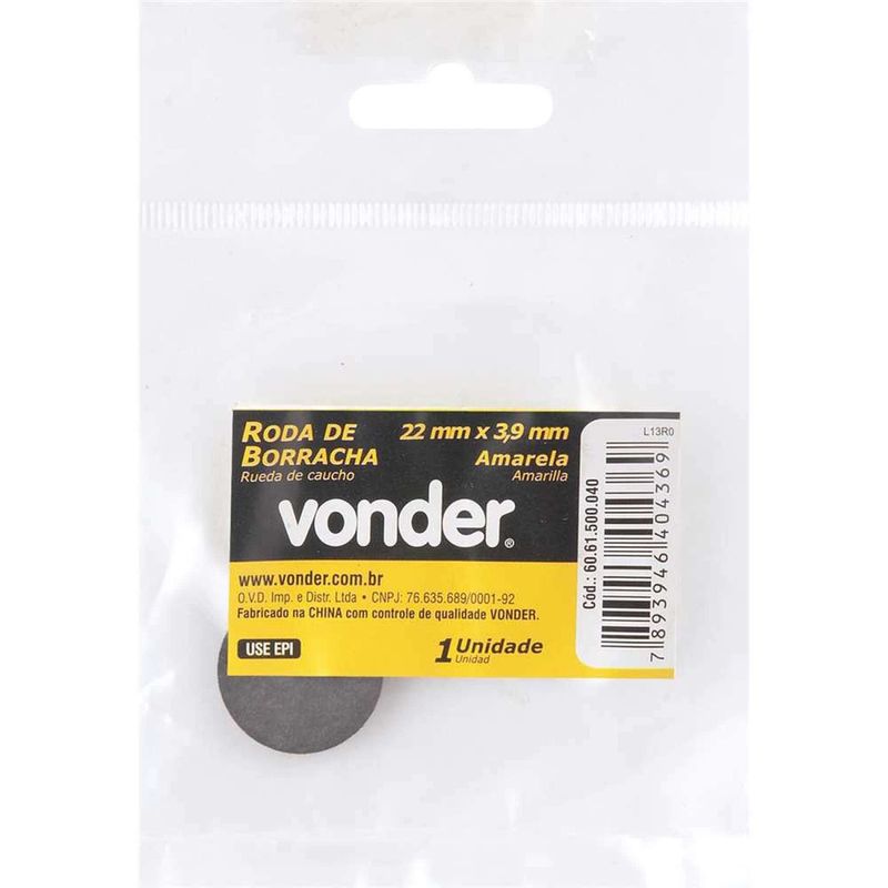 Roda de Borracha Para Microrretífica 22 mm x 3,9 mm, Vonder OstenVonder - Conteúdo da embalagem: 1 Roda de borracha. Aplicação: Indicada para polimentos em geral. Destaques: Referência: 6061500040 Garantia - E (CDC): Garantia legal: 90 dias Diâmetro: 22 mm Largura da borracha: 3,9 mm Aplicação Comercial: Indicada para polimentos em geral. Características Gerais do Produto: Garantia: • 3 Meses