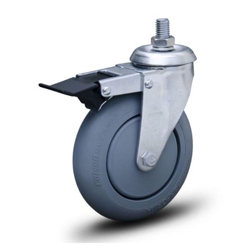 Rodízio Performa Giratório Com Freio 5 Polegadas Com EspigaResistente à corrosão, boa mobilidade, baixo ruído, maciez e conforto, além de não marcar o piso. Material exclusivo com alta resistência ao desgaste. Proporciona trabalho silencioso com a absorção de vibrações e proteção ao piso e à carga, ainda permite facilidade e conforto em manobras manuais.Rodízios para cargas leves em móveis e acessórios de utilidades para o comercio, indústrias e centros logísticos.Roda:Banda em material termoplástico macio (cinza), núcleo e calotas em polipropileno (Cinza) e rolamento. Dureza 75 Shore A (-40°C a 50°C).Garfo:Em aço com 2,65 mm de espessura, acabamento zincado branco e dupla pista de esfera.Especificações FLE 512 PER E:Capacidade: 100kgModelo: giratório com freioDiâmetro: 5 PolegadasLargura da banda da roda: 1.1/4 PolegadasComnto do cubo: 38mmTipo de rodagem: esferasRaio de giro do rodízio: 100mmAltura total: 160mmParafuso do eixo: 5/16