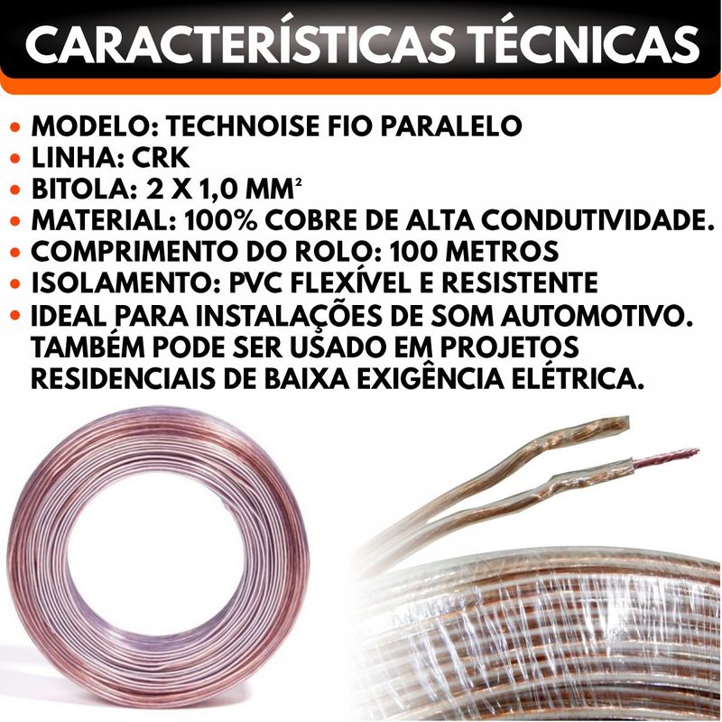 Rolo Fio Paralelo Technoise CRK 100% Cobre - 2 x 1,0mm (100 Metros) O Rolo de Fio Paralelo CRK Technoise 2 x 1,0mm, com 100 metros, é ideal para quem busca funcionalidade e confiabilidade em instalações elétricas e de som. Produzido com condutores 100% em cobre de alta condutividade, garante menor perda de sinal, melhor desempenho e resistência superior à oxidação. Sua estrutura flexível e bem isolada facilita a instalação e proporciona maior durabilidade, sendo uma excelente escolha para projetos residenciais, automotivos e comerciais de menor exigência técnica, sem abrir mão da qualidade. Especificações Técnicas: • Marca: Technoise • Linha: CRK • Tipo: Fio paralelo • Bitola: 2 x 1,0 mm² • Material do condutor: 100% cobre de alta condutividade. • Comprimento do rolo: 100 metros • Isolamento: PVC flexível e resistente • Tensão máxima de operação: 300V • Temperatura máxima de trabalho: até 70°C • Aplicações: Ideal para instalações de som automotivo. Também pode ser usado em projetos residenciais de baixa exigência elétrica. Conteúdo da Embalagem: • 01 Rolo Fio Paralelo Technoise CRK 100% Cobre - 2 x 1,0mm 100m Importante: • Garantia de 90 Dias. • Valor Unitário.