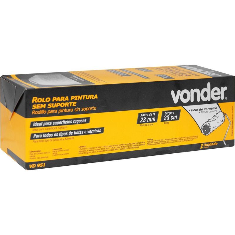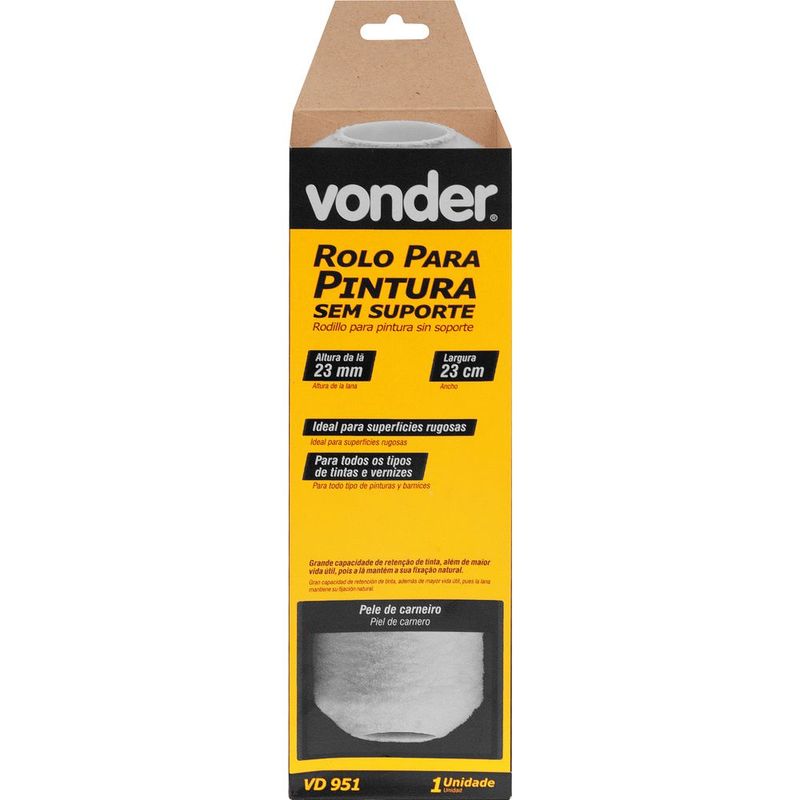 Marca: VonderConteúdo da Embalagem:1 Rolo para pinturaDestaques e diferenciais:Grande capacidade de retenção de tinta, além de maior vida útil, pois a lã mantém a sua fixação natural, conferindo maior resistênciaAplicações e dicas de uso:Indicado para todos os tipos de tintas e vernizes. Ideal para superfícies rugosas.Características Técnicas:Largura do rolo para pintura: 23 cm Material do rolo para pintura: Pele de carneiro com lã natural Suporte do rolo para pintura: Sem suporte
