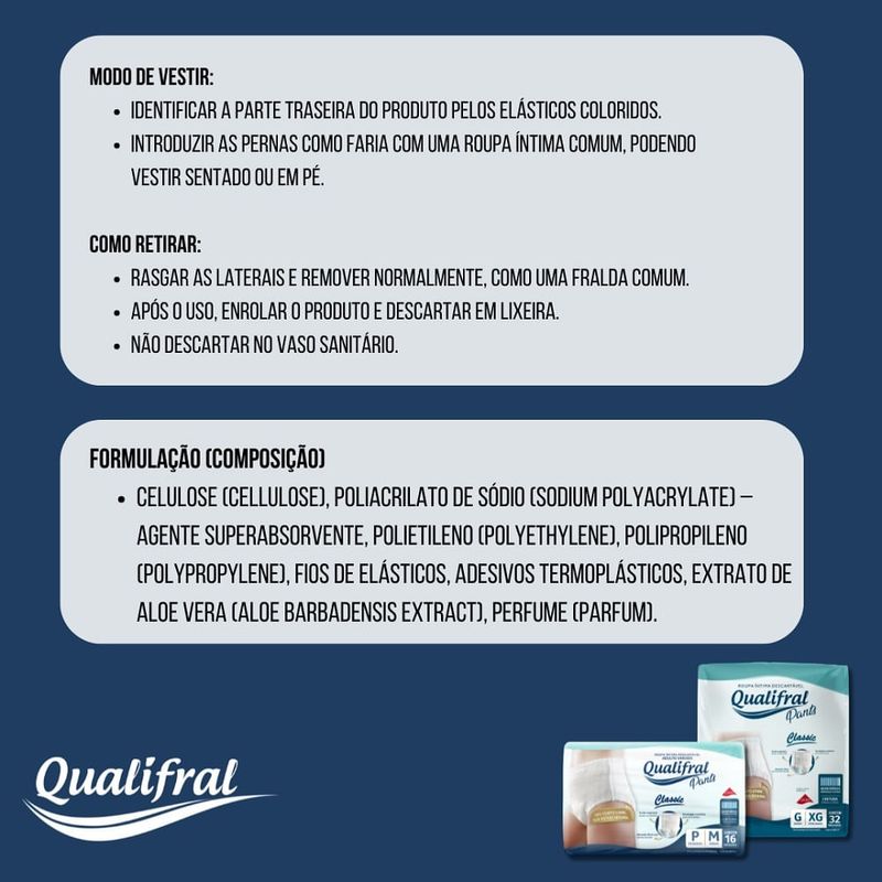 Roupa Íntima Descartável Qualifral Classic Pants P/M 32 Unidades A Roupa Íntima Descartável Qualifral Classic Pants P/M é a solução ideal para quem busca segurança em produtos de higiene pessoal aliada a conforto e praticidade no dia a dia. Indicada para incontinência urinária moderada a severa, ela foi desenvolvida para oferecer proteção eficaz, sem abrir mão da discrição e da liberdade de movimentos. Com tecido respirável, essa roupa íntima descartável ajuda a manter a pele seca e protegida, reduzindo o risco de irritações e promovendo maior bem-estar. O ajuste anatômico com Lycra garante caimento perfeito ao corpo, vestindo como uma roupa íntima comum, ideal para quem deseja manter uma rotina ativa com total confiança. A alta absorção com tecnologia antiodor proporciona controle eficiente de vazamentos e neutralização de odores, oferecendo mais tranquilidade ao usuário ao longo do dia. Além disso, suas laterais rasgáveis facilitam a retirada e o descarte, tornando o uso prático tanto para o usuário quanto para cuidadores. Benefícios e Diferenciais Unissex: indicada para homens e mulheres Indicação: incontinência urinária moderada a severa Tecido respirável: mais conforto e cuidado com a pele Ajuste anatômico com Lycra: veste como roupa íntima comum Alta absorção com tecnologia antiodor: segurança e discrição no uso diário Fácil de vestir e retirar: laterais rasgáveis para descarte prático Ideal para uso diário, promovendo autonomia e qualidade de vida A Qualifral Classic Pants P/M com 32 unidades é uma escolha inteligente para quem procura roupa íntima descartável de alta absorção, desenvolvida com foco em segurança, higiene e conforto.