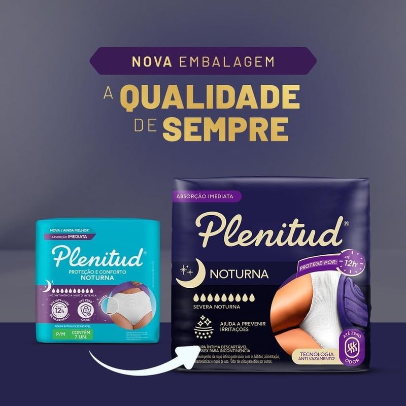 O que é a roupa íntima descartável Plenitud Noturna? A Plenitud Noturna é uma roupa íntima descartável projetada com cintura elástica, oferecendo praticidade no vestir e tirar. Com alta capacidade de absorção de urina, é ideal para garantir conforto e segurança durante a noite, contando ainda com tecnologia avançada para controle de odores, proporcionando frescor e tranquilidade. Tamanho disponível: G/XG. Para que serve a Plenitud Noturna? A Plenitud Noturna foi especialmente desenvolvida para adultos com mobilidade reduzida e que enfrentam incontinência urinária severa à noite. Seu design inclui uma barreira protetora eficaz que evita vazamentos, além de uma tecnologia que neutraliza odores, oferecendo proteção máxima e discrição durante o sono. Principais benefícios da Plenitud Noturna Perfeita para adultos com mobilidade limitada.Ideal para o controle de incontinência severa noturna.Cintura elástica que facilita o uso e remoção.Alta absorção e tecnologia avançada de controle de odores.Facilita os cuidados de familiares e cuidadores.Barreira protetora que previne vazamentos.Neutralização eficaz de odores, garantindo discrição. Como usar a roupa íntima Plenitud Noturna? Identifique a parte traseira pela marcação indicada.Coloque as pernas nas aberturas, sentado ou em pé, e puxe suavemente, como uma roupa íntima comum.Para remover, basta rasgar as laterais e descartar o produto no lixo.Composição: Celulose, poliacrilato de sódio, polipropileno, polietileno, pegoterato, elásticos e adesivos termoplásticos. Recomenda-se verificar a lista de ingredientes na embalagem para garantir compatibilidade com seu uso, pois a composição pode variar conforme o fabricante. Advertências Produto composto por materiais atóxicos, minimizando o risco de irritações. Caso ocorra algum desconforto, suspenda o uso e consulte um médico.Mantenha fora do alcance de crianças e animais.Armazene em local seco, fresco e longe da luz solar direta.Uso único. Descarte após o uso.Nunca descarte o produto no vaso sanitário.