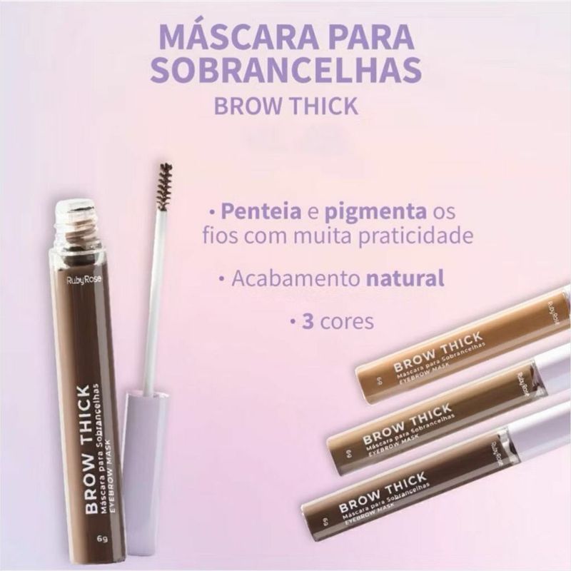 Ruby Rose Máscara de Sobrancelha Brow Thick HBF2800 6g: Definição e Volume para um Olhar MarcanteIntroduçãoApresentamos a Máscara de Sobrancelha Brow Thick HBF2800 da Ruby Rose, a solução ideal para sobrancelhas impecáveis. Este produto inovador foi desenvolvido para definir, destacar e preencher os fios com extrema praticidade, realçando a beleza do seu olhar. Com sua fórmula de alta performance, a Brow Thick penteia e pigmenta, garantindo um acabamento natural e duradouro.Modo de UsarPara aplicar a Máscara de Sobrancelha Brow Thick, utilize o pincel aplicador. Com movimentos suaves, distribua o produto sobre as sobrancelhas, preenchendo as falhas e modelando os fios conforme desejado para um acabamento perfeito.BenefíciosA Máscara de Sobrancelha Brow Thick Ruby Rose oferece múltiplos benefícios para suas sobrancelhas. Ela define e destaca o contorno natural, penteia os fios, mantendo-os no lugar, e pigmenta para um preenchimento uniforme. O resultado é um olhar mais expressivo e realçado, com praticidade no dia a dia. Este produto é cruelty-free, reforçando o compromisso da marca.IndicaçãoA Máscara de Sobrancelha Brow Thick HBF2800 é indicada para todos que buscam sobrancelhas mais definidas, preenchidas e com volume. É ideal para quem deseja realçar o olhar de forma prática e eficiente, seja para corrigir pequenas falhas ou para um look mais elaborado. Disponível em três tonalidades (light, medium e dark), adapta-se a diferentes tons de pele e cabelo, garantindo um resultado natural e personalizado.Sobre NósNa Negabella, você encontra produtos de maquiagem de alta qualidade, como a Máscara de Sobrancelha Brow Thick Ruby Rose, selecionados para realçar sua beleza com inovação e praticidade. Nosso compromisso é oferecer uma experiência de compra excepcional, com itens que superam suas expectativas. Se sua compra for um presente, informe-nos após a finalização para que possamos enviar a embalagem adequada.