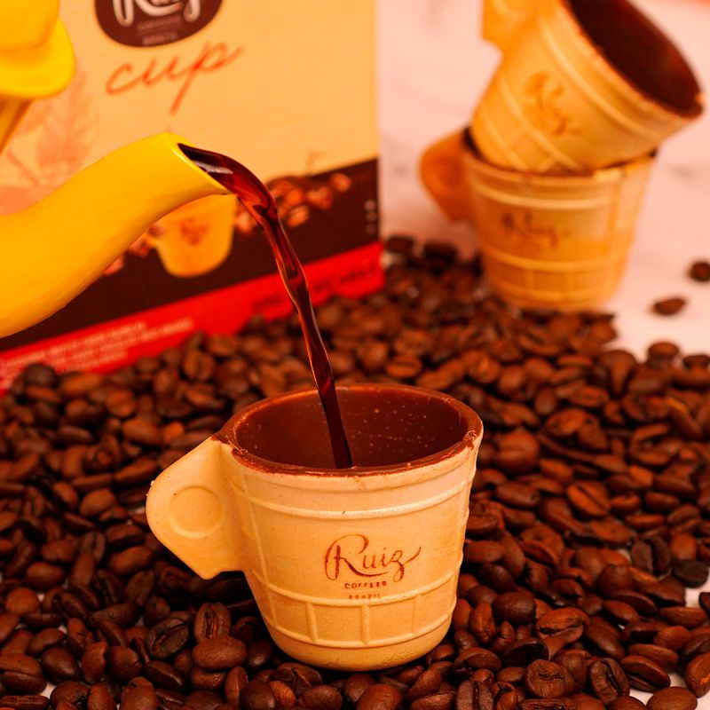 Ruiz Cup - Casquinha Crocante com Chocolate - 06 xícaras O Cup é um jeito novo e diferente de deixar o seu Ruiz Coffees ainda mais gostoso. Uma xícara feita de casquinha de sorvete e coberta com um delicioso chocolate por dentro. Você toma o seu café com um sabor especial e depois a xícara se transforma em sobremesa. A sua paixão por café também é a nossa Há 90 anos, cultivamos nas fazendas da nossa família a tradição dos melhores aromas, desde o plantio à colheita, e agora até a embalagem. Somos um dos maiores produtores do mundo e mantemos o controle de cada etapa, garantindo uma seleção rigorosa dos grãos para que você tenha sempre o café mais saboroso na sua xícara. Conservação Manter em local seco e fresco. Após cada consumo, fechar a embalagem para manter as casquinhas crocantes. INGREDIENTES: Casquinha waffer (fécula de mandioca, farinha de trigo fortificada com ferro e ácido fólico, açúcar, clara de ovo desidratada, gordura vegetal, fibra de trigo, sal, emulsificante lecitina de soja (Agrobacterium tumefaciens) e aromatizante), cobertura sabor chocolate meio amargo (açúcar, gordura vegetal fracionada, cacau em pó, sal, emulsificantes lecitina de soja (Agrobacterium tumefaciens) e polirricinoleato de poliglicerol e aromatizante). ALÉRGICOS: CONTÉM DERIVADOS DE OVO, TRIGO E SOJA. PODE CONTER CEVADA, CENTEIO, AVEIA E LEITE. CONTÉM GLÚTEN. CONTÉM LACTOSE.