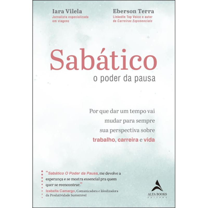 A Grande Resignação, fenômeno que levou milhares de profissionais a pedirem demissão, acendeu um sinal de alerta no mercado de trabalho: ninguém está mais disposto a arriscar a própria saúde mental por um emprego. O caminho que muitos escolhem é pausar a vida profissional por um tempo para viver outras experiências, que não cabem em uma rotina frenética e sem sentido. ?Sabático O Poder da Pausa provocou uma revolução dentro de mim. Me reconectou com a Tati de anos atrás, quando passei por um período sabático de 10 meses. Não foi exatamente planejado, e sim impulsionado por uma demissão e pelo câncer do meu pai. Dar um tempo na carreira e dedicar tempo para minha família foi a melhor decisão que já tomei na vida. Avaliei o que me fazia feliz e reencontrei o meu propósito empreendendo. Já pensou o impacto positivo na sua vida se você decidir fazer um também???Tatiana Pimenta, Fundadora e CEO da Vittude ?Vivemos em um contexto social que ignora a prevenção na maior parte do tempo, justamente por falta dele. Mas em detrimento do trabalho, ao mesmo tempo, reclama dos custos e consequências de uma vida de negligências com a saúde e com a necessidade de mais tempo. Por experiência própria posso dizer que é muito melhor cuidar da saúde enquanto há saúde e isso significa reconhecer os sinais, internos e externos, e desacelerar para continuar o movimento. Por isso, Sabático O Poder da Pausa, me devolve a esperança e se mostra essencial pra quem quer se reencontrar. Eberson e Iara são profundos e sensíveis com as palavras para conduzir o leitor à principal viagem da vida. Para dentro!??Izabella Camargo, Comunicadora e Idealizadora da Produtividade Sustentável