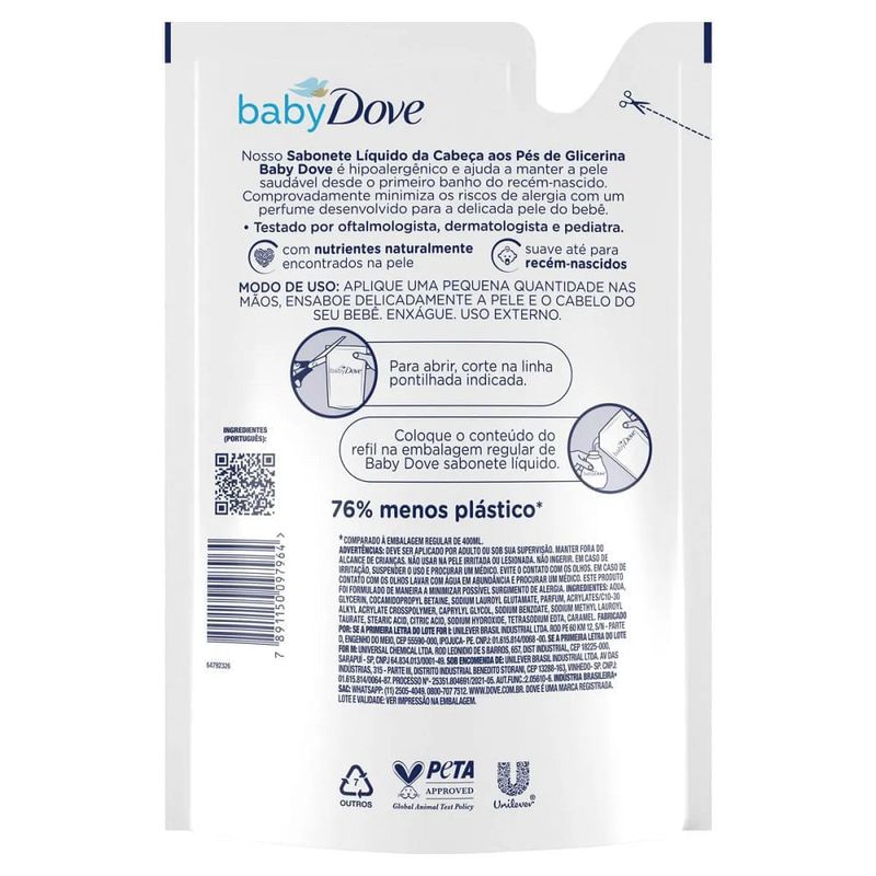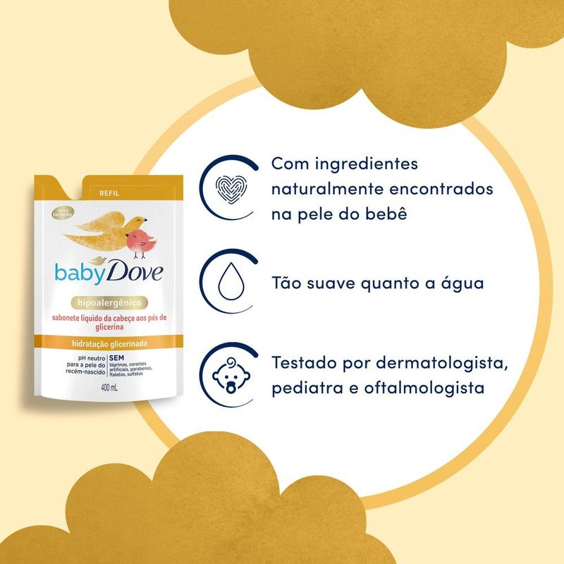 Sabonete Líquido Dove Baby Hidratação Glicerinada Refil 400ml Para que serve o Sabonete Líquido Dove Baby Hidratação Glicerinada Refil 400ml? O Sabonete Líquido Dove Baby Hidratação Glicerinada é ideal para garantir uma limpeza suave e hidratação profunda para a pele delicada do seu bebê. Com uma fórmula rica em glicerina, ele mantém a umidade natural da pele, proporcionando maciez e conforto. Dermatologicamente testado e hipoalergênico, este sabonete é perfeito para o uso diário, cuidando da pele do seu pequeno desde os primeiros dias de vida. Como usar o Sabonete Líquido Dove Baby Hidratação Glicerinada Refil 400ml? Aplique uma pequena quantidade do sabonete nas mãos ou em uma esponja, faça espuma e massageie suavemente sobre a pele do bebê. Enxágue em seguida. Para melhores resultados, use durante o banho diário. Composição Glicerina, Ácido Lático, Extrato de Camomila e outros ingredientes suaves. Advertências Uso externo. Não ingerir. Evite contato com os olhos; em caso de contato, enxágue abundantemente. Suspenda o uso em caso de irritação e consulte um pediatra. Mantenha fora do alcance de crianças. Principais Benefícios Limpeza suave Hidratação profunda Fórmula hipoalergênica Ideal para a pele delicada do bebê Dermatologicamente testado