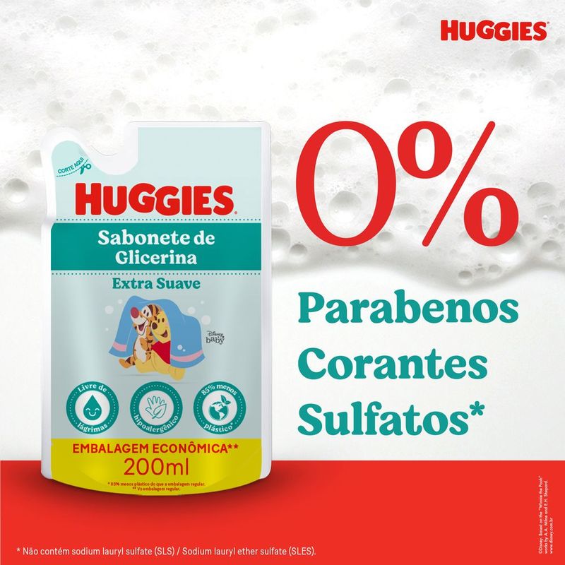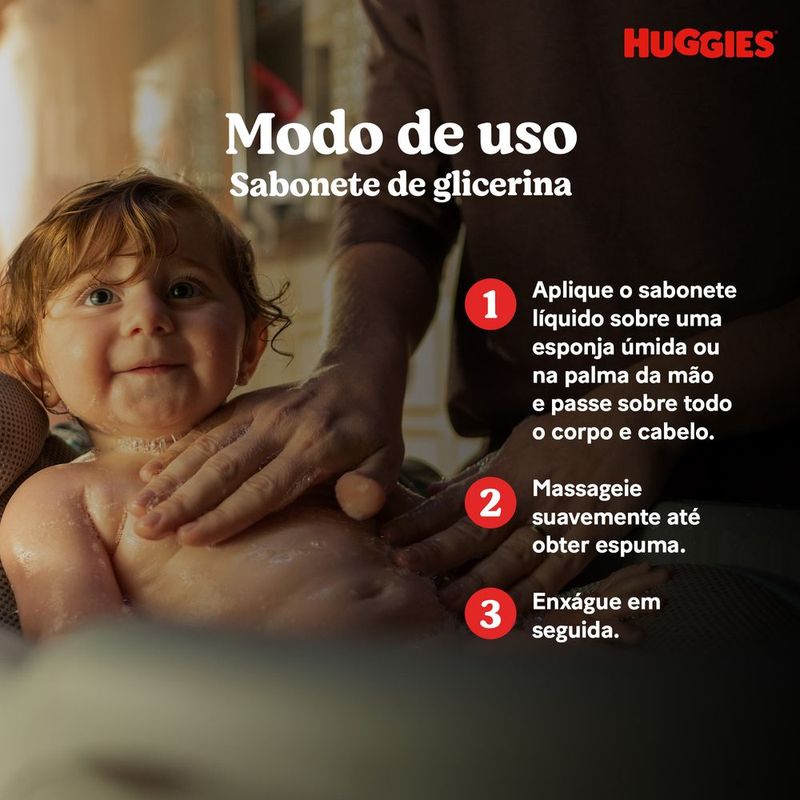 Sabonete Líquido Huggies Extra Suave Refil 200ml O Sabonete Líquido Extra Suave da Huggies é um avanço no cuidado diário do seu bebê. Sua fórmula renovada, com glicerina e ingredientes de origem natural, foi desenvolvida para deixar a pele do seu bebê mais macia e naturalmente hidratada*. Pensado para o bem-estar dos pequeninos, inclusive os recém-nascidos, este sabonete é perfeito para peles sensíveis. Livre de lágrimas e hipoalergênico, garante um banho seguro e prazeroso da cabeça aos pés, evitando irritações nos olhos e na pele. Dermatologicamente testado e sem sulfatos**, parabenos e corantes, este sabonete cuida da pele do seu bebê, protegendo-a da secura e mantendo seu pH balanceado para uma limpeza delicada desde o primeiro dia de vida. Além disso, sua embalagem é 100% reciclável, cuidando também do nosso planeta. Com Huggies, cada banho se torna uma experiência de cuidado e amor, permitindo que seu bebê cresça saudável e feliz. *Considerando a pele sem o uso de sabonete com ingredientes suaves que protegem a pele da secura. **Não contém Lauril Sulfato de Sódio (SLS) / Lauril Éter Sulfato de Sódio (SLES). Características e benefícios COM INGREDIENTES DE ORIGEM NATURAL: Sua fórmula é enriquecida com glicerina e ingredientes de origem natural, hidrata e suaviza a pele do bebê sem causar irritações. PELE MAIS MACIA: O sabonete de glicerina foi formulado para limpar suavemente a pele do seu bebê, deixando-a macia e naturalmente hidratada*. *Comparado com uma pele que não utiliza sabonete com ingredientes suaves que protegem contra o ressecamento. LIVRE DE LÁGRIMAS: Sua fórmula livre de lágrimas e hipoalergênica garante um banho agradável, evitando irritações nos olhos e na pele do seu bebê. DERMATOLOGICAMENTE TESTADO: Dermatologicamente testado, livre de sulfatos*, parabenos e corantes, protege a pele do bebê desde os primeiros dias. *Não contém Lauril Sulfato de Sódio (SLS) / Lauril Éter Sulfato de Sódio (SLES). IDEAL PARA RECÉM-NASCIDOS: Este sabonete foi pensado especialmente para peles sensíveis. Limpa profundamente sem comprometer a hidratação natural dos pequenos. Seguro desde os primeiros dias de vida. QUALIDADE HUGGIES: Huggies, a marca em que você confia, graças aos seus produtos de alta qualidade projetados para garantir a segurança, conforto e bem-estar do seu bebê em cada fase do seu crescimento. Como usar Aplique uma pequena quantidade de sabonete líquido nas mãos ou na esponja. Massageie suavemente até formar espuma. Enxágue bem com água morna, garantindo que a pele do bebê fique limpa e hidratada. Armazenamento Armazenar em local fresco, protegido da luz direta e fora do alcance de crianças. Compre online na Farmácia Indiana! Experimente as substâncias e proteção do Sabonete Líquido Huggies Extra Suave Refil 200ml para a pele do seu bebê!