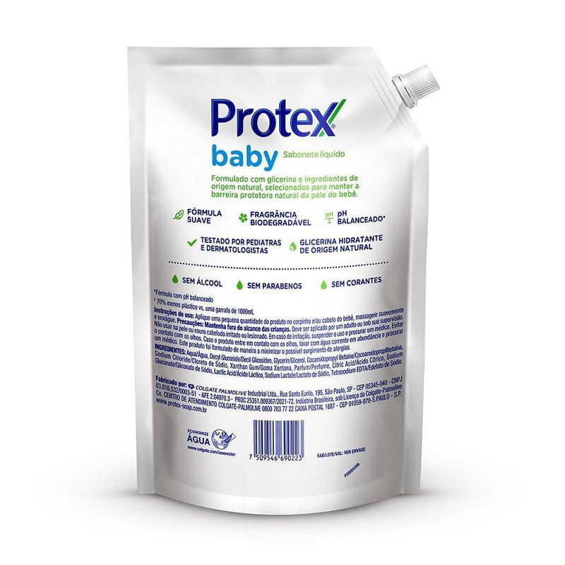 Sabonete Líquido Infantil Protex Baby Glicerina Refil 800ml Para que serve? O Sabonete Líquido Infantil Protex Baby Glicerina Refil 800ml é ideal para a pele delicada dos bebês. Enriquecido com glicerina, proporciona limpeza suave enquanto hidrata e protege contra o ressecamento. Sua fórmula dermatologicamente testada é livre de parabenos, corantes e álcool, garantindo um cuidado seguro e eficaz desde os primeiros dias de vida. Com ação antibacteriana, ajuda a proteger a pele do bebê contra germes e bactérias, deixando-a macia e saudável. Como usar? Aplique uma pequena quantidade de sabonete líquido nas mãos ou diretamente na pele úmida do bebê. Espalhe suavemente, formando uma espuma leve, e enxágue completamente com água. Composição Aqua, Sodium Laureth Sulfate, Cocamidopropil Betaine, Glycerin, Parfum, Sodium Chloride, entre outros. Advertências Uso externo. Evite contato com os olhos; em caso de contato, enxágue abundantemente com água. Mantenha fora do alcance de crianças. Suspenda o uso em caso de alergia ou alergia e procure orientação médica. Principais Benefícios Limpeza suave para a pele delicada do bebê Enriquecido com glicerina, hidratando e protegendo contra o ressecamento Fórmula sem parabenos, corantes e álcool Ação antibacteriana para proteção extra Dermatologicamente testado Compre online na Farmácia Indiana!