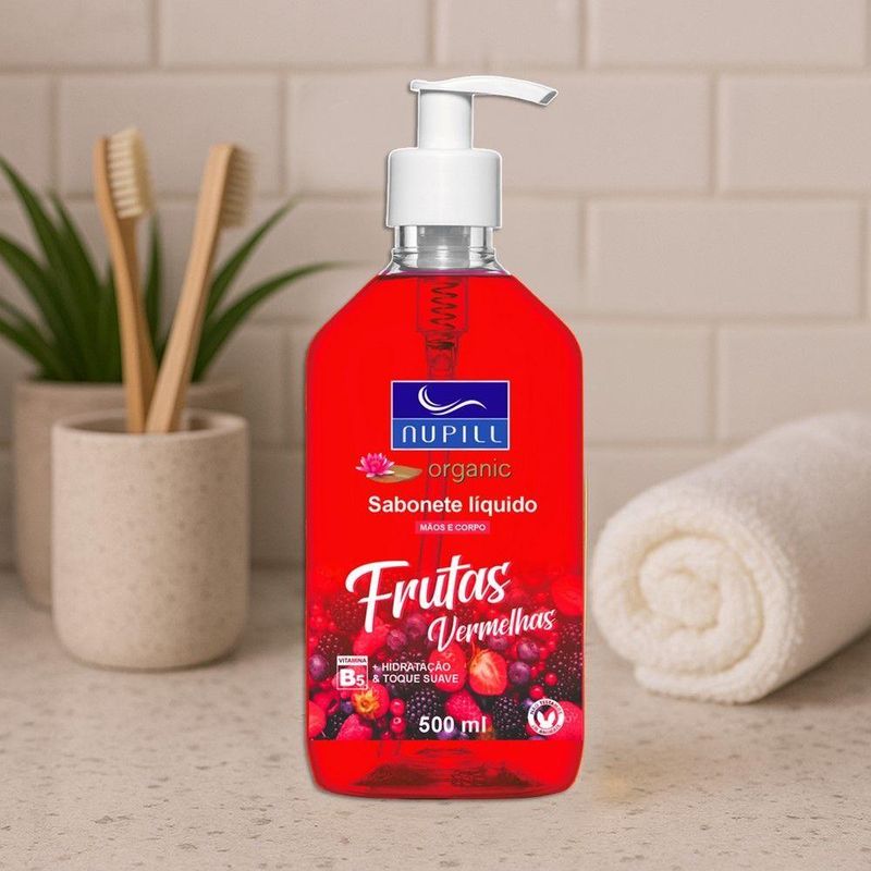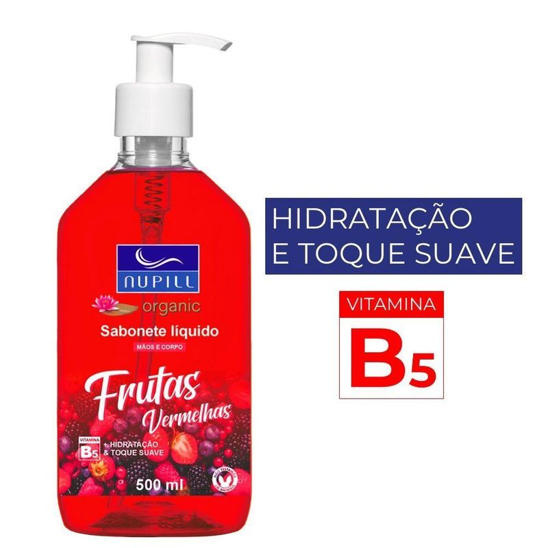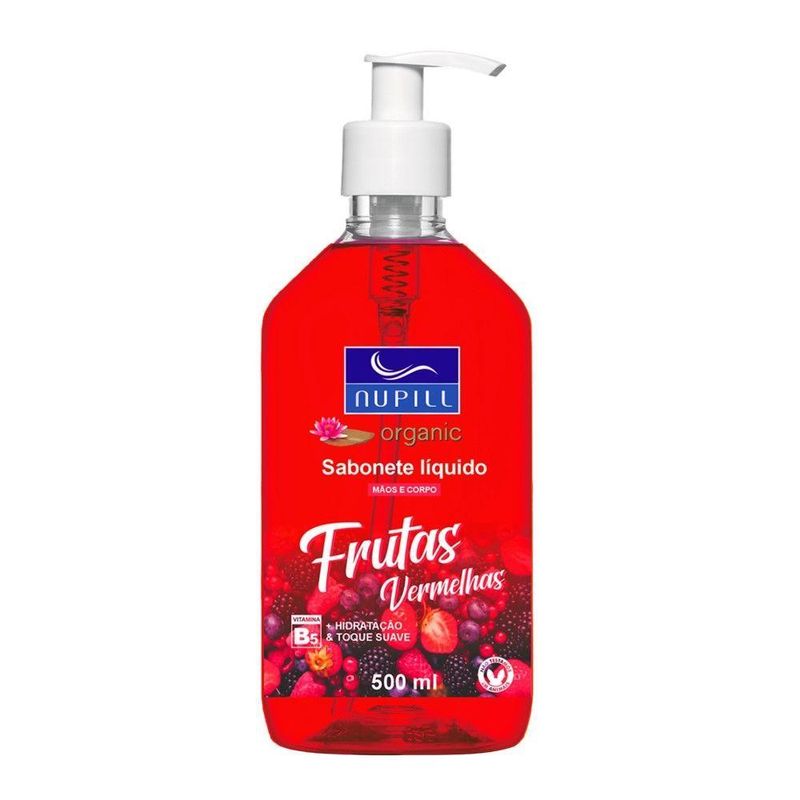 Sabonete Líquido Mãos E Corpo Frutas Vermelhas Nupill 500mlSabonete Líquido Mãos e Corpo Frutas Vermelhas Nupill 500mlSabonete líquido para higienização de mãos e corpo, formulado para remover impurezas e auxiliar na manutenção da barreira cutânea. A inclusão de extrato de frutas vermelhas na composição proporciona um aroma suave e contribui para uma sensação de pele agradável após a lavagem.Sua consistência permite a formação de espuma adequada com pouco volume de produto, otimizando o rendimento para uso contínuo. Apresentado em frasco de 500ml, o item dispõe de válvula dosadora que facilita a aplicação com uma única mão, permitindo o controle da quantidade liberada e minimizando o desperdício.Código: 127548Referência: 7898924487136Marca: NupillCapacidade: 500mlPeso: 400gCor: IncolorMaterial: LíquidoDimensões do produto (AxLxC): 17,00x9,00x9,00cmConteúdo da embalagem: 1 Sabonete Líquido 500ml