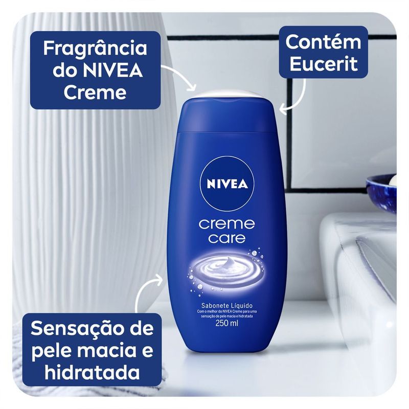 Sabonete Líquido Nivea Creme Care 250Ml O cuidado com você começa no banho. Tenha a experiência de carinho e cuidado de NIVEA Creme durante o banho. Deixe que este sabonete líquido, de textura leve, com ingredientes selecionados, envolva a sua pele com uma espuma suave, a fragrância única de NIVEA Creme e uma sensação de pele macia e hidratada. Sinta-se renovada em todos os banhos com o cuidado de NIVEA. - Em equilíbrio com o pH da pele - Ingredientes e fragrância únicos de NIVEA Creme - Espuma cremosa - Uso diário - Rende até 80 banhos - Dermatologicamente testado Testado com 3ml na esponja INDICAÇÃO Todos os tipos de Pele