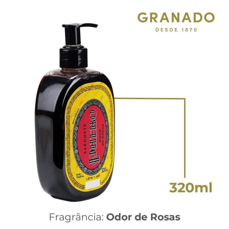 Sabonete Líquido Odor De Rosas Phebo Glicerina 320mSabonete Líquido Odor de Rosas Phebo Glicerina 320mDETALHES DO PRODUTONovo frasco com molde exclusivo e maior volumetria! Primeira fragrância da Perfumaria Phebo, criada na decada de 1930. Glicerina vegetal. Fragrâncias únicas e marcantes. Deixa a pele macia e perfumada. Fórmula biodegradável. Livre de parabenos e ingredientes de origem animal.Conteúdo: 320ml.Modo de usar:Aplique uma pequena quantidade do sabonete nas mãos ou pelo corpo. Enxágue em seguidaCódigo: 108318Referência: 7896512937919Marca: GranadoTamanho: 320mlCapacidade: 320mlPeso: 300gCor: IncolorMaterial: GlicerinaDimensões do produto (AxLxC): 5,50x7,50x13,50cmConteúdo da embalagem: 1 Sabonete líquido 320ml