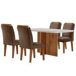 Sala De Jantar Mesa Olímpia 120cm Mdf Vidro Canto Copo Com 4 Cadeiras Athenas Moderna Marrom, Off White E ImbuiaPara voce que ama recepcionar sua familia e amigos, A Sala de jantar Olimpia com cadeiras Athenas e perfeita. O conjunto tem sua estrutura em MDF e acabamento em pintura UV, que proporcionam melhor durabilidade. A mesa possui o tampo com espaco ideal para organizar os itens necessarios em suas refeicoes. As cadeiras tem um design moderno, com assento e encosto estofados trazendo conforto para seu lar. Alem de Possuirem puxador na parte superior do encosto para facilitar a movimentacao e evitar o toque ao tecido. Caracteristicas: Contem vidro Tampo canto curvo Estrutura em MDF Acabamento em Pintura UV Assento e Encosto Estofado Dimensoes Mesa: Altura: 80 cm Largura: 120 cm Profundidade: 80 cm Dimensoes Cadeira: Altura: 102,5 cm Largura: 42 cm Profundidade: 56 cm Garantia do Fornecedor 3 meses Informacoes importantes : As tonalidades das cores podem sofrer alteracao de acordo com a configuracao de cada monitor. Os objetos que ambientam as fotos nao acompanham o produto. Nao disponibilizamos a montagem do produto. O produto acompanha manual de montagem. Nao nos responsabilizamos por danos no produto causados por montagem de qualquer outra forma que nao seja a descrita no manual. Verifique as dimensoes do produto e certifique-se que o percurso que ele fara ate o de uso permite sua passagem. Moderna Mobilia reserva o direito de alterar as especificacoes tecnicas sem previo aviso. As medidas contidas no site podem sofrer variacoes de acordo com a montagem, tipo de costura etc.