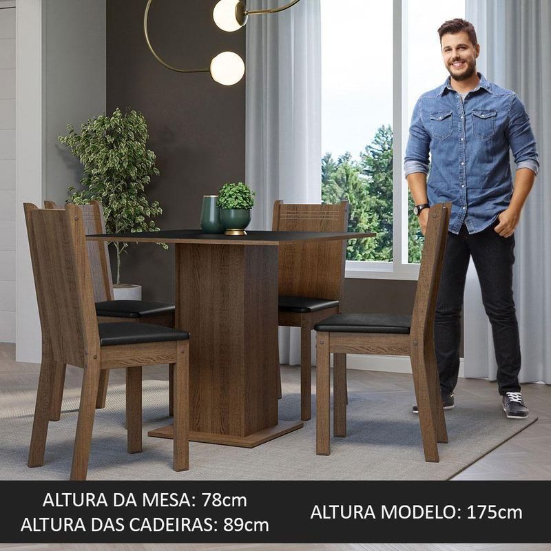Conjunto Sala De Jantar Mesa Tampo De Madeira 4 Cadeiras Rustic/preto Samara Madesa Rustic/preto/sintético Preto O Conjunto de Jantar Samara da Madesa é perfeito para dar um toque prático, moderno e elegante à sua cozinha ou sala de jantar.A mesa possui uma base em pedestal com tampo em MDP, garantindo firmeza e ótimo espaço para as refeições.As cadeiras são feitas com estrutura em MDF/MDP e o assento é estofado em material Sintético Preto, que possui toque suave e macio, proporcionando máximo conforto.Para completar, o acabamento combina os tons preto e Amadeirado Rustic, feito em Pintura Poliéster de alta resistência, com sete camadas que protegem e aumentam a vida útil do móvel.Medidas da cadeira:- 89 cm de altura- 37 cm de largura- 44 cm de profundidadeMedidas da mesa:- 78 cm de altura- 90 cm de largura- 90 cm de profundidadeItens inclusos:- Uma (1) Mesa quadrada com tampo em MDP- Quatro (4) Cadeiras com assento estofadoCódigo do produto: MDJA0401577KPTObs.:- As imagens são meramente ilustrativas. O conjunto é composto pela mesa e quatro cadeiras.- A Madesa não disponibiliza serviço de montagem- O produto segue com manual e todas as ferragens necessárias para a montagem1 – O produto vem montado? Se não, vocês realizam a montagem?R.: A Madesa não disponibiliza serviço de montagem. Todos os produtos seguem com manual de instalação e as ferragens necessárias. Alguns produtos possuem vídeo explicando o passo a passo da montagem.2 – Vocês possuem loja física? Posso retirar meu produto em mãos?R.: Não possuímos loja física, apenas loja virtual. Confira as opções de envio ao colocar o seu CEP.3 – Qual é o valor do envio? Posso pagar separadamente?R.: O valor do envio é calculado com base no peso e volume do produto, e no CEP de destino. Você pode calcular o valor e prazo de entrega no simulador.4 – A Madesa entrega em todo Brasil? Como é feita a entrega?R.: Sim, entregamos no Brasil inteiro através de transportadoras parceiras.5 – Os produtos possuem garantia?R.: Sim. A Madesa oferece 3 meses de garantia para defeitos de fabricação. Cor: Marrom | Garantia: 3 meses contra defeitos de fabricação | Dimensões - Altura: 78 cm | Dimensões - Largura: 90 cm | Dimensões - Profundidade: 90 cm | Peso aproximado: 36 kg | Quantidade de Lugares: 4 lugares | Produto: Conjunto Sala de Jantar | Marca: Madesa | RBN: Casa/Móveis/Móveis para Sala de Jantar/Conjuntos para Sala de Jantar | Material: MDP/MDF | Material para Filtro: MDP/MDF | Estado de Origem: RS | Conteúdo da embalagem: 1 Conjunto de Jantar | Instruções/Cuidados: Utilize um pano limpo, levemente umedecido e seque em seguida a superfície. Não usar produtos químicos ou abrasivos para a limpeza. Recomendamos polir seu móvel com lustra-móveis duas a três vezes por ano. | Nome do Simples no Fornecedor: Conjunto Sala de Jantar Mesa Tampo de Madeira 4 Cadeiras Rustic/Preto Samara Madesa | Produto precisa de Montagem?: Sim, sugerimos a contratação do nosso serviço de montagem (para os CEPs em que o serviço está disponível) ou de algum profissional experiente de sua preferência | Descrição do Tamanho: 78 cm x 90 cm x 90 cm | Comprimento Produto Com Embalagem (cm): 109,5 | Largura Produto Com Embalagem (cm): 91,3 | Altura do Produto com Embalagem (cm): 32,2 | Peso Produto Com Embalagem (Kg): 36,5 | Fabricante: Madesa | Contato do Fabricante: contato@madesa.com | Formato da Mesa: Quadrada Cor: Rustic/Preto/Sintético Preto