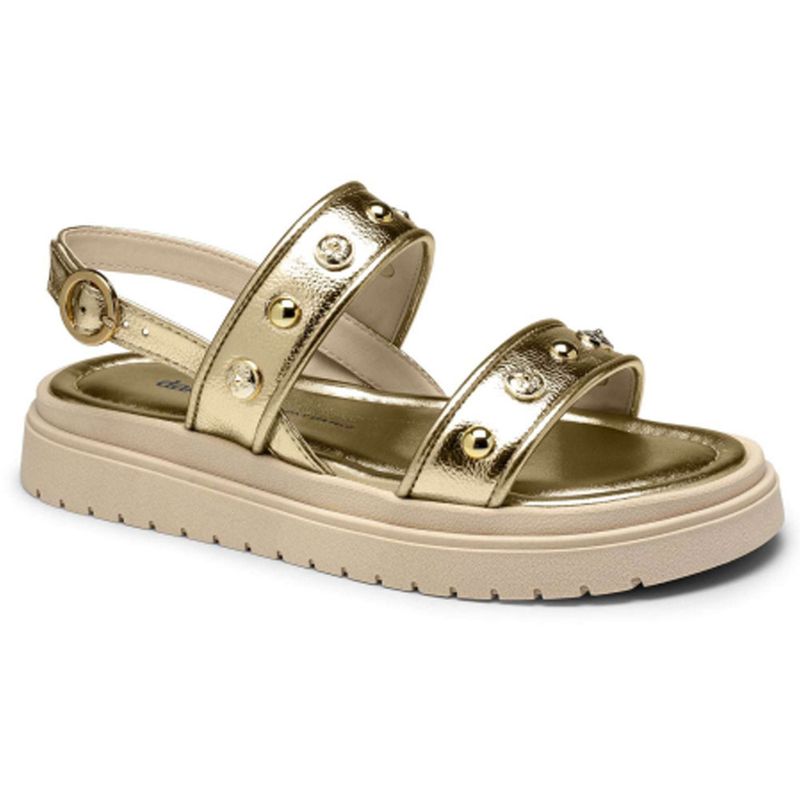 Sandália Feminina Flatform Namaste Champagne Dakota Y8131-0003 A Sandália Dakota Flatform da coleção Primavera/Verão é a escolha perfeita para quem busca um calçado moderno e confortável. Com sua sola robusta e macia de 3,5 cm, ela proporciona um caminhar leve e seguro, ideal para o dia a dia. O design minimalista, com detalhes metalizados, confere um toque de sofisticação e elegância ao modelo. A fivela ajustável no tornozelo garante um ajuste perfeito aos pés, proporcionando maior segurança e conforto. Já as aplicações metalizadas nas tiras sobre o pé adicionam um toque de personalidade e complementam o design clean da sandália.