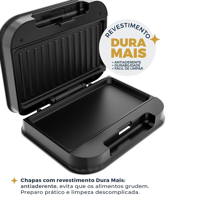 Prepare-se para saborear refeições deliciosas e rápidas com a Sanduicheira e Grill Britânia 2 em 1 750W BGR25B! Que tal começar o seu dia com um café da manhã completo e saboroso, um pão quentinho e crocante, ou preparar um lanche rápido e nutritivo para a família. Seja para preparar sanduíches irresistíveis, grelhar carnes, legumes ou até mesmo fazer um delicioso misto-quente, a Britânia 2 em 1 é a sua aliada na cozinha. Com 750W de potência, ela garante que seus alimentos sejam preparados no ponto certo, com rapidez e praticidade. O revestimento antiaderente Dura Mais, deixa a limpeza fácil e rápida, te dando mais tempo para aproveitar o que realmente importa: momentos deliciosos em família. Além disso, o seu acabamento em inox confere um toque moderno à sua cozinha, enquanto as chapas mais profundas permitem preparar uma variedade ainda maior de pratos. Não perca mais tempo na cozinha! Adquira agora a sua Sanduicheira e Grill Britânia 2 em 1 e experimente a praticidade e o sabor de refeições caseiras e deliciosas. • Revestimento antiaderente • Potência: 750W • Dimensional da chapa: 238 x 130 mm • Trava de fechamento das placas • Base antiderrapante • Alça • Luz indicadora de Funcionamento: vermelha • Tipo de chapa: Superior Grill / Inferior Lisa • Suporte para armazenar o cordão • Luz indicadora de Aquecimento : verde.