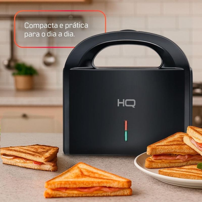Sanduicheira E Grill HQ 750W Antiaderente Preto HQ-SG004 220VSanduicheira e Grill HQ 750W Antiaderente Preto HQ-SG004Praticidade no preparo. Sabor em cada detalhe.Seja no café da manhã corrido, na hora do lanche da criançada ou no preparo daquele grelhado rápido à noite, a Sanduicheira e Grill HQ-SG004 tudo o que o você precisa: facilidade, economia de tempo e muito sabor, com a confiança de um produto feito para durar.Compacta por fora, potente por dentro, ela traz 750W de potência, chapas com revestimento antiaderente durável, controle automático de temperatura e um sistema de sinalização luminosa inteligente que indica o momento certo para usar.Com ela o preparo é de forma prática e segura desde aquele misto quente bem prensado até hambúrguer, legumes e grelhados leves. Tudo isso com controle automático de temperatura, sem queimar, sem grudar e sem complicação. E o melhor: é fácil de guardar, fácil de limpar e ainda te ajuda a economizar tempo e energia.750W de potênciaGrelha rápido, aquece por igual e sabor de verdade.Chapas com acabamento grill e antiaderenteVisual bonito e limpeza rápida.Sinalização luminosa inteligenteLuz vermelha (ligado) e verde (pronto para uso).Trava de e base estávelMais firmeza, menos risco.Compacta e leveCabe em qualquer cozinha, até nas menores.Consumo conscienteEstrutura com materiais recicláveis e manual com orientações de descarte responsável.HQ Para todos os momentosPrática, compacta e segura, a Sanduicheira HQ-SG004 foi feita para acompanhar sua rotina, facilitar o preparo das refeições e deixar cada momento à mesa ainda mais especial.Especificações TécnicasModelo: HQ-SG004Cor: PretoPotência: 750WTensão: Não é bivoltFrequência: 60HzControle de Temperatura: AutomáticoRevestimento das Chapas: AntiaderenteIndicadores Luminosos: Sim – vermelho (ligado) / verde (pronto)Trava de : SimDimensões e Peso do ProdutoAltura: 8 cmLargura: 21,4 cmProfundidade: 20,6 cmPeso: 1,0 kgGarantia01 Ano (Sendo 3 meses de garantia legal e mais 9 meses de garantia para de fabricação)
