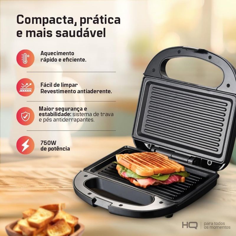 Sanduicheira Grill Elétrico HQ 750W Antiaderente Preto HQ-SG003 - 110VSe você gosta de praticidade e rapidez, a Sanduicheira HQ-SG003 é perfeita para o seu dia a dia. Compacta, com 750W de potência, ela prepara sanduíches deliciosos em poucos minutos, sem complicação. Seja para um lanche rápido ou uma refeição prática, essa sanduicheira vai te acompanhar em todos os momentos, com a qualidade que só a HQ oferece.Principais Características:Compacta e Potente: 750W para sanduíches rápidos.Trava de : Mais estabilidade durante o uso.Fácil Limpeza: Revestimento antiaderente para uma limpeza sem esforço.Luz Indicadora: Sinaliza o momento ideal para o uso.Especificações Técnicas:Dimensões A x L x P (cm): 8,5x 22,1x 22Peso (kg): 1,3Cor: PretaFrequência: 60HzPotência (W): 750WTrava de : SimPés Antiderrapantes: SimLuz Indicadora de Funcionamento: SimModelo: HQ-SG003Garantia: 12 Meses (3 meses de garantia legal e 9 meses de garantia para de fabricação).