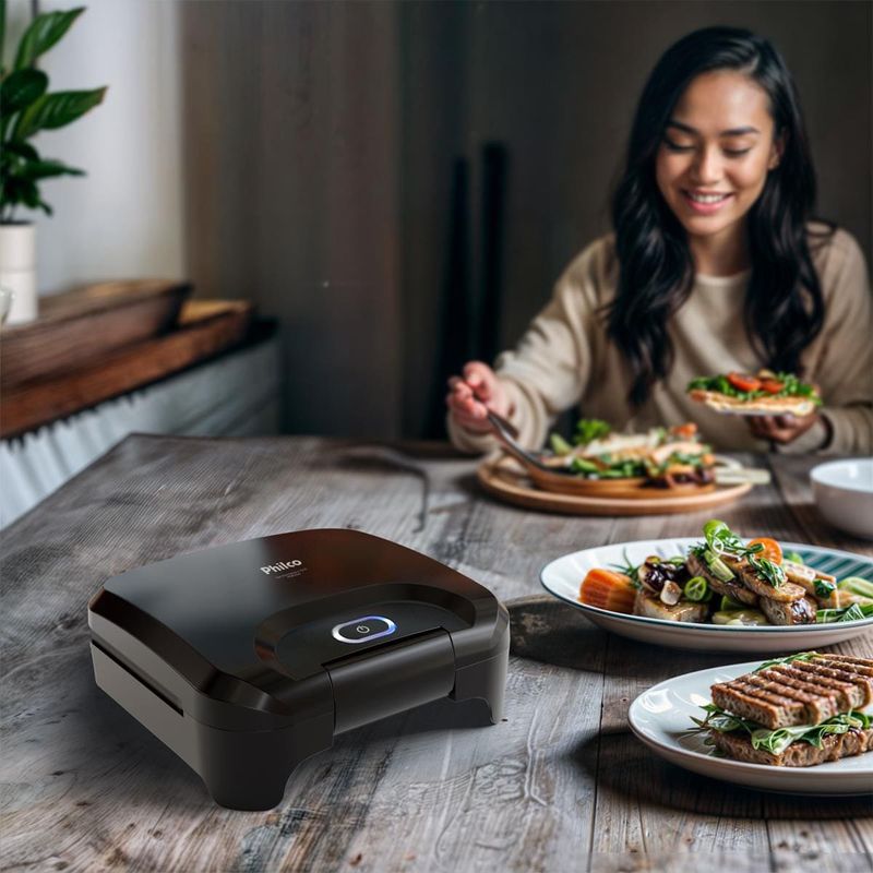 A Sanduicheira Grill PGR25A da Philco é perfeita para preparar lanches rápidos com praticidade e segurança. Com design compacto e acabamento preto, ela combina funcionalidade e estilo. Possui revestimento antiaderente, garantindo que os alimentos não grudem e facilitando a limpeza. A potência de 750W assegura aquecimento rápido e eficiente. Conta com luz indicadora de funcionamento e aquecimento, trava de fechamento das placas e base antiderrapante para maior estabilidade. Além disso, possui suporte para armazenar o cordão, tornando o uso ainda mais prático. Ideal para preparar sanduíches, grelhar pães e aquecer alimentos com rapidez e segurança. Potência de 750W para aquecimento rápido Revestimento antiaderente para fácil limpeza Luz indicadora de funcionamento e aquecimento Trava de fechamento das placas Base antiderrapante para maior segurança Suporte para armazenar o cordão Que tal combinar essa sanduicheira com um super Aparelho de Jantar? Aproveite agora mesmo!