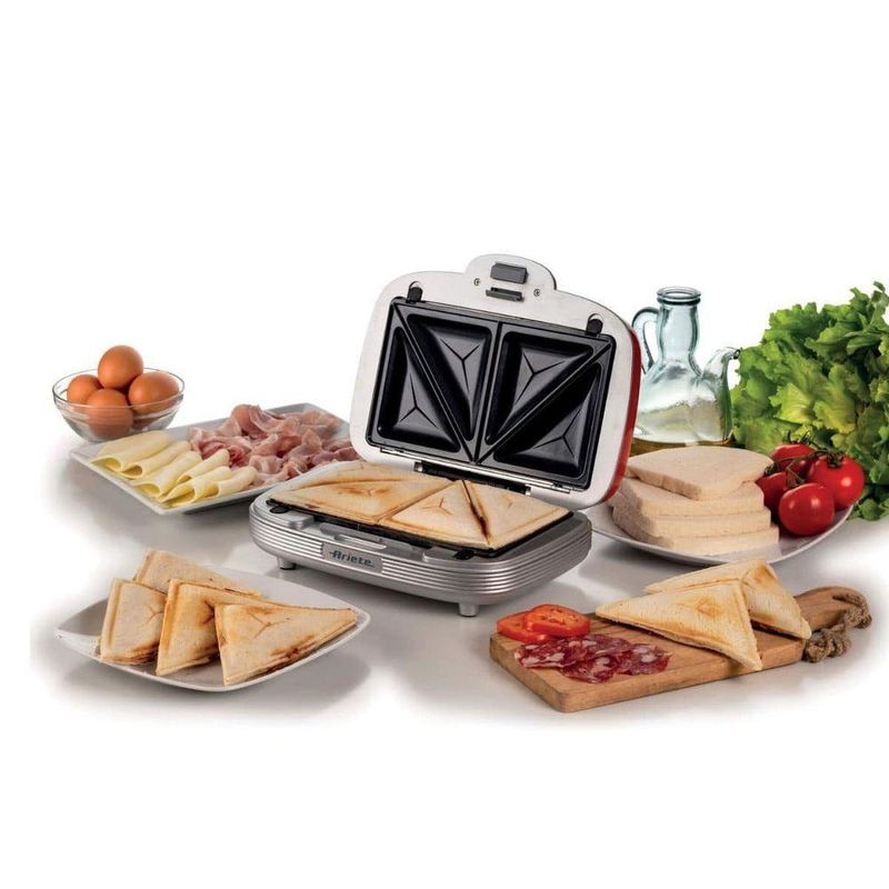 Sanduicheira Multifuncional Retrô Party Time 127v Ariete VermelhaA Sanduicheira Multifuncional Retrô é o produto que não pode faltar na sua cozinha, com seu design lindo e atemporal, permite que você faça diversas receitas em casa com o melhor que a qualidade Ariete pode te oferecer.Especificações do Produto:- Multifuncional: prepare sanduiches, muffins, cookies e donuts em um mesmo produto- 3 placas antiaderentes e variadas de fácil limpeza- Ideal para festa, lanches ou um dia especial- Estilo retrô divertido e ao mesmo tempo eleganteFicha Técnica:- Código: 4083190009- Marca: Ariete- Modelo: Retrô/Party Time- Conteúdo da Embalagem: 1 Sanduicheira Multifuncional e 3 Placas Antiaderentes- Material: Metal- Voltagem: 127V- Potência: 700W- Cor: Vermelho e Branco- Peso: 2,75kg- Dimensões: 11cm x 27cm x 22cm (AxLxP)- Garantia: 1 Ano- Certificação Inmetro:- BRSC230100011201 (09/03/2023)- BRSC230100010701 (10/02/2023)- BRSC230100010601 (28/02/2023)- BRSC230500048701 (05/06/2023)Altura - 11cmLargura - 27cmProfundidade - 22cmPeso - 2,75kgSobre a Marca - A marca italiana Ariete, fundada em 1964, tem sede na Toscana e é conhecida pela criatividade e inovação. O seu sucesso reside em produtos diferenciados e concebidos de forma criativa, apoiados por investimentos significativos em pesquisa e desenvolvimento. A Ariete oferece uma linha de produtos que inclui liquidificadores, sanduicheiras, raladores elétricos, aparelhos de limpeza e muito mais. A marca agora se expande para o Brasil com produtos renovados e pensados para o mercado brasileiro, mantendo a qualidade europeia.