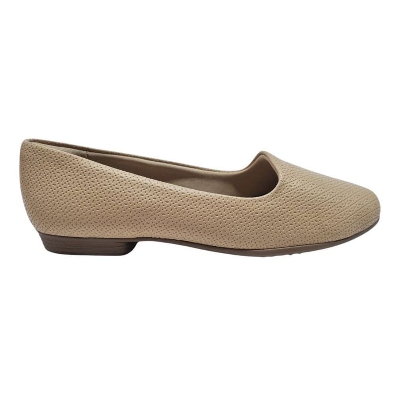 Descrição:Charmosa e atemporal, a Sapatilha Raquel Salto Baixo une elegância e praticidade para o ambiente de trabalho. Leve e flexível, ela oferece um acabamento superconfortável com espuma macia no calcanhar, forro suave e solado superaderente, garantindo conforto durante longos períodos de pé e complementando seu traje com sofisticação. INFORMAÇÕES TÉCNICAS: Cor: Nude Material: Sintético Altura do Salto: Salto Baixo (1,5 cm) Forro: Têxtil