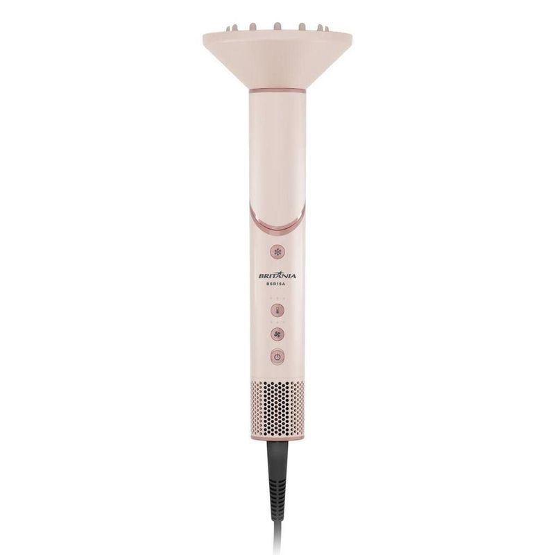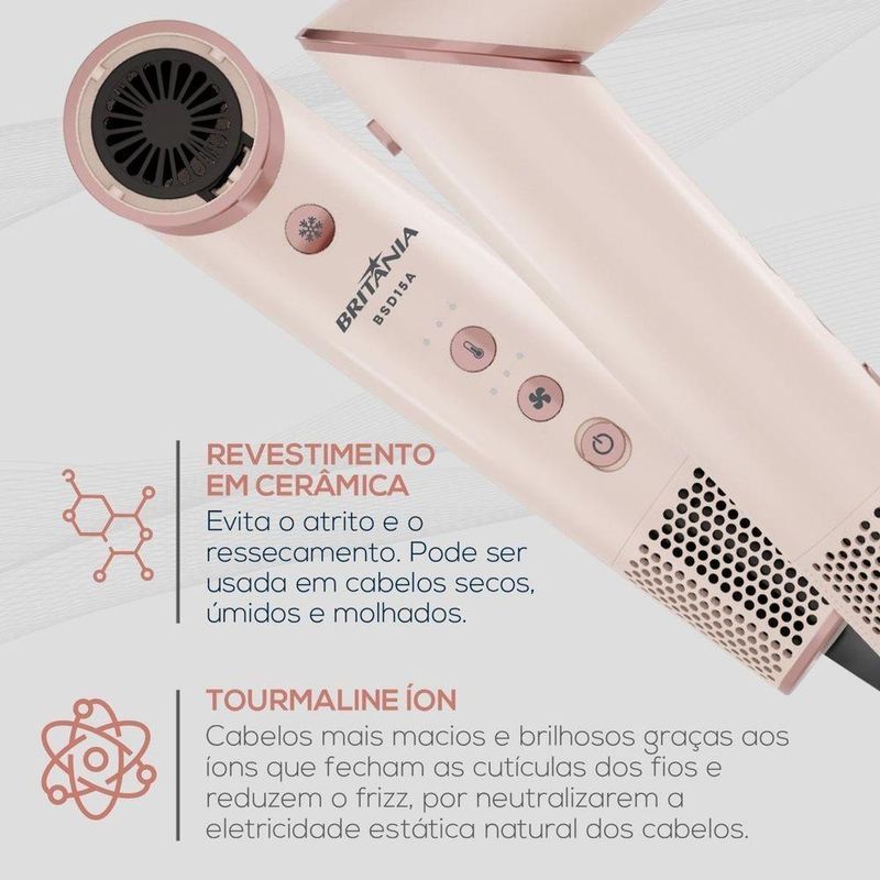 Secador De Cabelo Britânia Motor BLDC 1450W BSD15A 110VO Secador de Cabelo Britânia BSD15A foi desenvolvido para oferecer alta performance, versatilidade e cuidado com os fios.Equipado com motor BLDC Turbo de alta rotação e potência de 1450W, ele garante uma secagem rápida, eficiente e mais silenciosa, preservando a saúde dos cabelos e proporcionando resultados profissionais no dia a dia.Esse Secador de Cabelo Britânia acompanha acessórios completos para atender todos os tipos de cabelo e estilos. O concentrador de ar, também conhecido como bico direcionador, direciona o ar para uma secagem precisa, enquanto o difusor realça cachos e ondas naturais. Os dois cacheadores, direito e esquerdo, utilizam tecnologia de sucção para criar cachos perfeitos com facilidade. A escova secadora oval permite alisar, modelar e dar volume com praticidade, e a beauty bag facilita o transporte com proteção.Com tecnologia Silence Turbo, tourmaline íon para redução do frizz e estrutura leve com corpo dobrável, o manuseio é confortável em qualquer função. São 4 temperaturas, 3 velocidades e jato de ar frio, oferecendo até nove combinações para modelar, dar brilho e acabamento aos fios, além de cabo de 1,8m que garante liberdade de movimento.Para cabelos perfeitos todos os dias, conte com o Secador de Cabelo Britânia BSD15A!Motor BLDC Turbo de alta rotaçãoAcessórios versáteis: bocal concentrador, 2 cacheadores, escova secadora, bolsa para transporteTecnologia Silence Turbo4 temperaturas, 3 velocidades + jato de ar frioTourmaline ÍonEscova com Tecnologia MulticerdasCabo de 1,8mObservação: Somente faturamos para o nosso consumidor final, ou seja, não faturamos pedidos para CNPJ por este portal de vendas.Especificações TécnicasMarca: BritâniaModelo: BSD15ACor: Rosa RosêPotência (W): 1450WComprimento do cordão elétrico (m): 1,80mConsumo (kW/h): 1,45Níveis de velocidade: 3Níveis de temperaturas: 3Características do Produto: Libera Íons Jato de Ar Frio Grade Traseira Removível Cabo GiratórioAcessórios: Cacheadores Escovas Difusor Concentrador Bolsa de transporteGarantia (Dias): 360