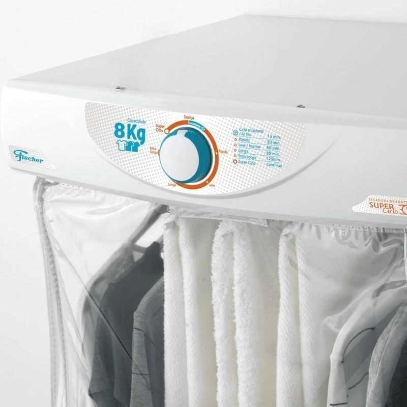 Secadora De Parede Fischer Super Ciclo 8 Kg Com Timer Contínuo Branco 127VCuidar das suas roupas nunca foi tão fácil! Com a Secadora De Roupas Fischer Super Ciclo você seca até 8kg de roupas com muita praticidade.Com a maior câmara de secagem da categoria, a Secadora De Roupas Fischer Super Ciclo 8kg com Timer Contínuo possui timer de até 120 minutos. Conta com temperatura máxima de 65°C, ciclo amaciante, acompanha 3 varais fixos e 6 cabides. Disponível nas cores Branco, Preto e Prata.Possui frontal em termoplástico com indicações dos tempos de secagem, corpo externo em aço, Bag em PVC cristal e fechamento por zíper e velcro, proporciona beleza e praticidade para seu dia a dia.Especificações TécnicasCor: Branco Voltagem: 127VBotões removíveis: NãoInstalação gratuita: NãoConsumo: 1,15kWh (220V) | 1,45kWh (127V)Potência do motor: 38,7W (220V)| 52,5W (127V)Timer: Timer com ciclo máximo de 120 min (2h)Potência: 127V: 1450W | 220V 1150WNíveis de Potência: 127V 1450W | 220V 1150WVazão: 5,0m/sCapacidade de roupas úmidas: 8kgCabides: 6Varais: 3Câmara de secagem: Bag em PVC cristalAbertura: ZiperMedidas do Produto em cmSem Embalagem:Altura x largura x Profundidade x peso: 96 cmc x 47 cmc x 51 cmPeso: 5,50Com EmbalagemAltura x largura x Profundidade x peso: 53,5 cm x 50 cm x 21,5 cmPeso: 6,25EAN: 127V 7896513319646|220V 7896513319653Garantia 1 ano Secadora de Parede Fischer Super Ciclo 8 Kg com Timer ContÃnuo