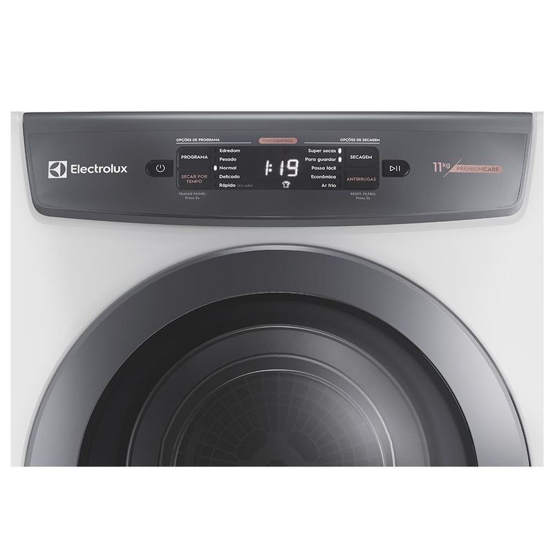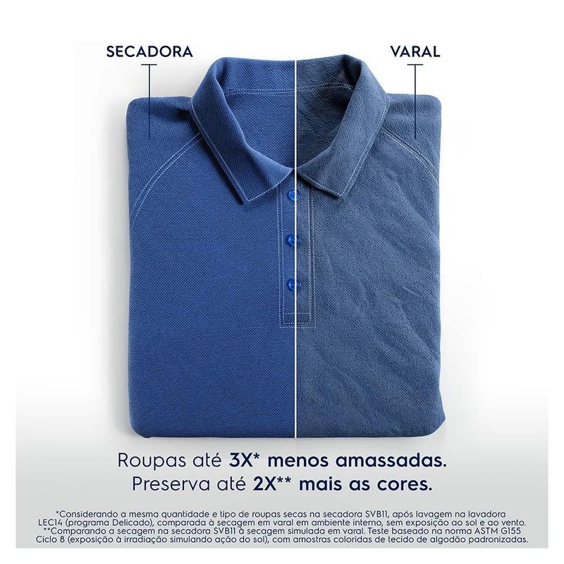 Painel digital com Time ControlDesign moderno que permite selecionar os programas desejados com um só toque. Visualize o tempo de duração de cada ciclo e quanto tempo resta para concluí-lo por meio do Time Control.Flexibilidade de instalaçãoSe adapta ao espaço de sua casa, já que pode ser instalada no piso e até mesmo na parede, permitindo que você leve suas roupas da máquina de lavar para a secadora com mais ergonomia.Ganhe agilidade na secagem, especialmente em dias chuvososSeca os tecidos até 12 vezes¹ mais rápido frente à secagem em varal, garantindo que você tenha suas roupas à disposição em menos tempo. Também garante seus edredons de casal ou solteiro secos até 4,5 vezes² mais rápido¹Considerando a mesma quantidade e tipo de roupas secas na secadora SVB11, após lavagem na lavadora LEC14, comparada à secagem em varal em ambiente interno, sem exposição ao sol e ao vento. ²Comparando a secagem de edredom de casal (2,10m x 2,40m) na secadora SVB11 , à secagem em varal em ambiente interno, sem exposição ao sol e ao vento. Reduz em até 3x o amassamento das roupas após a secagem³, facilitando o seu dia a dia.³Considerando a mesma quantidade e tipo de roupas secas na secadora SVB11, após lavagem na lavadora LEC14 (programa Delicado), comparada à secagem em varal em ambiente interno, sem exposição ao sol e ao vento.Selecione o tempo desejado para o seu ciclo de secagem. São 6 opções para escolher aquela que se adaptar melhor a sua necessidade: 15min / 30min / 45min / 60 min / 90min / 120 min.Cores vibrantes por mais tempo: Preserva até 2 vezes* mais as cores dos tecidos, cuidando de suas roupas preferidas para que fiquem como novas.*Comparando a secagem na secadora SVB11 à secagem simulada em varal. Teste baseado na norma ASTM G155 Ciclo 8 (exposição à irradiação simulando ação do sol), com amostras coloridas de tecido de algodão padronizadas.Filtro pega fiapos triplo: O filtro interno retém até 86%** dos fiapos. Para um cuidado extra, a secadora conta com um filtro externo na entrada de ar e evita que o pó e outras impurezas trazidas pela recirculação do ar incorporem no tecido durante a secagem.**: Comparando a mesma quantidade de roupas de diferentes tecidos secas na secadora SVB11 à secagem em varal em ambiente interno, sem exposição ao sol e ao vento. Resultado pode variar conforme tipo de tecido.Além dos programas e opções de secagem, possui a função antirrugas, trava painel, aviso de limpeza do filtro fiapos, painel digital com visualização do tempo de secagem.Além dos programas e opções de secagem, possui a função antirrugas, trava painel, aviso de limpeza do filtro fiapos, painel digital com visualização do tempo de secagem.CaracterísticasTipo: SecadoraCapacidade de Secagem: 11 KgProgramas de Secagem: SimAbertura: Front LoadPainel: DigitalFiltro Elimina FiaposAcabamento do cesto: InoxVisualizador das Etapas de LavagemTimer Sistema AntirrugasFuncionamento: ElétricaEspecificações TécnicasModelo: SVB11Selo Procel (Eficiência Energética): AConsumo de Energia kwh/mês: 4.5 (Kw/ciclo)Cor: BrancoVoltagem: 110V / 220V (não é bivolt) EAN: 7909569458228 (110V) / 7909569458235 (220V)Garantia: 12 mesesDimensões e PesoDimensões do Produto sem Embalagem (AxLxP): 68x60x56,5 mmDimensões do Produto com Embalagem (AxLxP): 76x65,5x58,5 mmPeso do Produto sem Embalagem: 25 KgPeso do Produto com Embalagem: 28 KgItens Inclusos01 Secadora01 ManualServiço de Instalação e Orientação de UsoPara sua comodidade e segurança, a Fast Shop dispõe do serviço de Instalação e Orientação de Uso*. Agendamos o serviço para você, executamos a instalação com equipes próprias especializadas e autorizadas pelo fabricante, ensinamos como utilizar os produtos da melhor forma e temos uma área de qualidade para acompanhar e garantir que tudo dê certo. É rápido e fácil. Você pode contratar o serviço com o nosso canal Blá pelo WhatsApp no número (11) 3232-2949 ou em uma de nossas lojas. Consulte os valores e regiões atendidas.