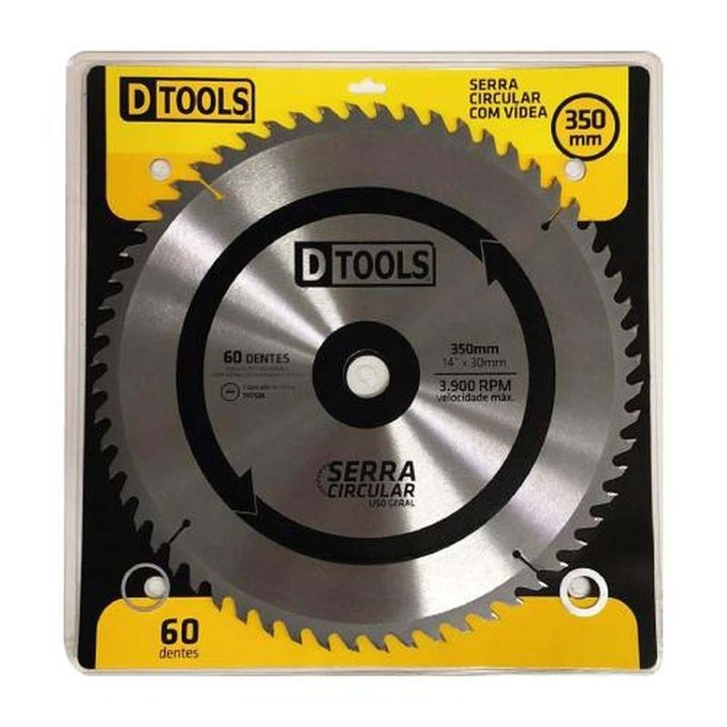 Serra Circular 14'' 60 Dentes Vídea Para Madeira - Dtools 350mmSerra Circular 14'' 60 Dentes Vídea para Madeira - DTOOLS 350mm -Serra Circular com Vídea 14'' 60 Dentes - DTOOLSA Serra Circular com Vídea 14'' 60 Dentes da DTOOLS é a ferramenta perfeita para quem busca precisão e eficiência em seus projetos de marcenaria. Com um diâmetro de 350mm e 60 dentes de ponta de metal duro, essa serra garante cortes limpos e precisos em todos os tipos de madeira.Seja para cortes rápidos ou para acabamentos mais detalhados, essa serra circular é a escolha ideal. Sua velocidade máxima de 3.900 RPM garante um trabalho rápido e eficiente, sem abrir mão da qualidade e precisão.Com a Serra Circular com Vídea 14'' 60 Dentes da DTOOLS, você terá em mãos uma ferramenta de alta qualidade, durabilidade e desempenho excepcionais. Invista em um produto que irá facilitar o seu trabalho e elevar o nível dos seus projetos de marcenaria.* Diâmetro: 350mm* 60 dentes de ponta de metal duro* Diâmetro do centro: 30mm* Velocidade máxima: 3.900 RPM* Material de trabalho: todos os tipos de madeira* Corte rápido e de terminação aceitávelNão perca mais tempo e adquira agora mesmo a Serra Circular com Vídea 14'' 60 Dentes da DTOOLS Universo do Lar e eleve a qualidade dos seus projetos de marcenaria! --------Descrição Original enviada pelo Fornecedor:SERRA CIRCULAR COM VÍDEA 14'' 60 DENTES - DTOOLSDiâmetro 350mm60 dentesPonta de metal duroDiâmetro do centro 30mmVelocidade máxima: 3.900 RPMMaterial de trabalho: todos os tipos de madeiraCorte rápido e de terminação aceitávelCaracterísticas Gerais do Produto:Garantia: - 3 meses