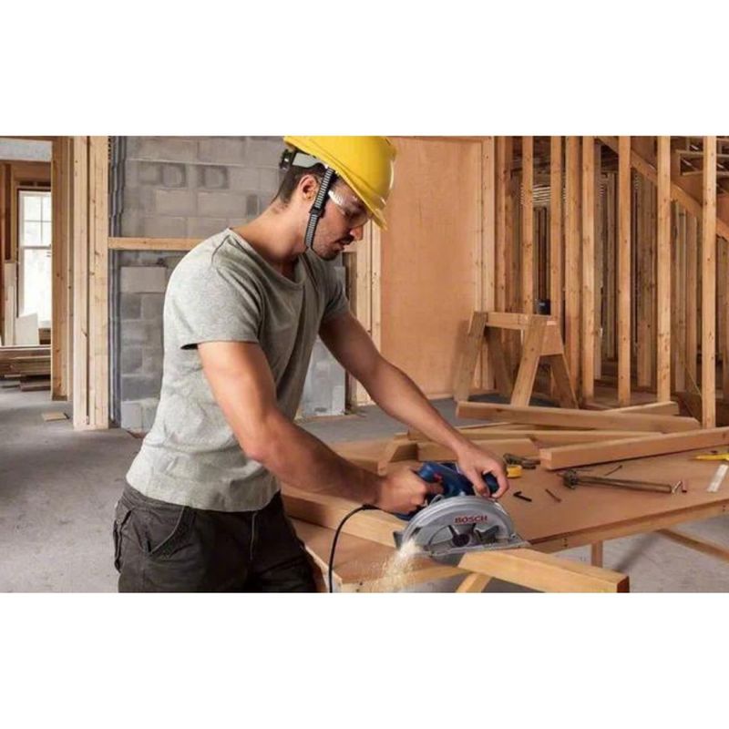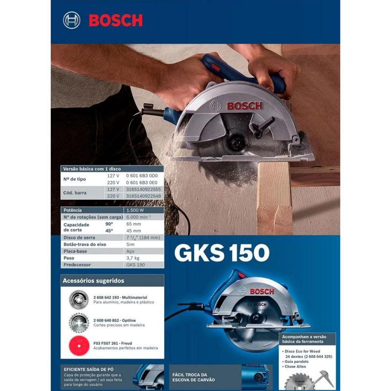 Serra Circular GKS 150 STD 1500W Bosh 220 volts Serra Circular Manual Alto desempenho e resistência para cortes brutos . A Serra Circular Bosch GKS 150, com 1500W de potência, é ideal para as principais aplicações e com um preço que cabe no seu bolso. Conta com recurso contra travamento para maior segurança, além de punho auxiliar robusto que garante maior estabilidade durante o corte. O pó fica longe do usuário graças a sua saída de pó eficiente. As escovas de carvão são facilmente acessadas, fazendo com que sua troca seja simples e fácil. Agora com 1500 W e o melhor preço. Potência ideal para as principais aplicações. Recurso contra travamento garante maior proteção ao usuário. Robusto punho auxiliar para maior estabilidade durante o corte. Eficiente saída de pó para longe do usuário. Uso profissional com 1 ano de garantia. 220 Volts Dados Técnicos Potência nominal absorvida 1.500 W Diâmetro do disco de serra 184 mm Nº de rotações em vazio 6.000 r.p.m. Peso 3,7 kg Diâmetro interior do furo do disco de serra 20 mm Placa de guia 290 x 150 mm Dimensões da ferramenta (largura) 232 mm Dimensões da ferramenta (comprimento) 347 mm Dimensões da ferramenta (altura) 257 mm