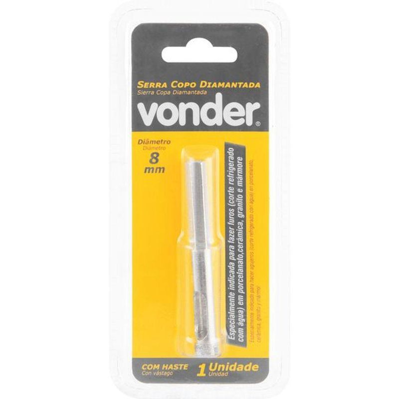 Serra Copo 8mm Diamantada Refrigerada - VonderRef. Fornecedor:3617000008Conteúdo da Embalagem:1 Serra copo diamantada refrigerada com hasteAplicações e dicas de uso:Especialmente indicada para fazer furos (corte refrigerado com Água) em porcelanato, cerâmica, granito e mármore. Rotação máxima (rpm): 2.400/min.Destaques e diferenciais:Possui corpo reforçado em aço, aresta de corte com revestimento diamantado e haste sextavadaDetalhes Técnicos:Diâmetro da serra copo: 8 mm Altura útil aproximada da serra copo: 35 mm Altura da camada de diamante: 4,0 mm Diâmetro da haste: 6,3 mm Diâmetro do encaixe da haste: N/A Comprimento total da haste: 30 mm Material da serra copo: Corpo em aço carbono e ponta diamantadaGarantia:Garantia legal: 90 dias Produto: Serra